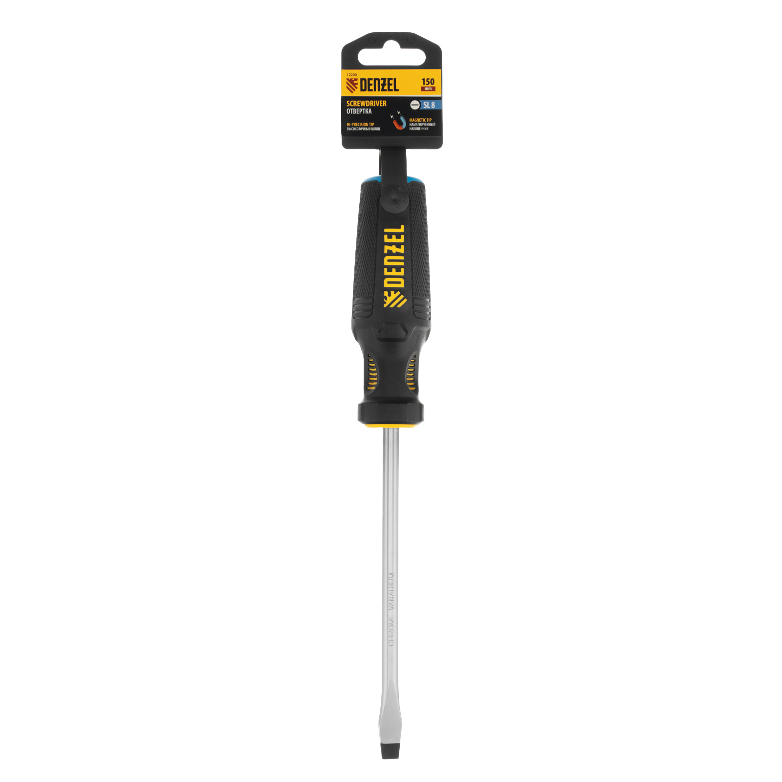 Отвертка SL8 х 150 мм Denzel 12200 из стали CrV, с трехкомпонентной рукояткой, используется для монтажа и демонтажа винтов и саморезов с прямым шлицем Slotted. Намагниченный шлиц крепко фиксируется в головке крепежа. Отвертка выдерживает интенсивное применение и предназначена для выполнения профессиональных ремонтных и монтажных работ.