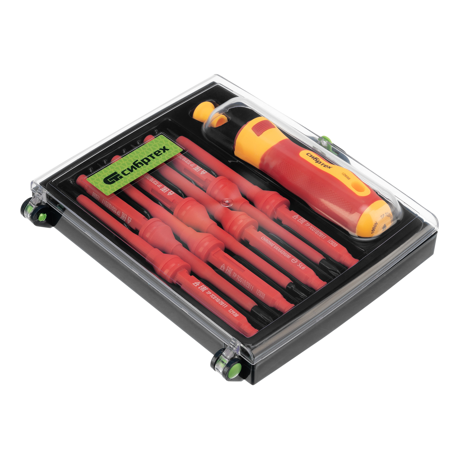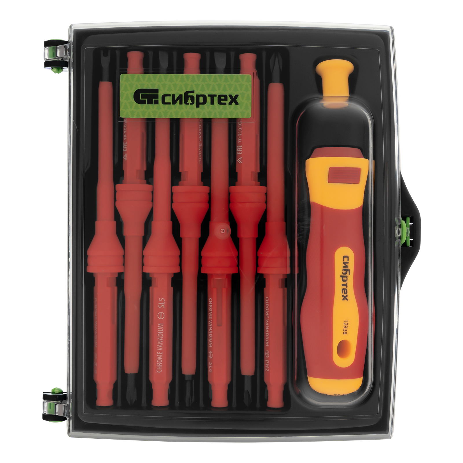Диэлектрическая отвертка до 1000 В Сибртех 12938 состоит из 9 предметов: рукоятки и со сменных жал SL, PH, TR, TW, SPAN с изолирующим покрытием. Полупрофессиональный набор используется для проведения ремонтных работ. Подходит для монтажа и демонтажа глубоко расположенного крепежа.