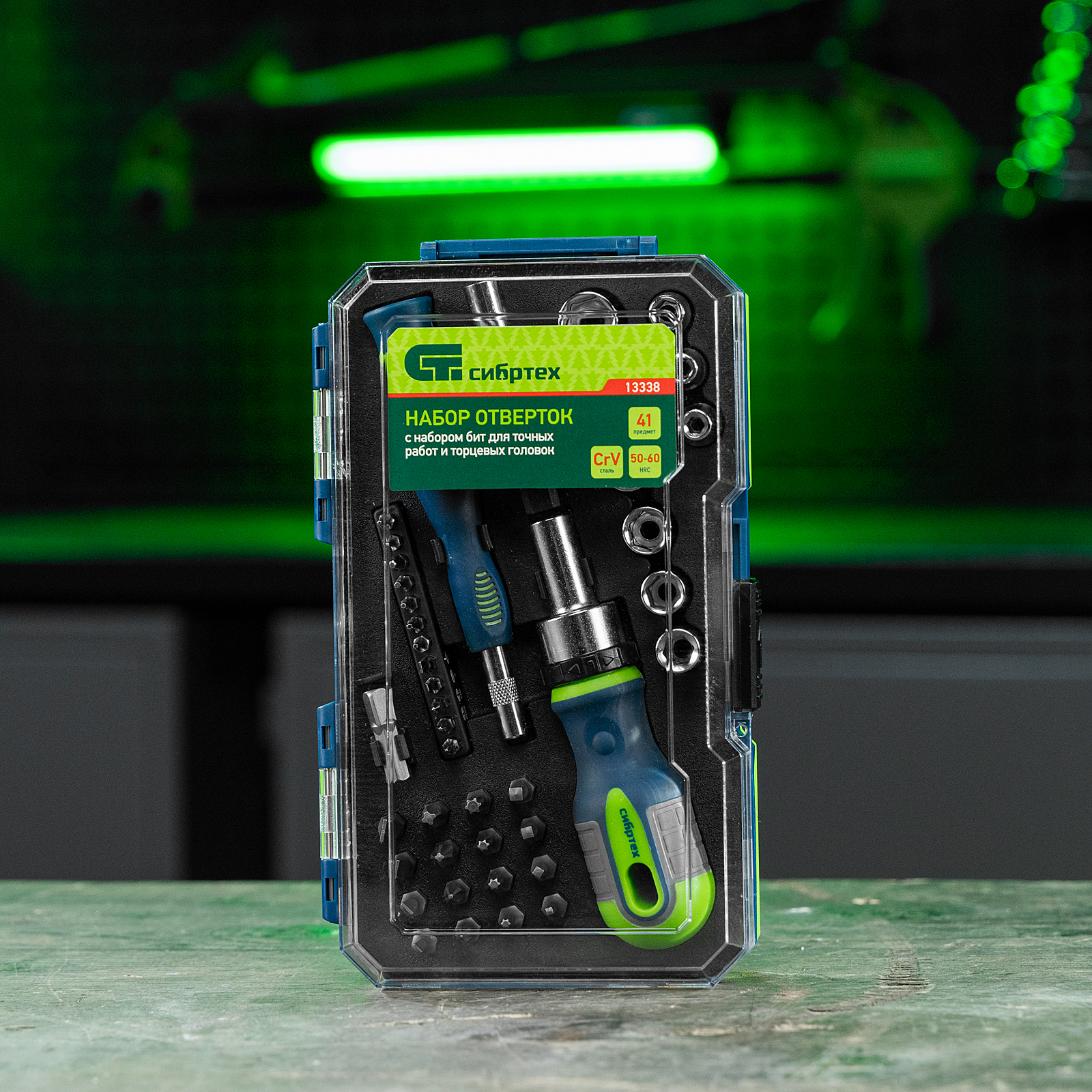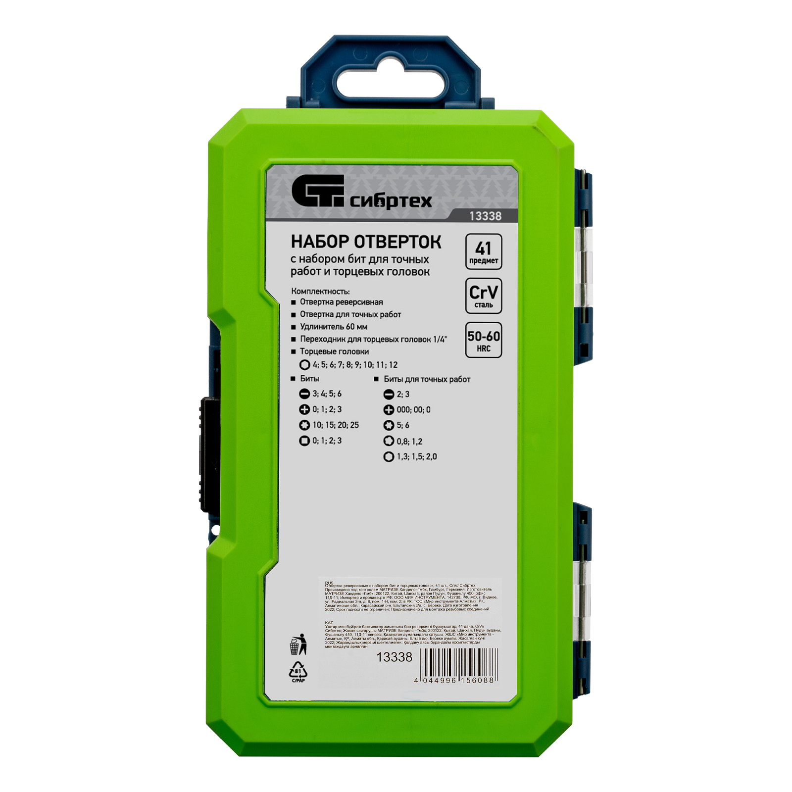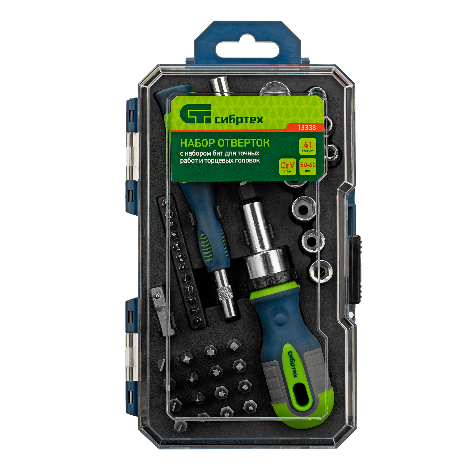 <p>Реверсивные отвертки с набором бит и торцевых головок Сибртех 13338 — комплект из 41 предмета из стали CrV, включающий насадки для работы с крепежом типа SL, PH, PZ, HEX, TORX, а также для монтажа/демонтажа гаек, болтов, саморезов с внешним шестигранником. Отвертка и биты для точных работ позволяют отремонтировать мелкую электронику, очки, детские игрушки и т.д. Удлинитель облегчает работу в труднодоступных местах.</p><h2>Преимущества</h2><ul><li>Прочность и износостойкость — биты, торцевые головки и стержни отверток изготовлены из высококачественной хромованадиевой стали.</li><li>Функция реверса — во время работы не требуется переставлять отвертку, что экономит время и силы мастера.</li><li>Эргономичность — двухкомпонентные рукоятки не выскальзывают из ладони.</li><li>Продуманное хранение — инструменты поставляются в пластиковом кейсе с ложементом и на защелке.</li></ul>