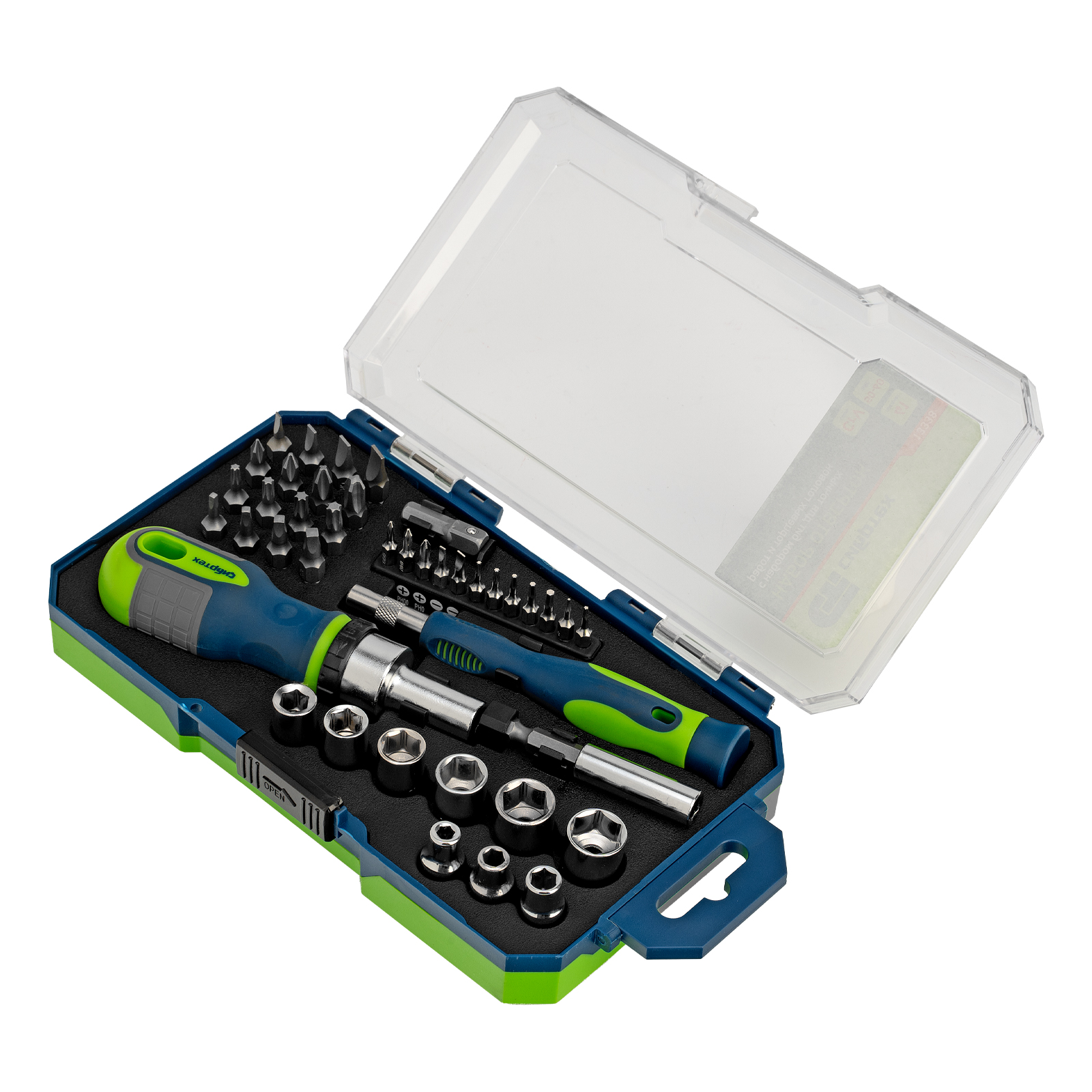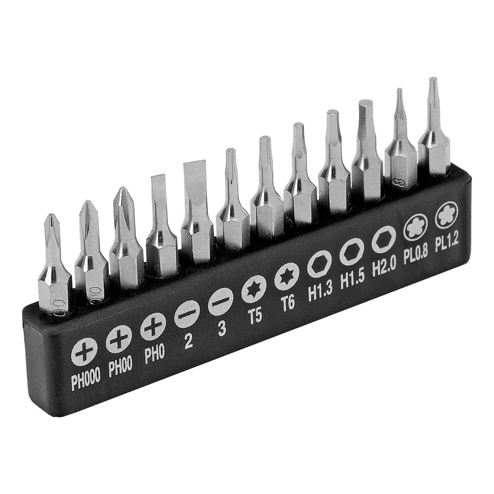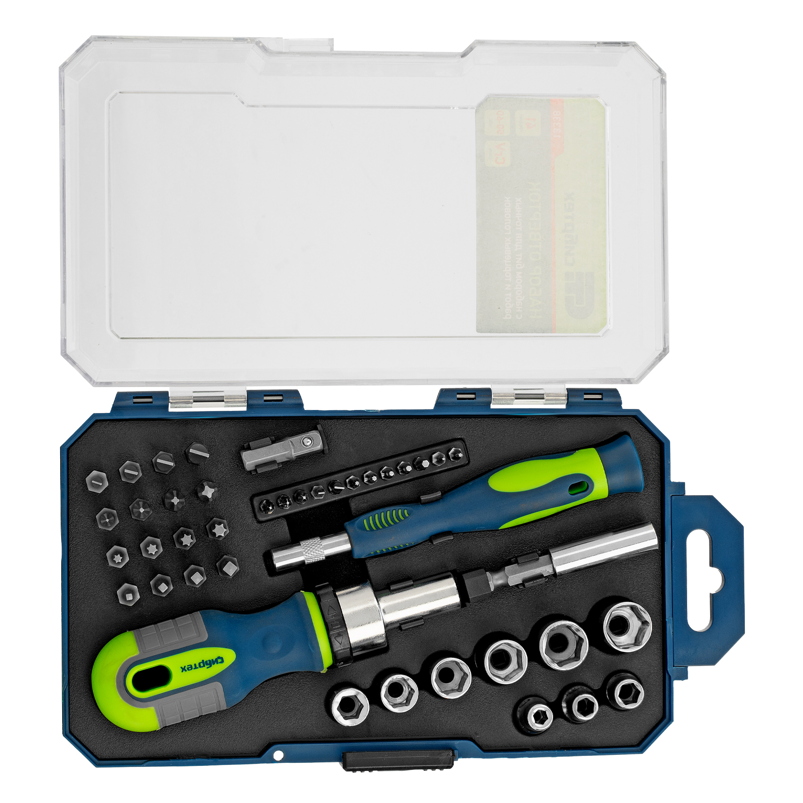 Отвертка реверсивная для бит 1/4" - 1 штОтвертка для точных работ - 1 штУдлинитель 1/4" - 1 штПереходник для торцевых головок 1/4" - 1 штТорцевые головки: 4, 5, 6, 7, 8, 9, 10, 11, 12 мм - 9 штБиты 1/4": SL3, SL4, SL5, SL6, PH0, PH1, PH2, PH3 - 8 шт Биты 1/4": Т10, Т15, Т20, Т25, S0, S1, S2, S3 - 8 штБиты для точных работ: SL2, SL3, Т5, Т6 - 2 шт Биты для точных работ: PH000, PH00, PH0 - 3 шт Биты для точных работ: Pb 0.8, 1.2 - 2 штБиты для точных работ: H1.3, Н1.5, Н2.0 - 3 шт