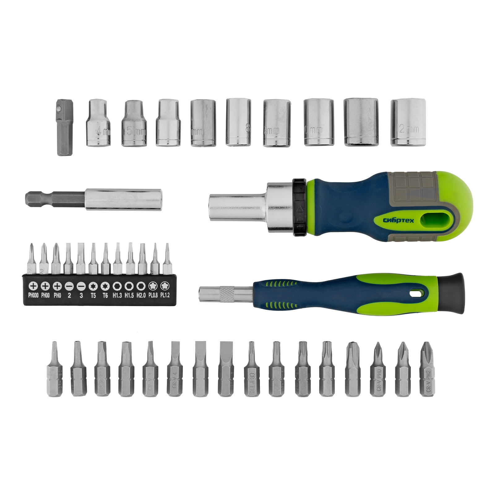Отвертки реверсивные с набором бит и торцевыми головками, 41 шт, CrV Сибртех