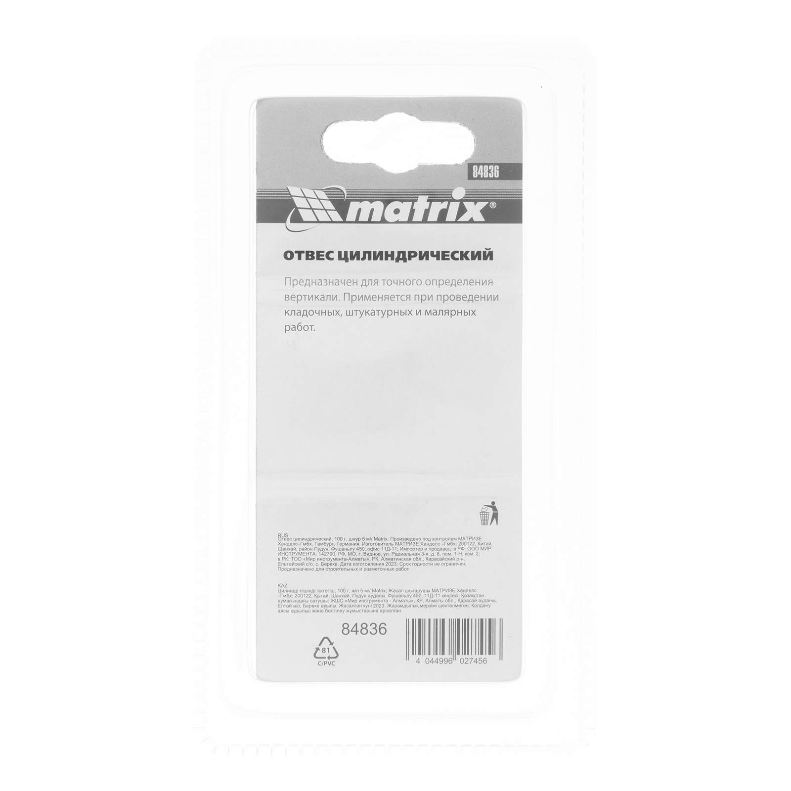 Цилиндрический отвес Matrix 84836 весом 100 г, в комплекте со шнуром 5 м, позволяет осуществить точную разметку стен и осуществить контроль вертикали. Он пригодится мастерам при проведении работ внутри и снаружи помещений. Отвес в форме цилиндра обеспечивает отличную центровку.