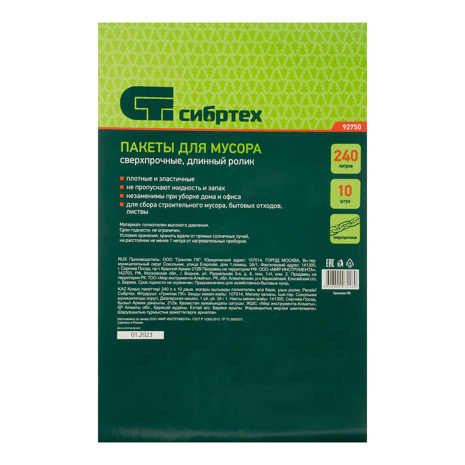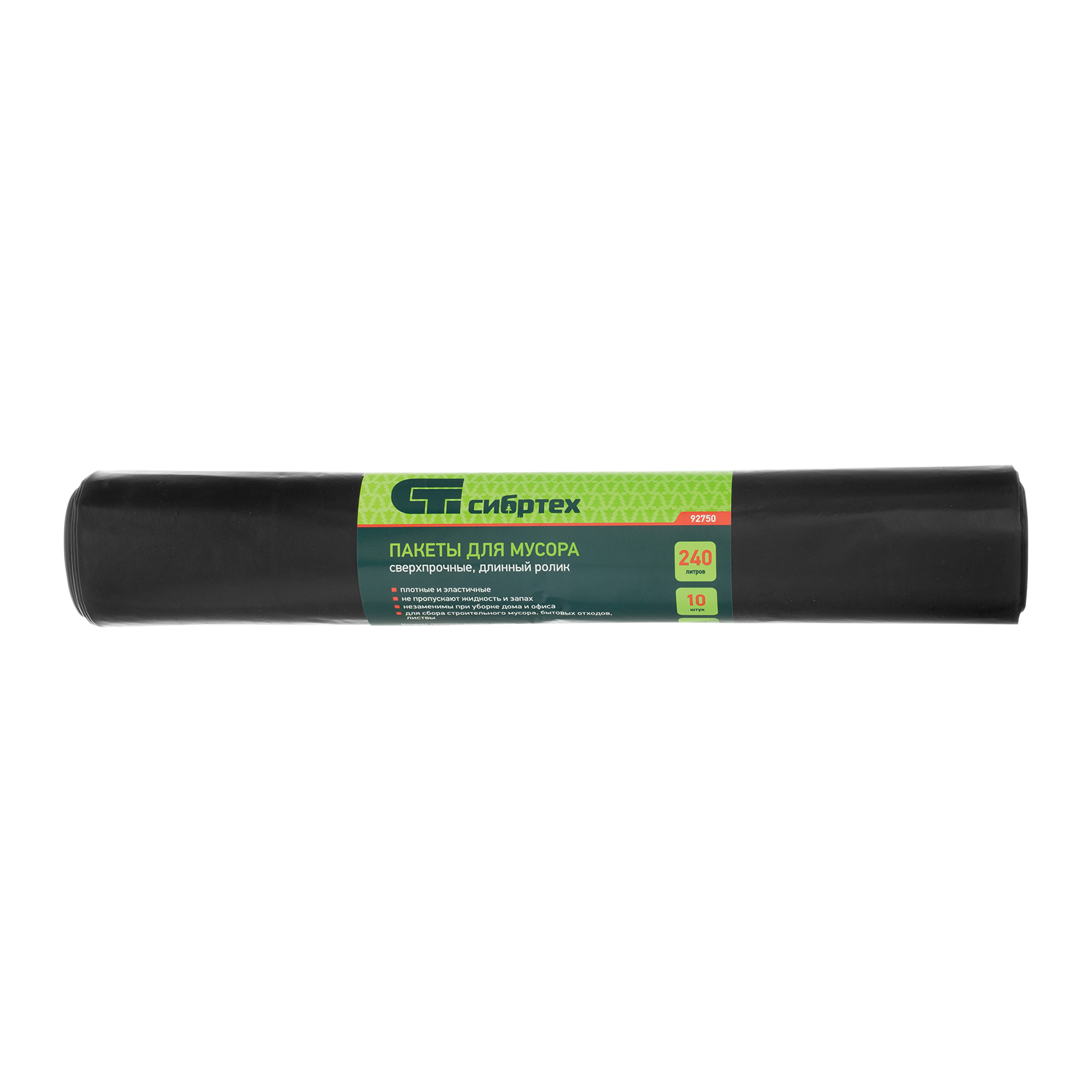 <p>Сверхпрочные пакеты для мусора Сибртех 92750 из ПВД, объемом 240 л, 10 шт. в длинном ролике, имеют прямое дно и применяются для сбора мусора на даче, строительной площадке, во время уборки придомовой территории. Рассчитаны на транспортировку как легких бытовых, так и тяжелых строительных отходов, в том числе с острыми краями.</p><h2>Преимущества</h2><ul><li>Надежность — износостойкие пакеты из полиэтилена высокого давления плотностью 60 мкм обладают высокой устойчивостью к разрыву.</li><li>Удобная эксплуатация — специальная перфорация упрощает отделение пакетов от рулона.</li><li>Универсальность — изделия устойчивы к воздействию химических веществ и агрессивных сред, поэтому подходят для утилизации практически любых отходов.</li><li>Продуманная комплектация — 10 штук объемом 240 л хватит для сбора большого количества мусора.</li></ul>