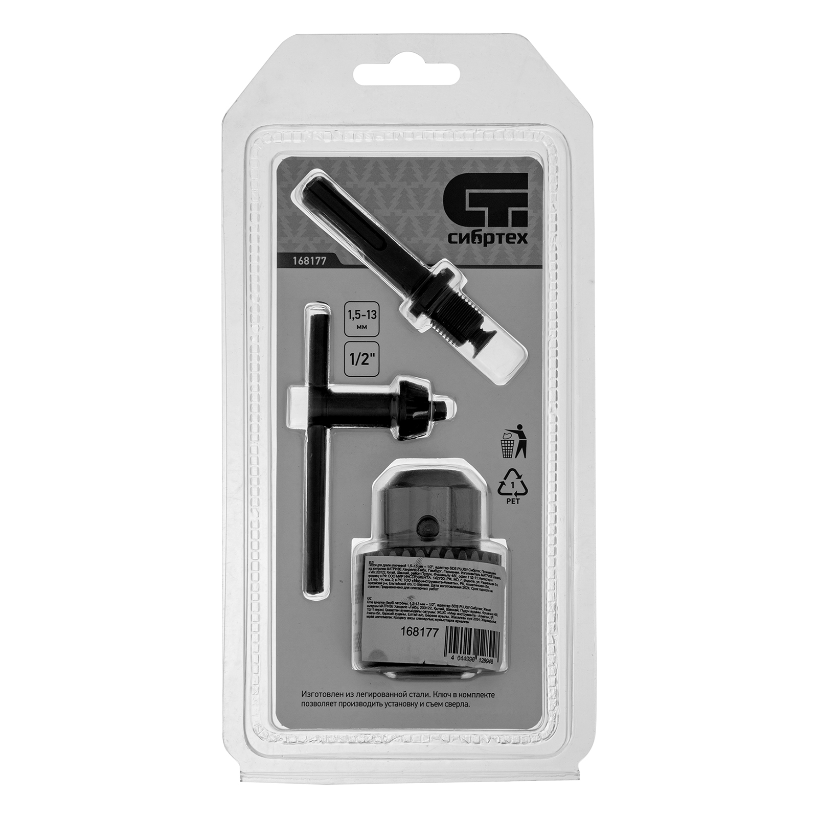 Ключевой патрон Сибртех 168177, тип соединения 1/2 дюйма, с адаптером SDS PLUS, предназначен для фиксации оснастки 1,5-13 мм на дрели и шуруповерты. Он будет полезен во время строительных и ремонтных работ для сверления отверстий и работы в ударном режиме.