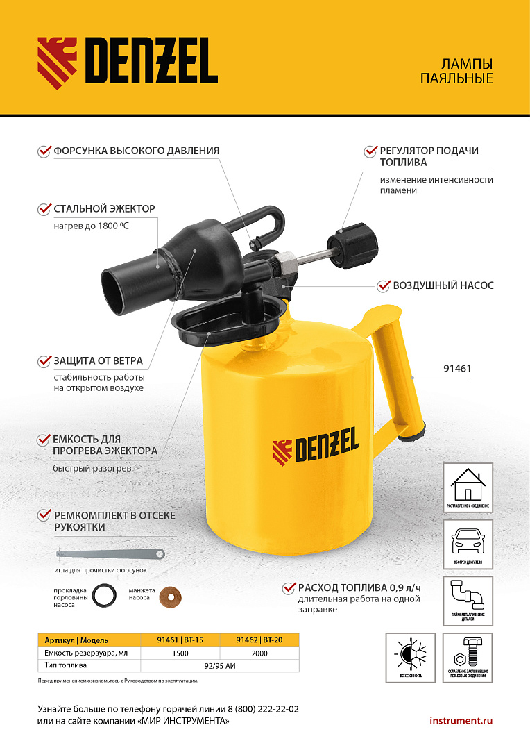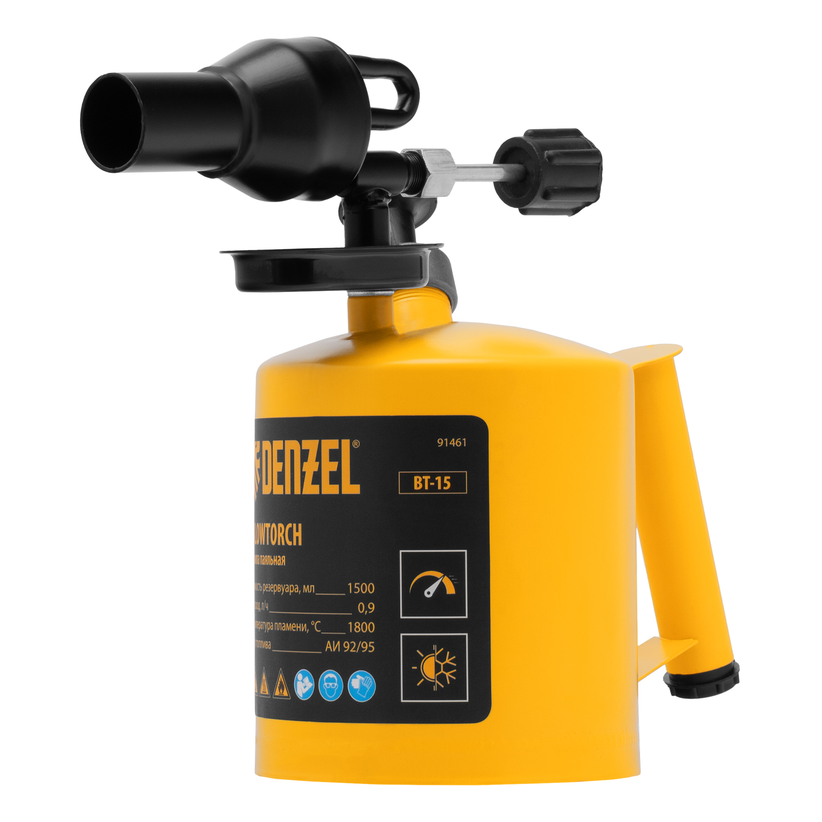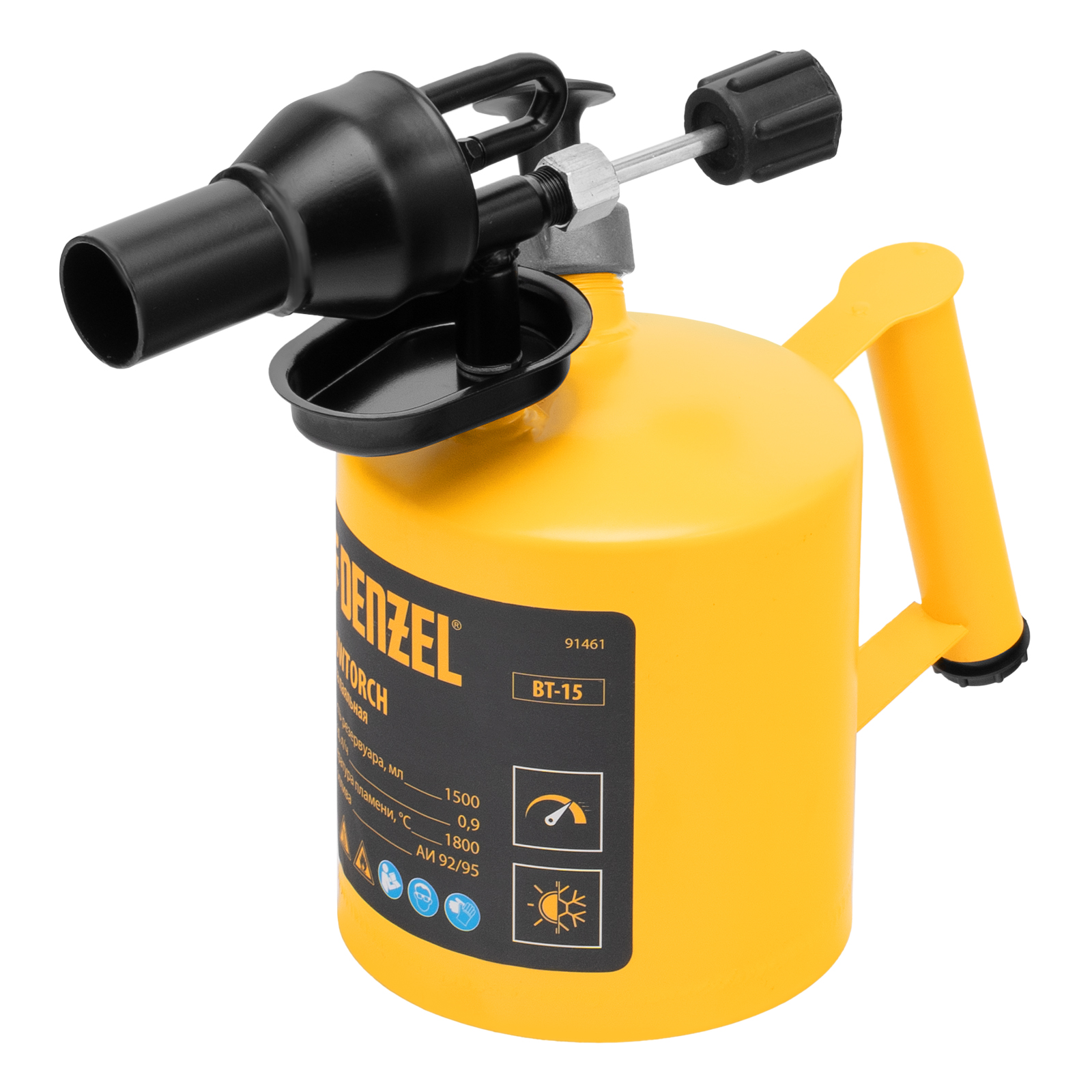 Паяльная лампа Denzel BT-15 91461 с баком объемом 1,5 л предназначена для нагрева поверхностей при помощи открытого направленного пламени. Полной заправки (1,1 л топлива) хватает больше чем на час работы при расходе 0,9 л/ч. Воздушный насос и форсунка высокого давления обеспечивают эффективную подачу топлива к эжектору. Лампа стабильно работает даже в ветреную погоду. Используется при выполнении ремонтных и демонтажных работ: пайки, сварки, ослаблении заклинивших резьбовых соединений, опаливании древесины, снятии лакокрасочных покрытий и других термических работ. Пригодится для обогрева двигателя. Также будет полезна в сельском хозяйстве и в быту.