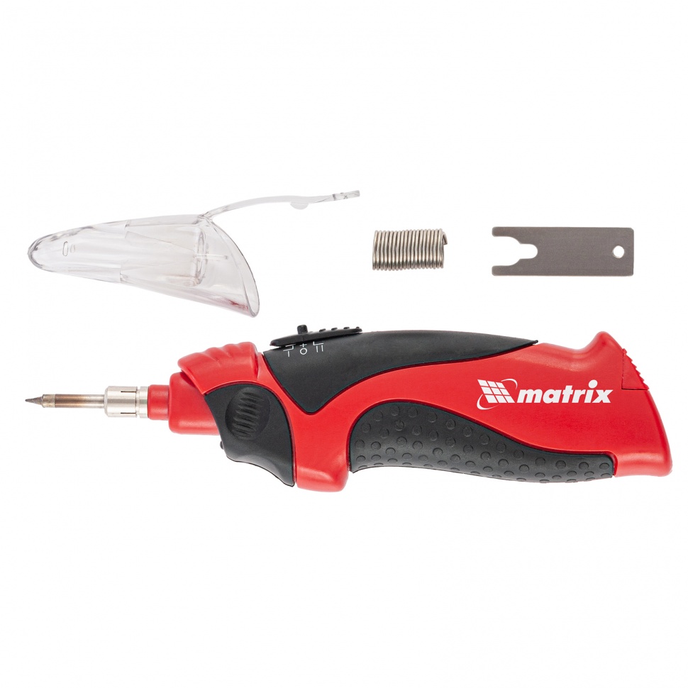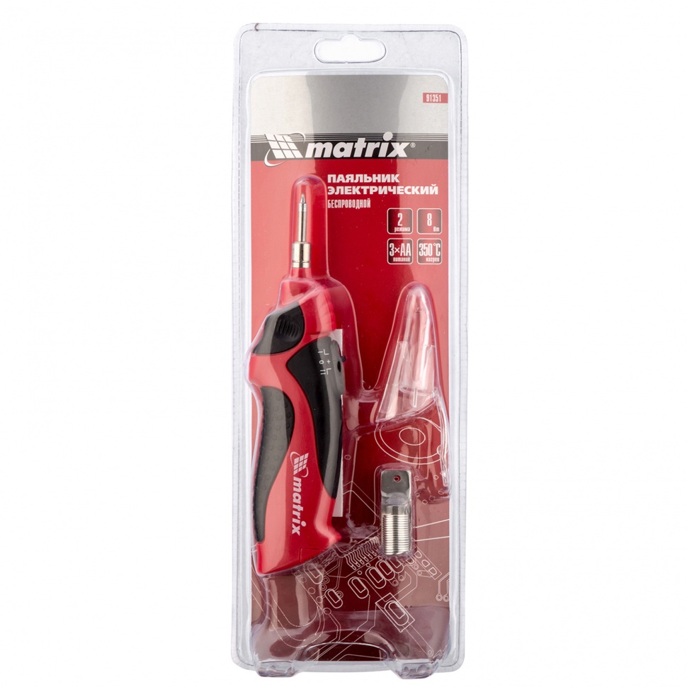 Беспроводной паяльник Matrix 91351 с рабочим напряжением 4,5 В и мощностью 8 Вт, с припоем 10 г и подставкой, работает от 3 элементов питания AA, жало разогревается до 350 °C. Прибор позволяет отремонтировать электротехнику в условиях отсутствия подключения к сети 220 В. Необходимый для этого припой входит в комплект поставки. Медное жало быстро нагревается, а защитное покрытие препятствует его обгоранию. Нихромовая спираль устойчива к повреждениям, что обеспечивает надежность прибора.