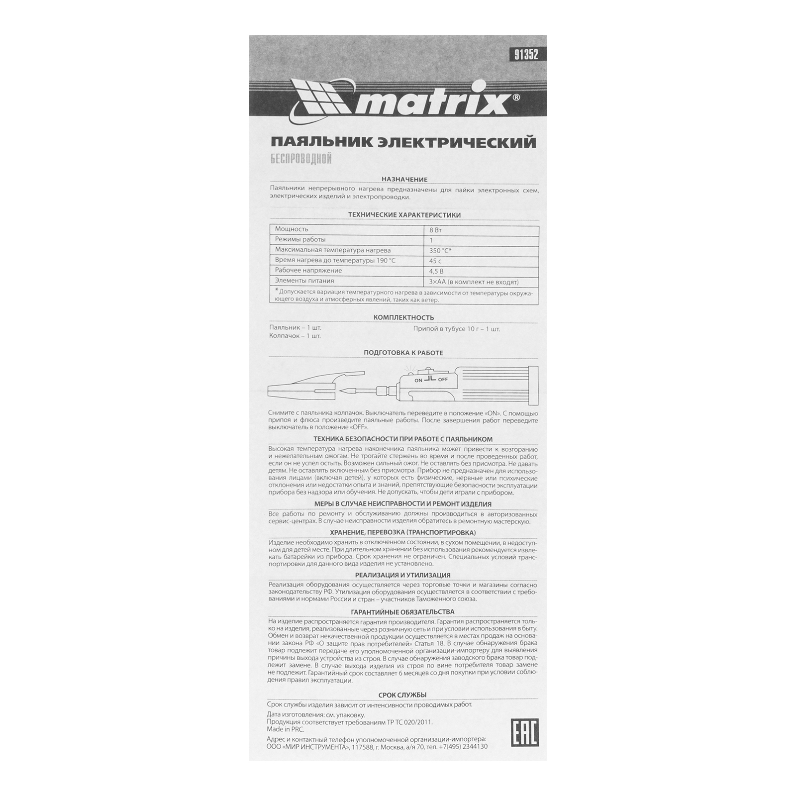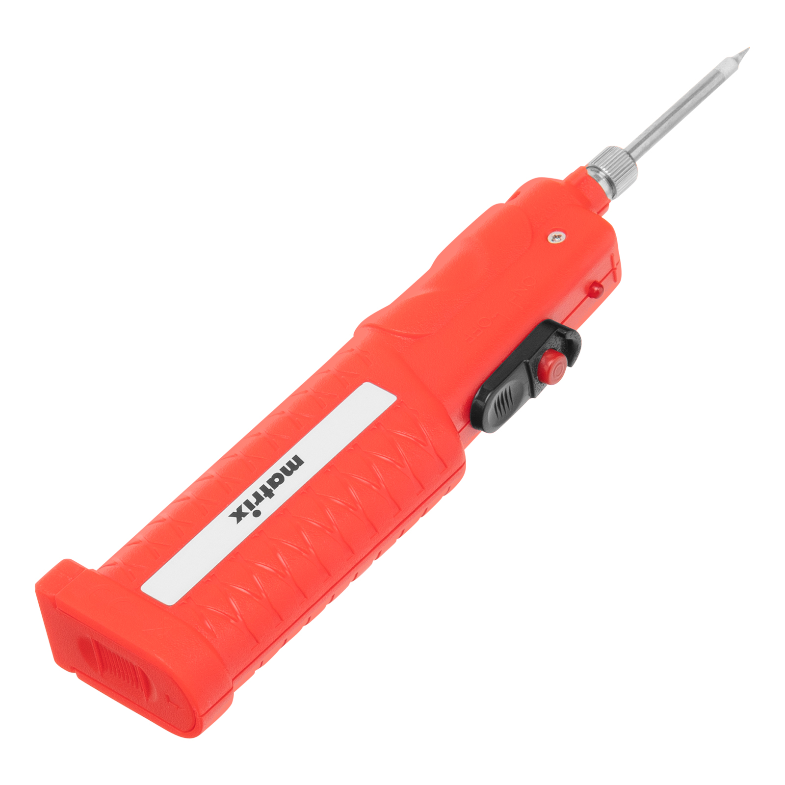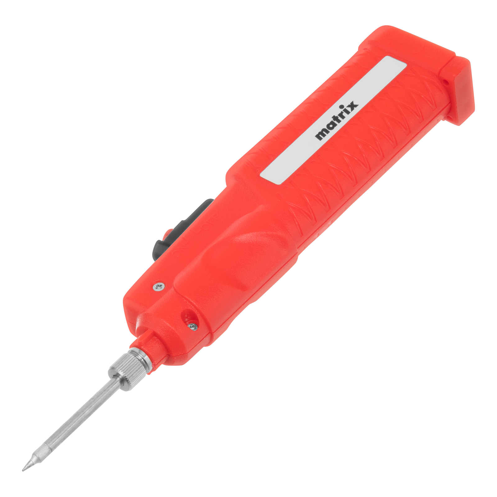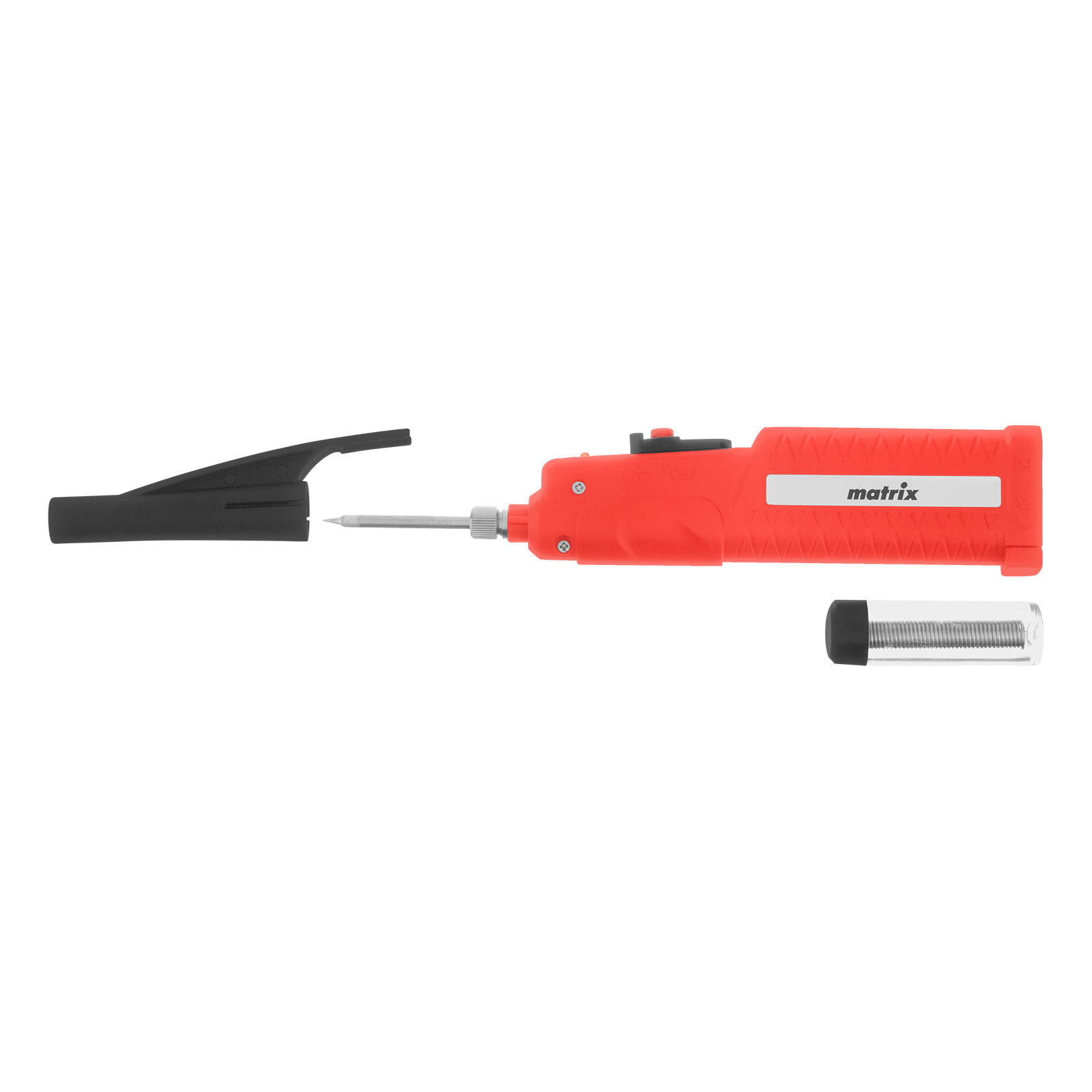 Беспроводной паяльник Matrix 91352 с рабочим напряжением 4,5 В, мощностью 8 Вт, с припоем 10 г, работает от 3 элементов питания AA, рабочая температура составляет 350 °C. Предназначен для пайки микросхем и проводов в условиях отсутствия розетки 220 В. Приобретать припой не нужно — он входит в комплект поставки. Прибор устойчив к повреждениям, т.к. нагревательным элементом в нем является нихромовая спираль. Будет полезен на выездной работе или в путешествии.