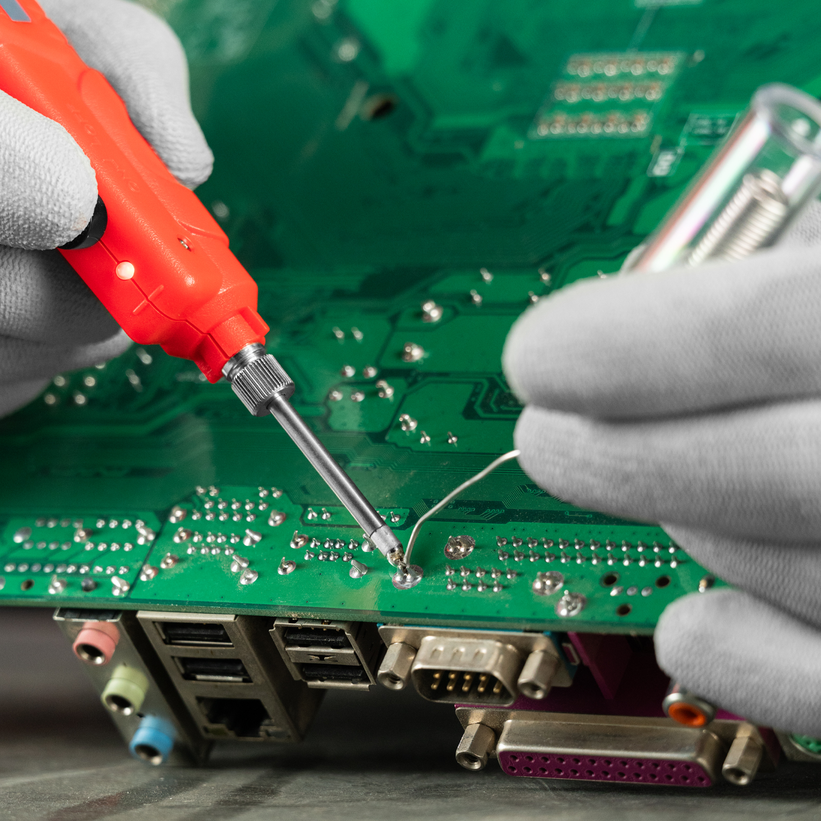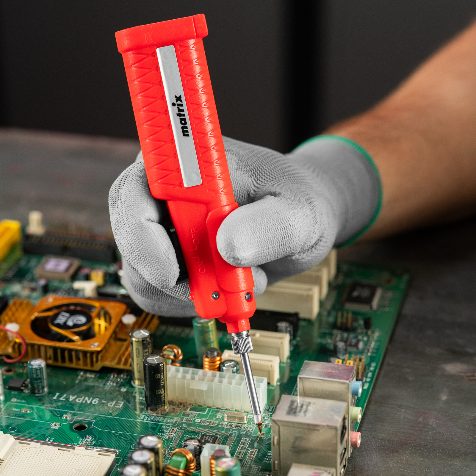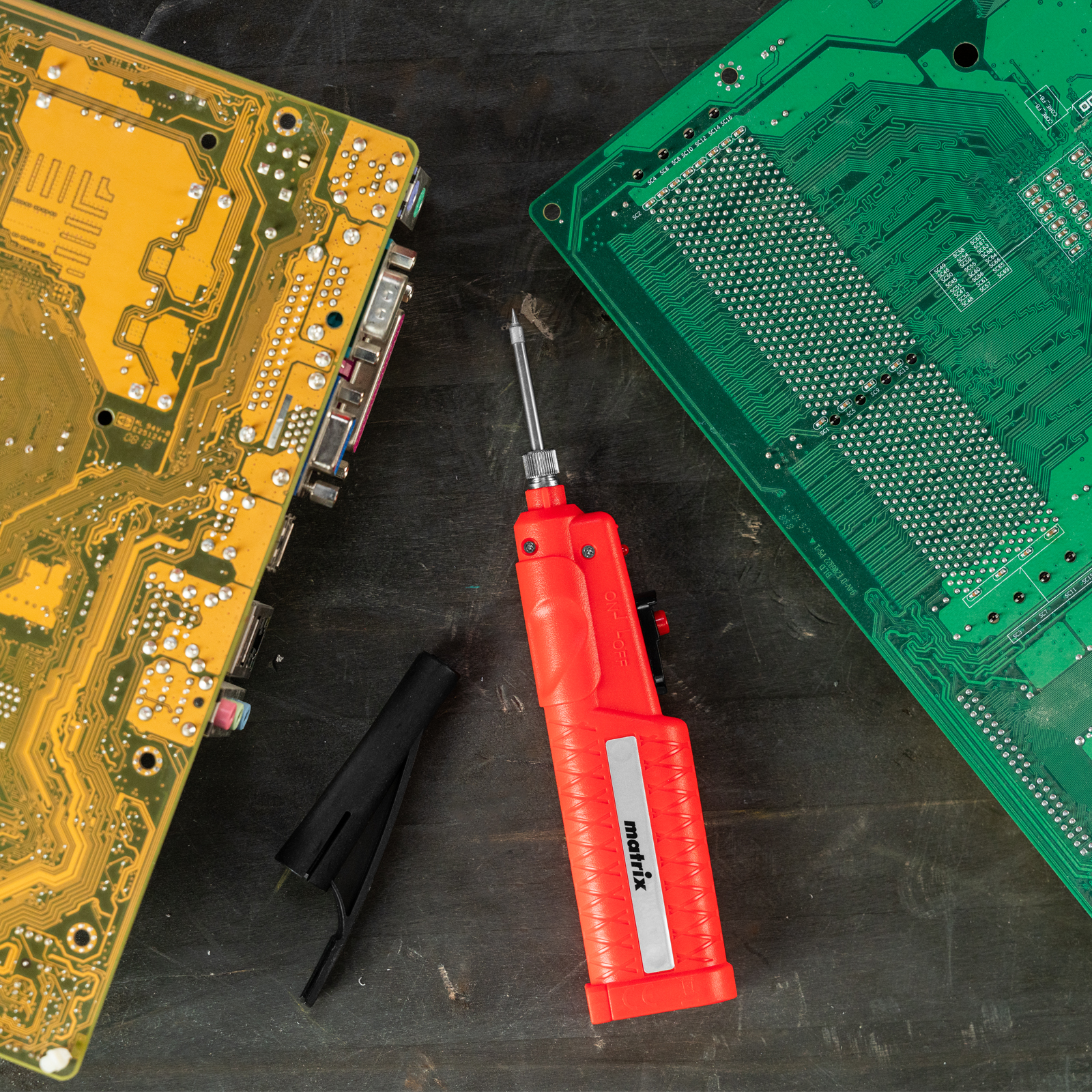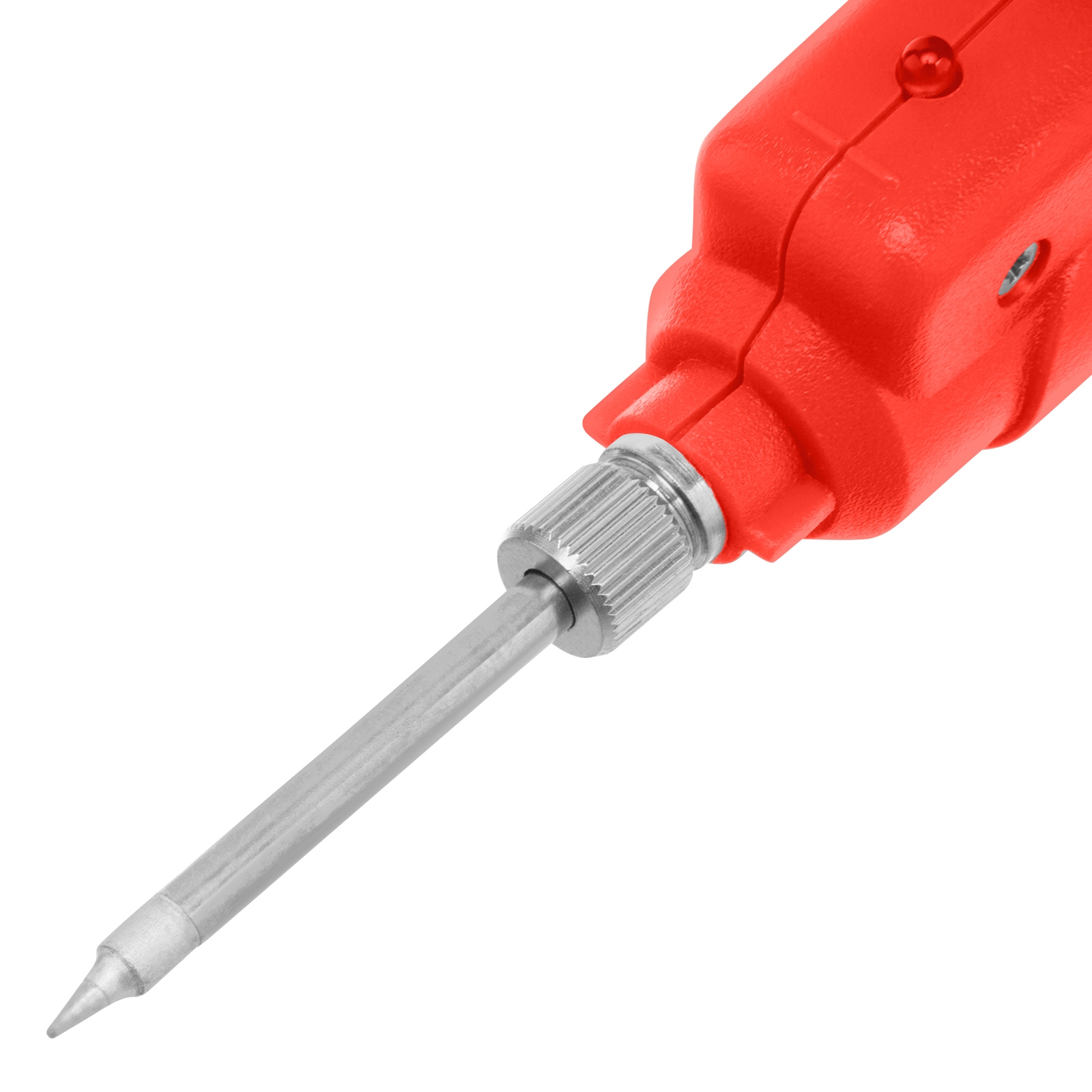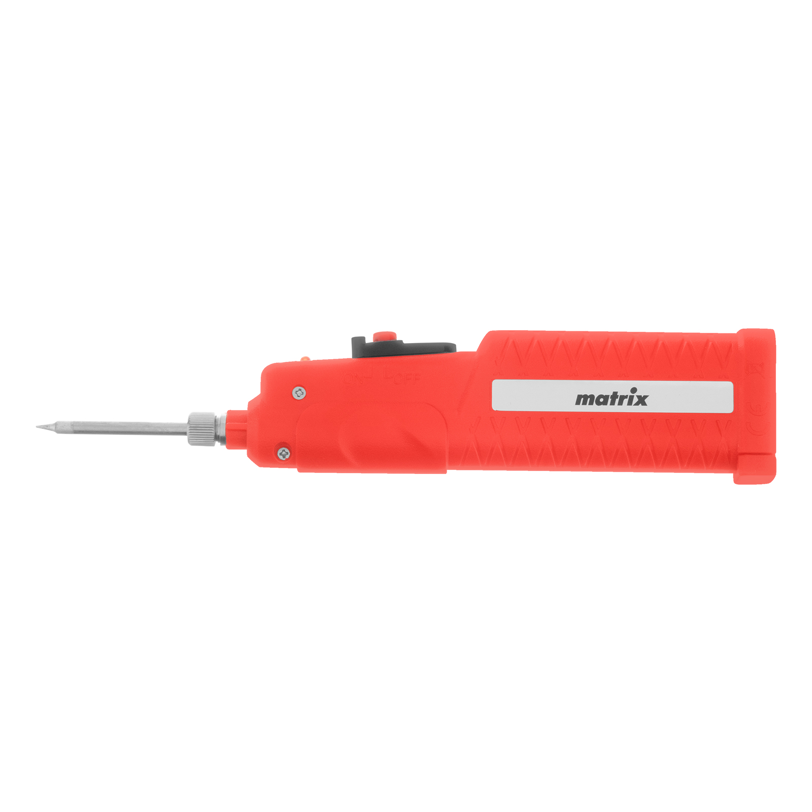 Беспроводной паяльник Matrix 91352 с рабочим напряжением 4,5 В, мощностью 8 Вт, с припоем 10 г, работает от 3 элементов питания AA, рабочая температура составляет 350 °C. Предназначен для пайки микросхем и проводов в условиях отсутствия розетки 220 В. Приобретать припой не нужно — он входит в комплект поставки. Прибор устойчив к повреждениям, т.к. нагревательным элементом в нем является нихромовая спираль. Будет полезен на выездной работе или в путешествии.