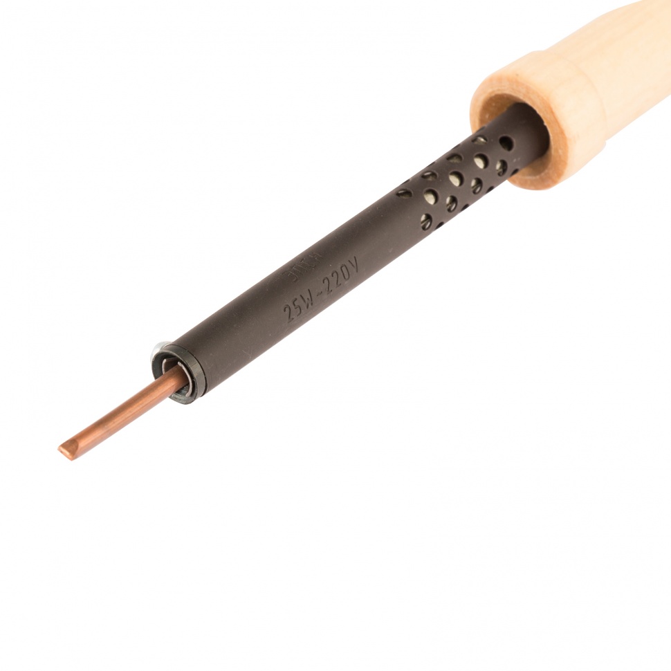 Электрический паяльник Сибртех ЭПСН 25/220 91300 с деревянной ручкой используется для пайки микросхем, мелких деталей и проводов. Имеет съемное жало, которое можно заменить в случае необходимости. Инструмент пригодится радиолюбителям, автоэлектрикам и домашним мастерам.