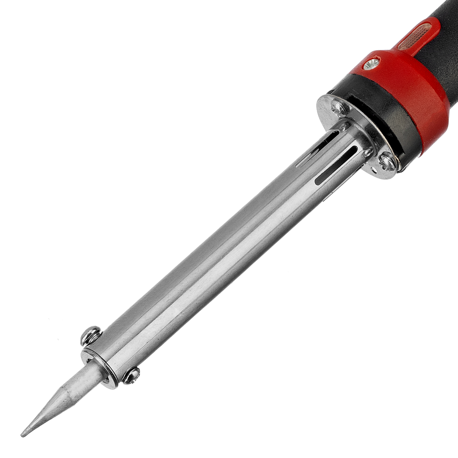 Продолжительная работа с паяльником не вызывает усталость благодаря удобной пластиковой рукоятке с мягкой накладкой.