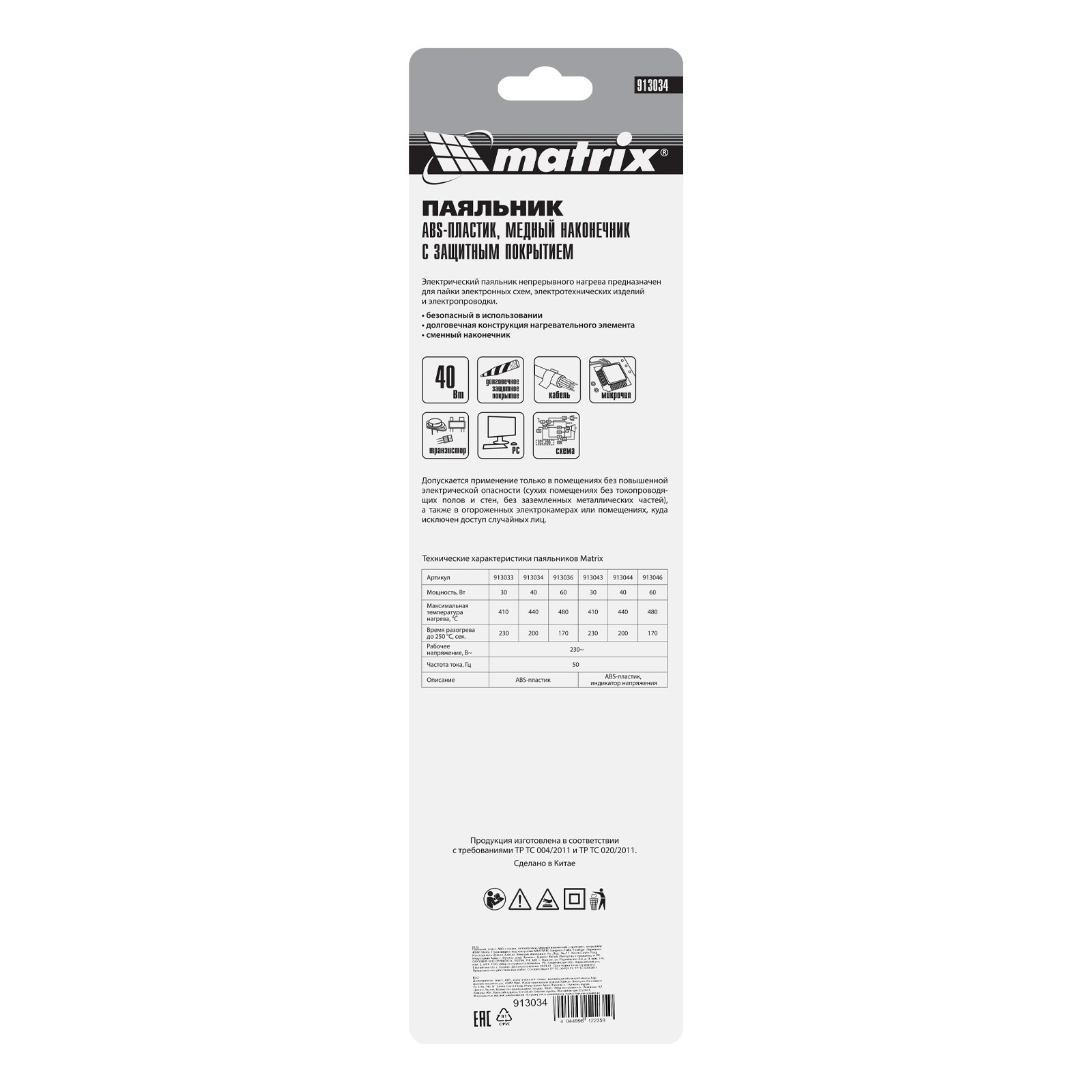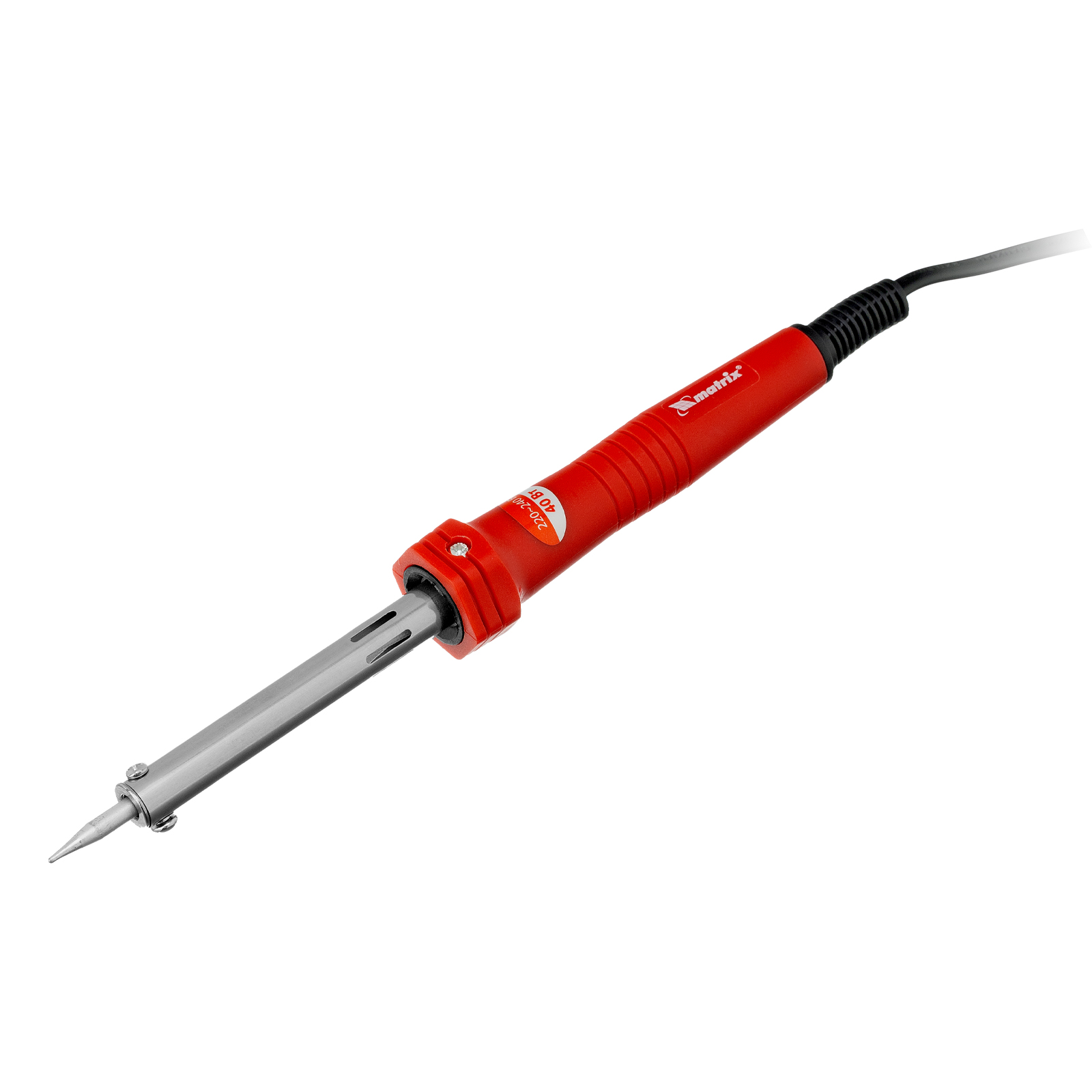 Паяльник Matrix 913034 мощностью 40 W работает от сети 220 В, изготовлен из ABS-пластика с пониженной теплопроводностью и имеет медный наконечник с долговечным покрытием. Используется для пайки транзисторов, микрочипов, электросхем и проводов. В качестве нагревательного элемента использована нихромовая спираль, что снижает риск поломки в случае падения или удара. Конусовидное жало оптимально для проведения точной пайки. Гальваническое покрытие защищает наконечник от внешних воздействий, что продлевает срок службы инструмента. Паяльник пригодится радиолюбителям и домашним мастерам.