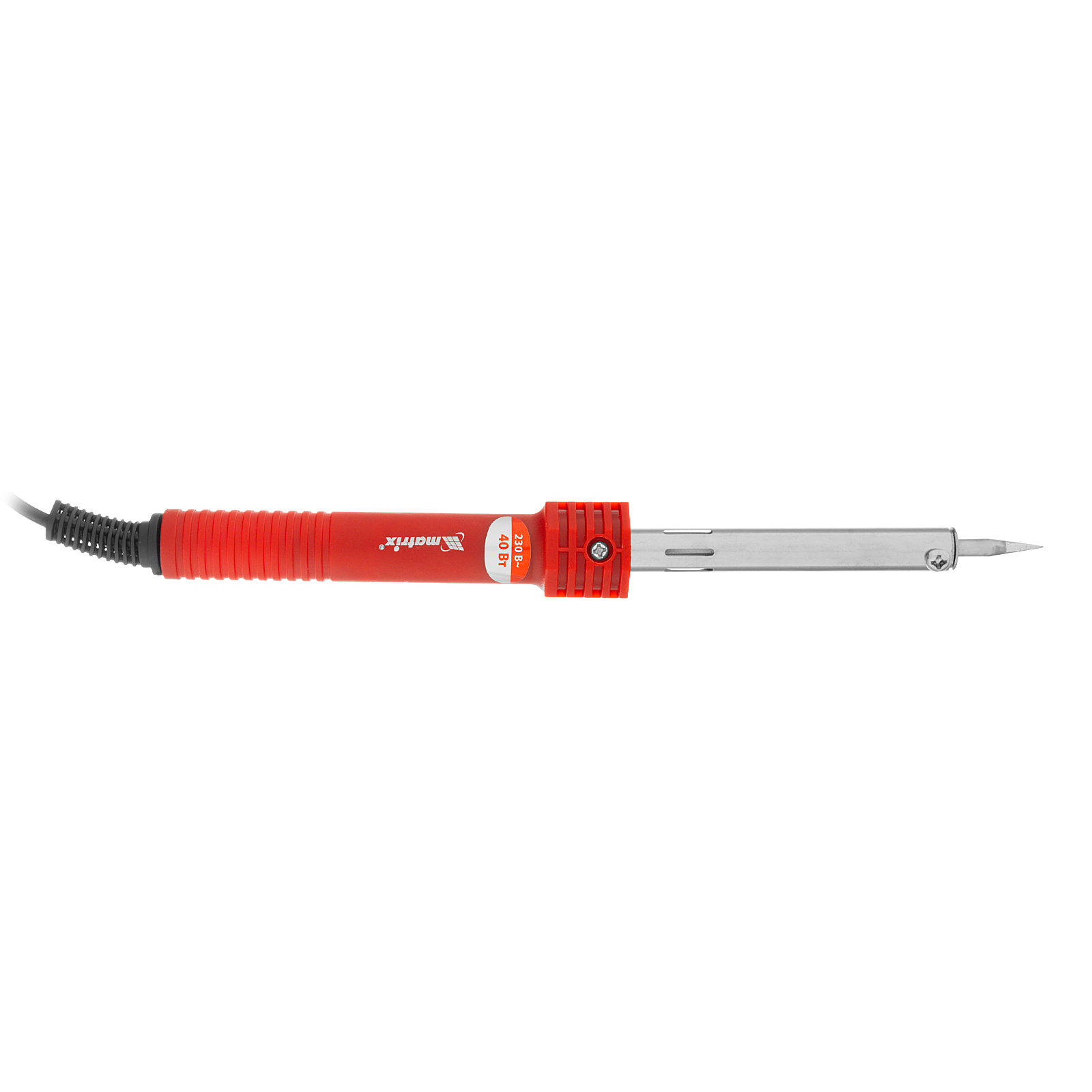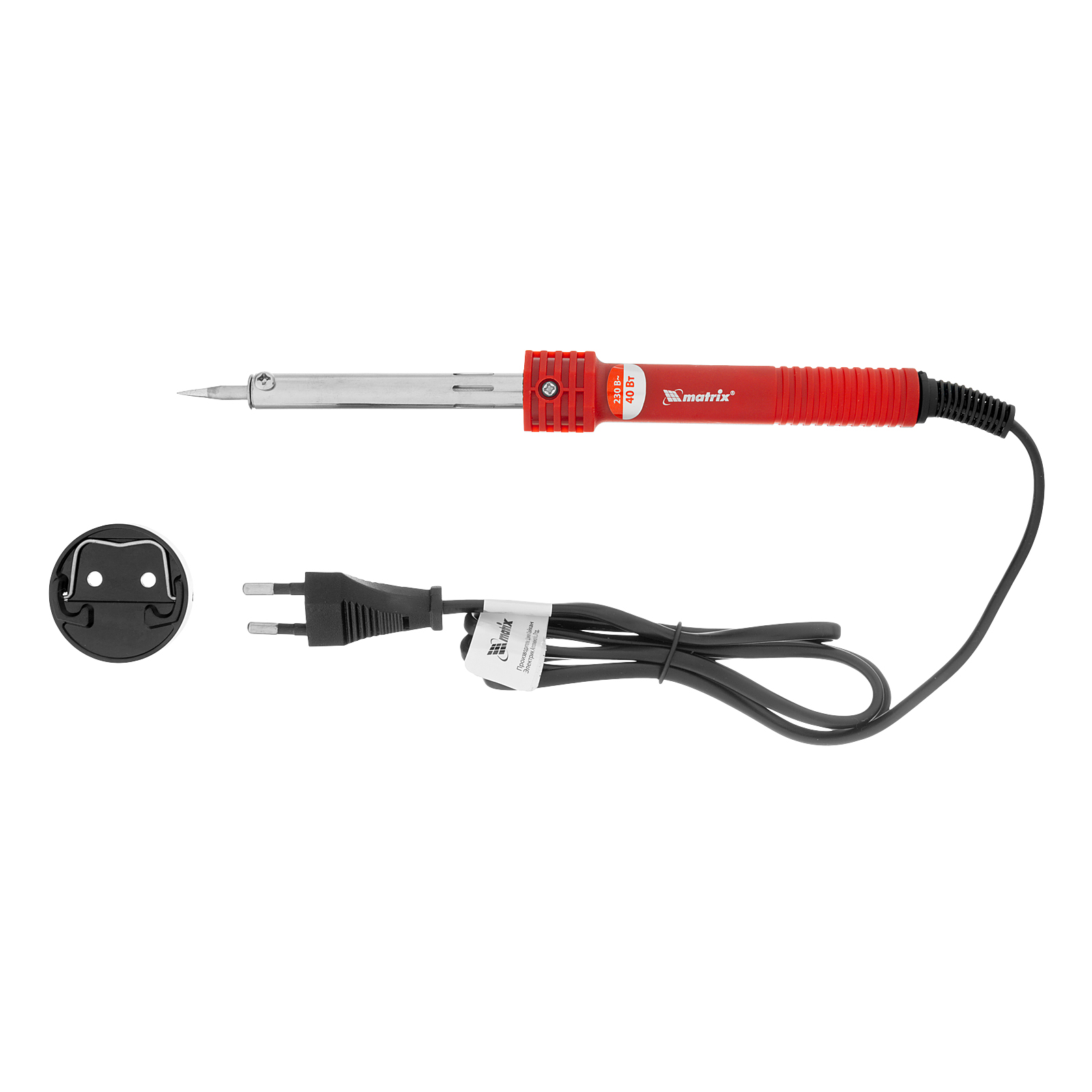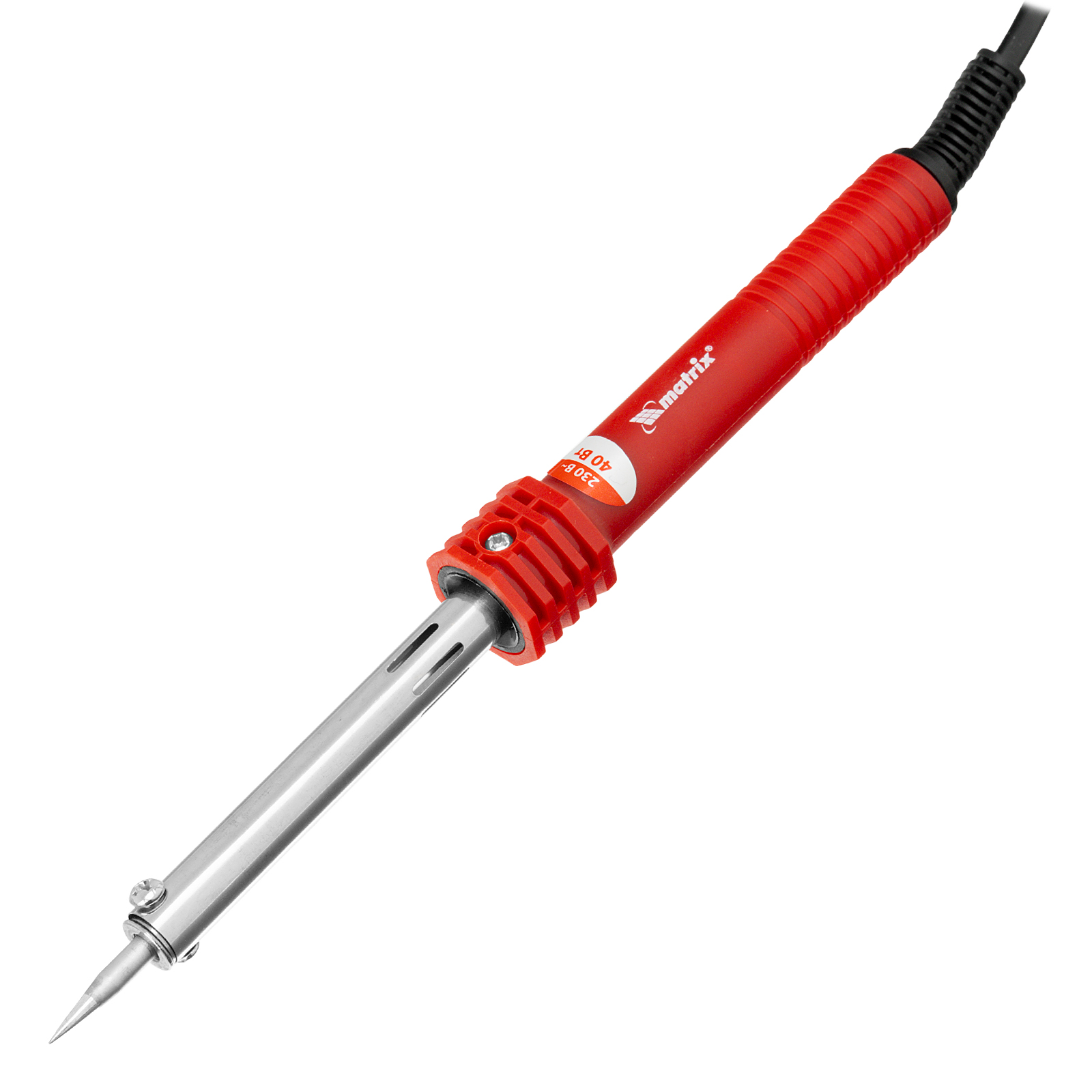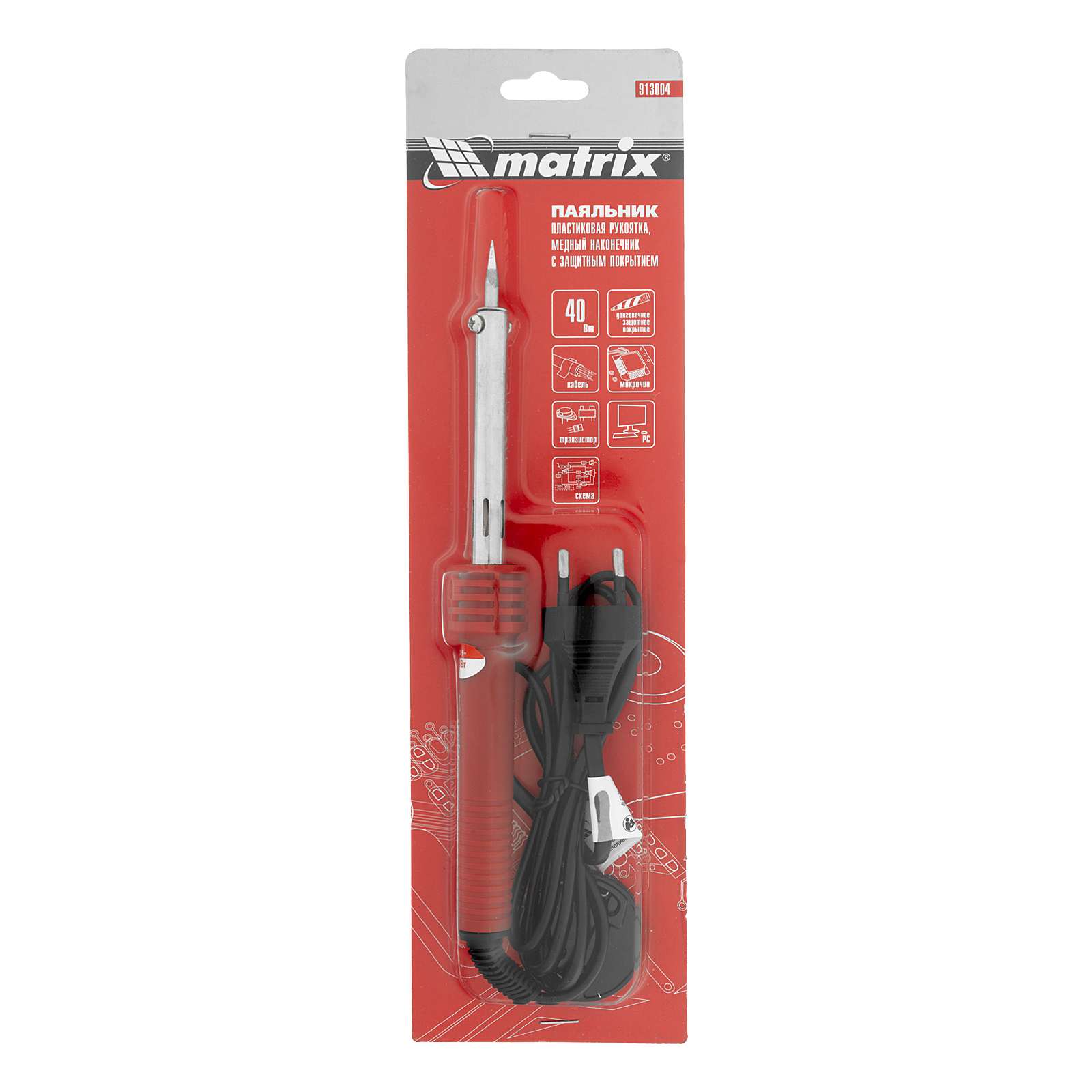 Паяльник Matrix 913004 мощностью 40 W, с пластиковой рукояткой, работающий от сети 220 В, имеет медный наконечник с долговечным гальваническим защитным покрытием, надежно защищающим его от внешних воздействий. Конусовидное жало удобно для выполнения точных работ. Благодаря нагревательному элементу в виде нихромовой спирали паяльник устойчив к повреждениям. Инструмент используется для пайки проводов, микрочипов, электрических схем и транзисторов. Будет полезен для ремонта автомобилей, электроники и бытовой техники.