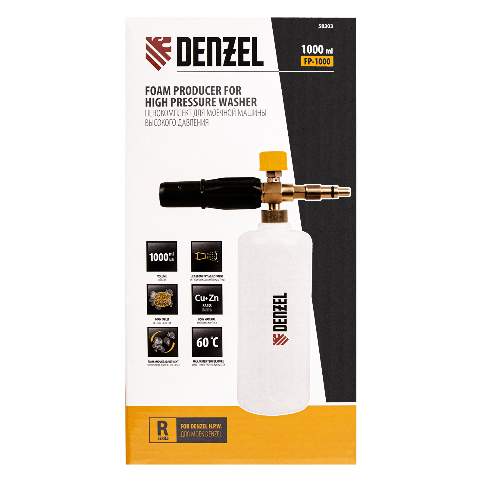 Пенокомплект Denzel FPB-1000 58303 позволяет получать пенный раствор для мойки кузовов автомобилей и других поверхностей. Он устанавливается на моечные машины высокого давления Denzel серии R.