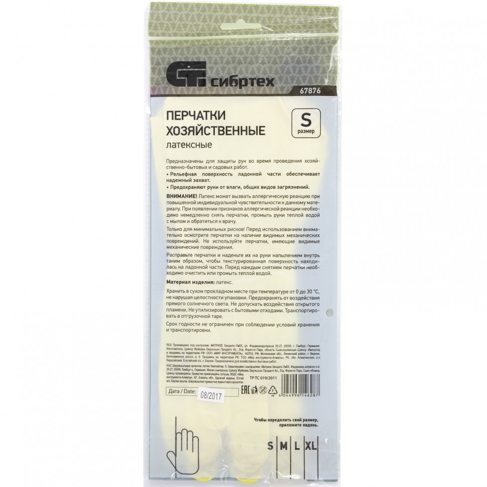<p>Хозяйственные латексные перчатки Сибртех 67879, размер XL, не допускают контакта кожи рук с чистящими средствами, загрязнениями и водой. С ними можно проводить влажную уборку помещений, очищать различные поверхности, работать с удобрениями без риска повреждения кожи. Перчатки не сковывают движений, сохраняют тактильность и плотно прилегают к рукам, за счет чего с ними комфортно работать.</p><h2>Преимущества</h2><ul><li>Латекс придает перчаткам прочность и эластичность, что позволяет использовать их многократно.</li><li>Текстурированная ладонная часть позволяет надежно удерживать предметы без риска проскальзывания.</li><li>Перчатки изготовлены согласно требованиям ТР ТС 019/2011, поэтому характеризуются высоким качеством.</li></ul>