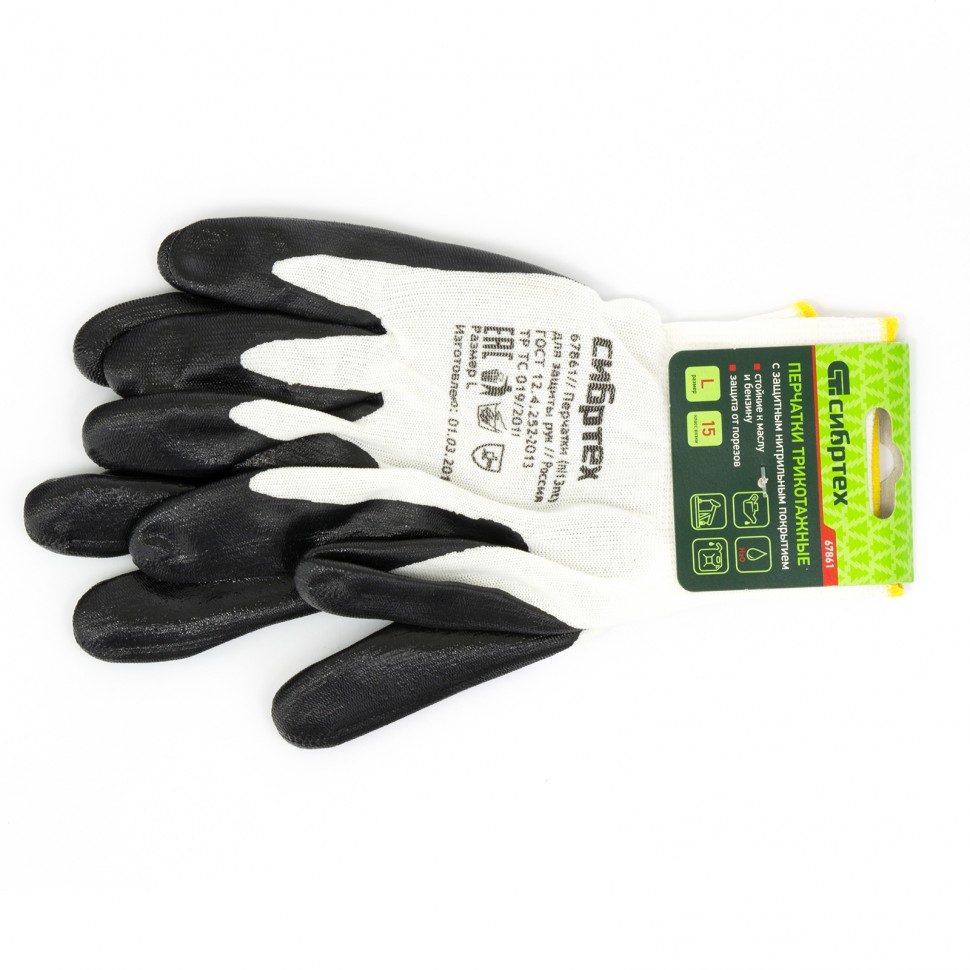 Маслобензостойкие полиэфирные перчатки Сибртех 67861 с черным нитрильным покрытием, 15 класса вязки, размера L, предназначены для выполнения хозяйственных, ремонтных, строительных и автослесарных работ, в том числе предполагающих контакт с агрессивными веществами. Покрытие из нитрила защищает кожу рук от попадания бензина, масла или краски, а также от влаги и загрязнений. Плотная пряжа предохраняет ладони от царапин, ссадин, порезов и мозолей. Перчатки будут полезны дома, в гараже или на даче.