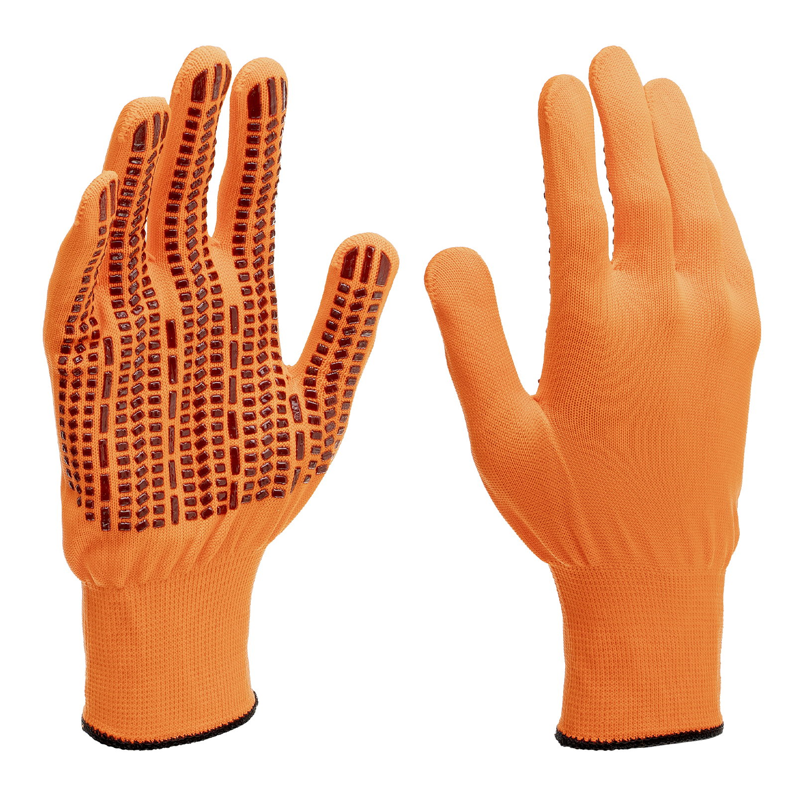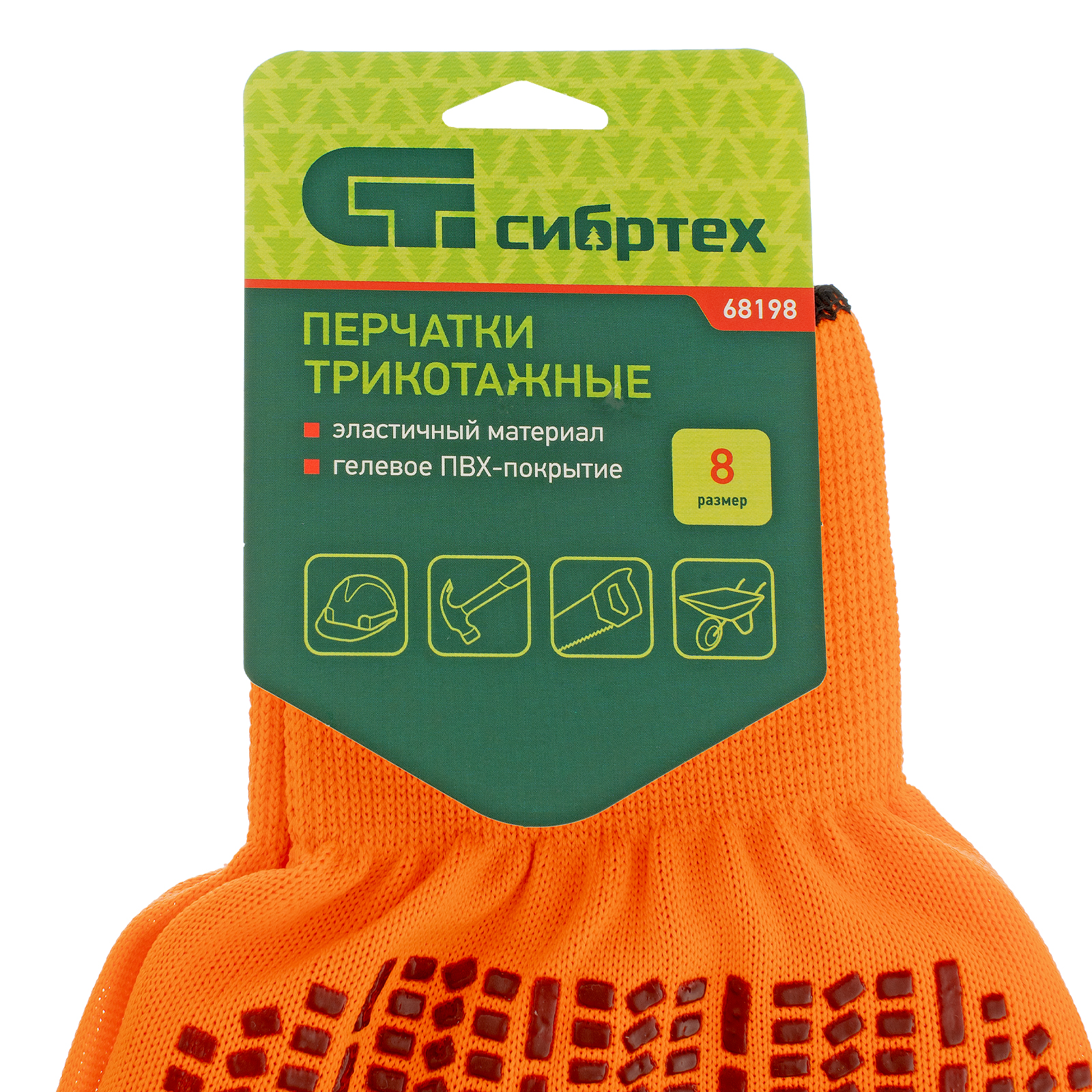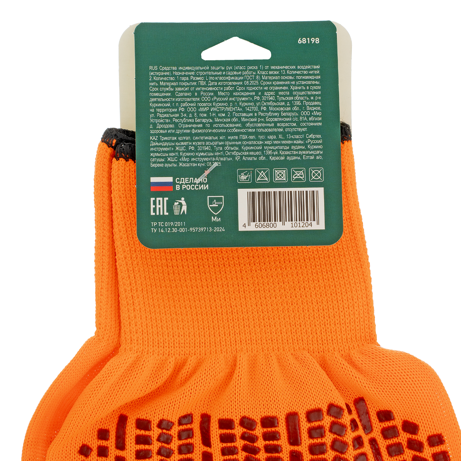 Трикотажные перчатки Сибртех 68198 оранжевого цвета, размера L, из синтетической пряжи 13 класса вязки, с ПВХ-покрытием «Точка», предназначены для защиты рук от травм и общепроизводственных загрязнений. Сохраняют чувствительность пальцев во время ремонтных, строительных и монтажных работ.