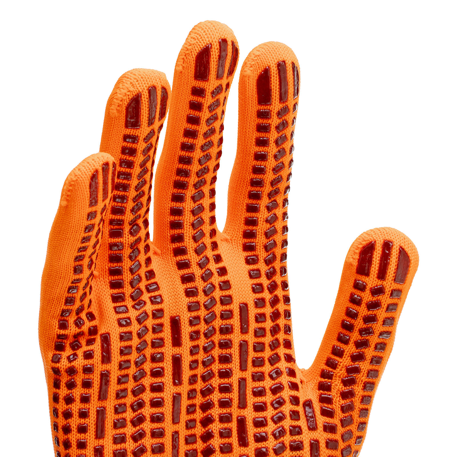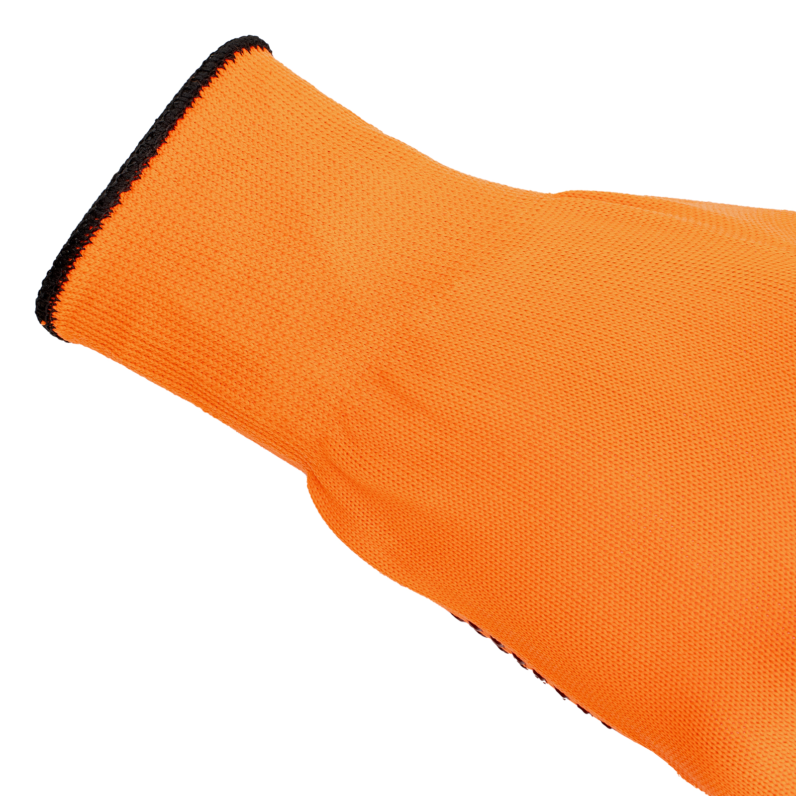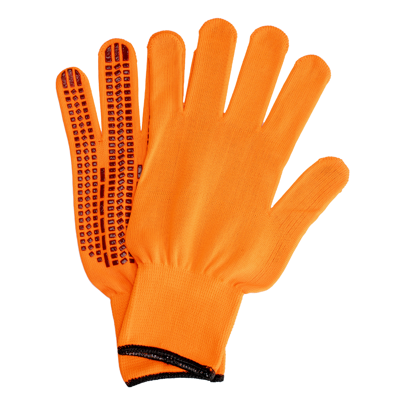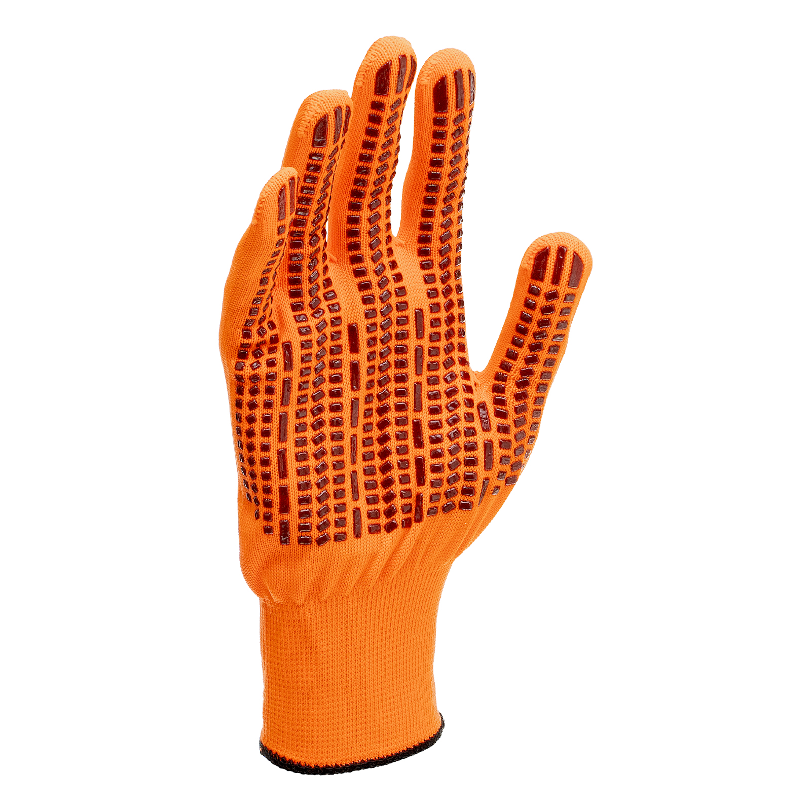 Трикотажные перчатки Сибртех 68198 оранжевого цвета, размера L, из синтетической пряжи 13 класса вязки, с ПВХ-покрытием «Точка», предназначены для защиты рук от травм и общепроизводственных загрязнений. Сохраняют чувствительность пальцев во время ремонтных, строительных и монтажных работ.