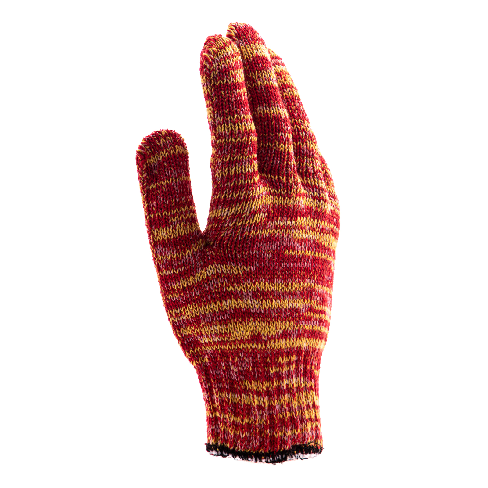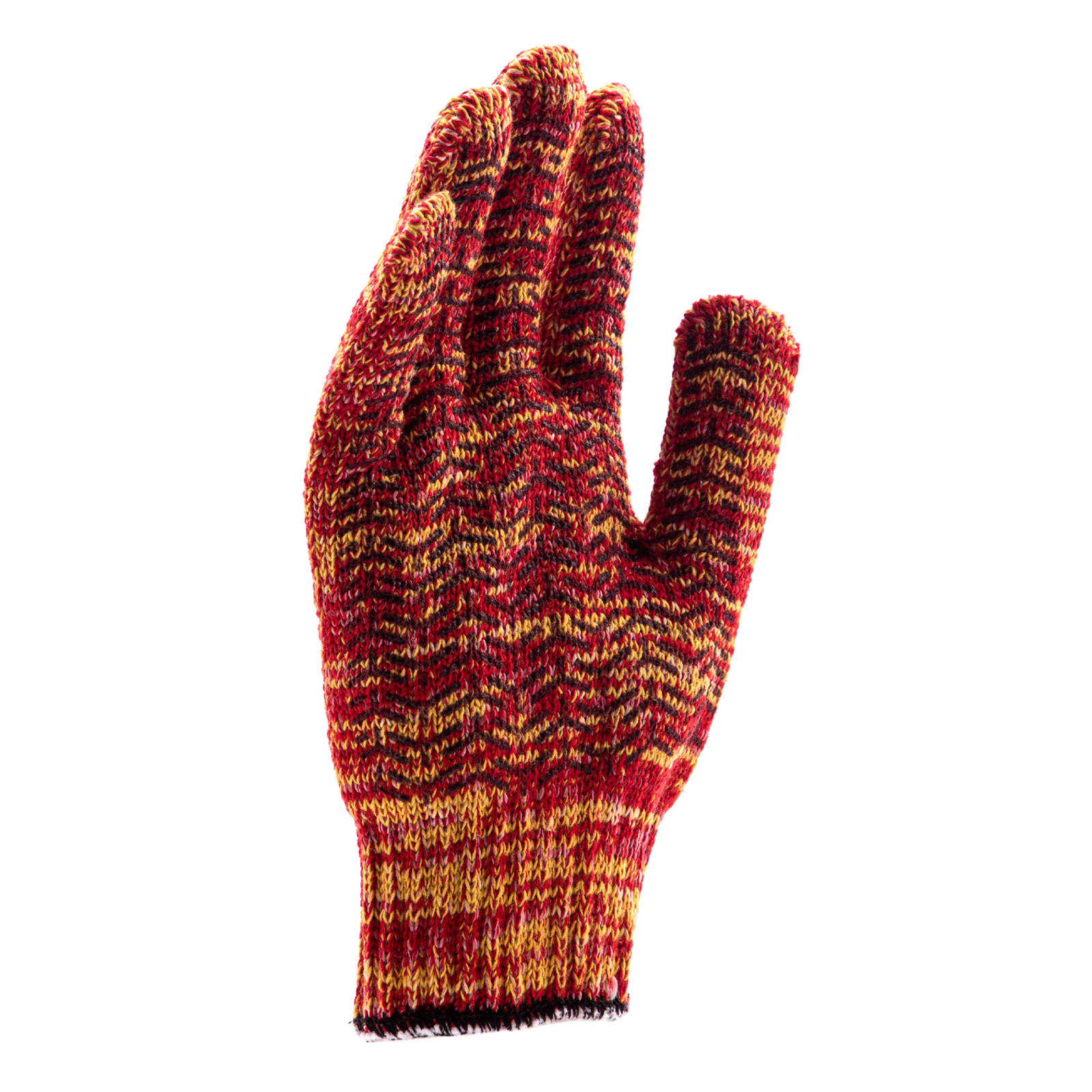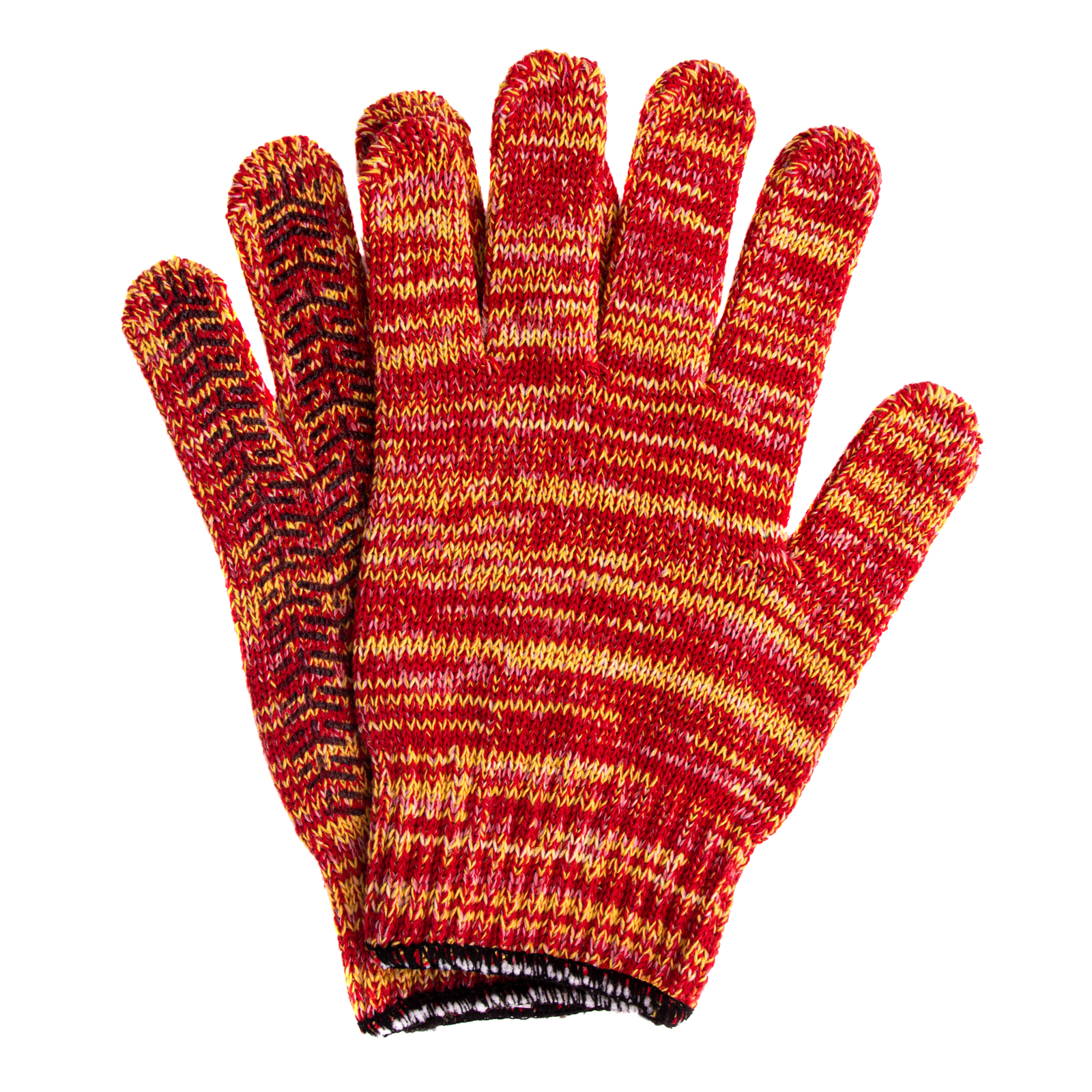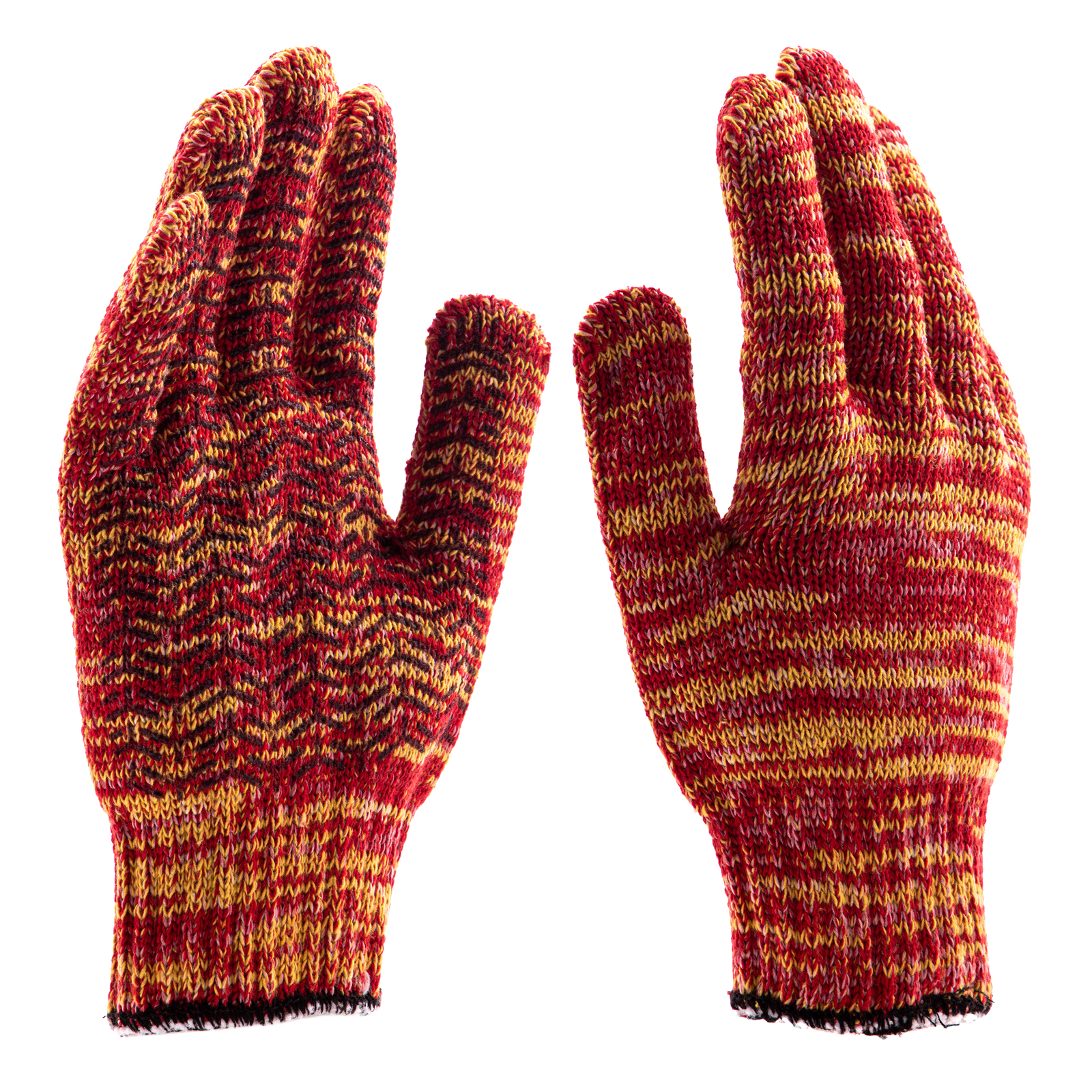 Усиленные трикотажные перчатки Сибртех 68181, красно-желтый меланж, с гелевым ПВХ-покрытием, 7 класса вязки, надевают на руки при выполнении тяжелых строительных, монтажных, ремонтных, сборочных и погрузо-разгрузочных работ. Толстая эластичная пряжа надежно защищает кисти рук от травм и попадания грязи, не препятствуя движениям пальцев. Нанесенный на ладонную сторону ПВХ-гель исключает скольжение и способствует надежному захвату инструментов и других предметов.