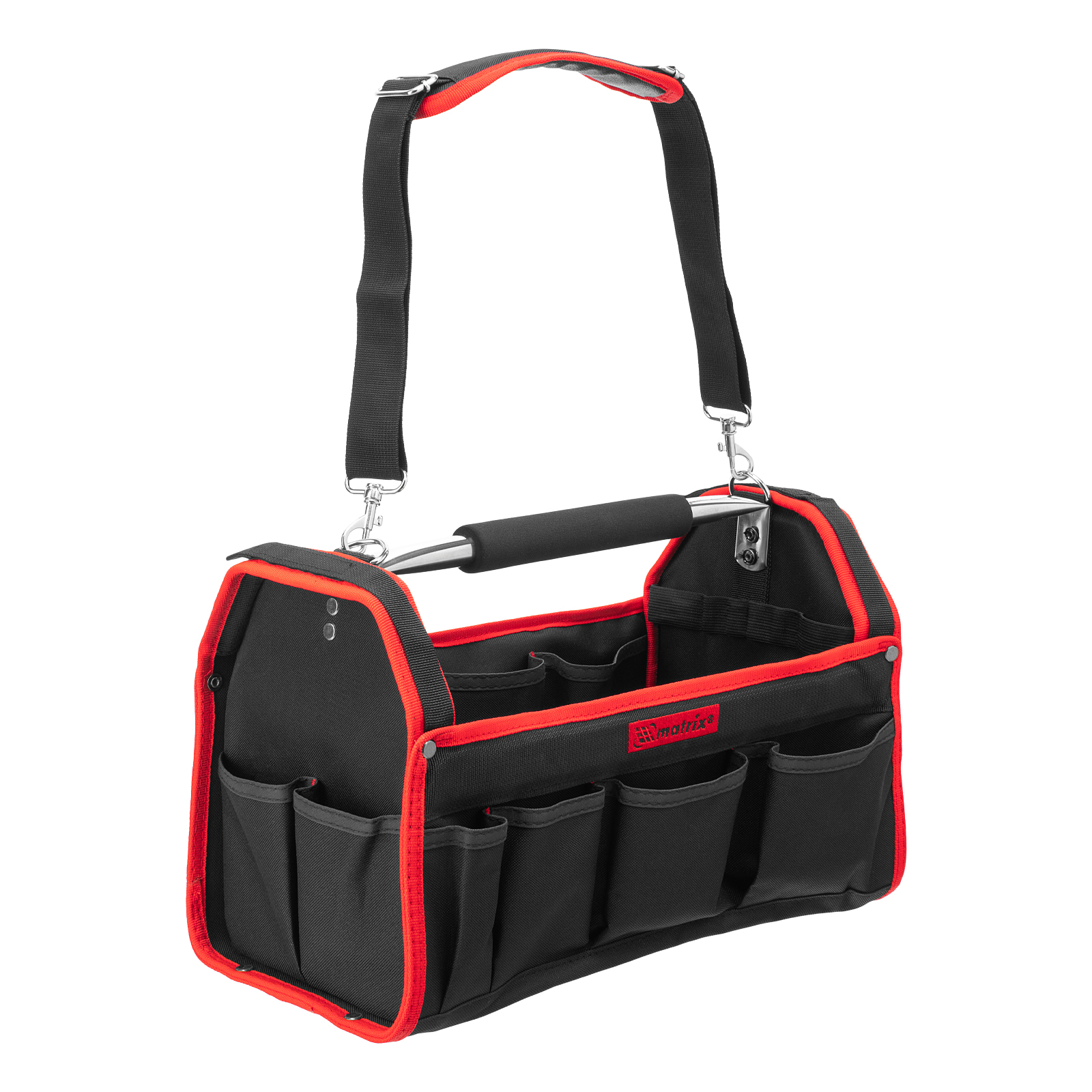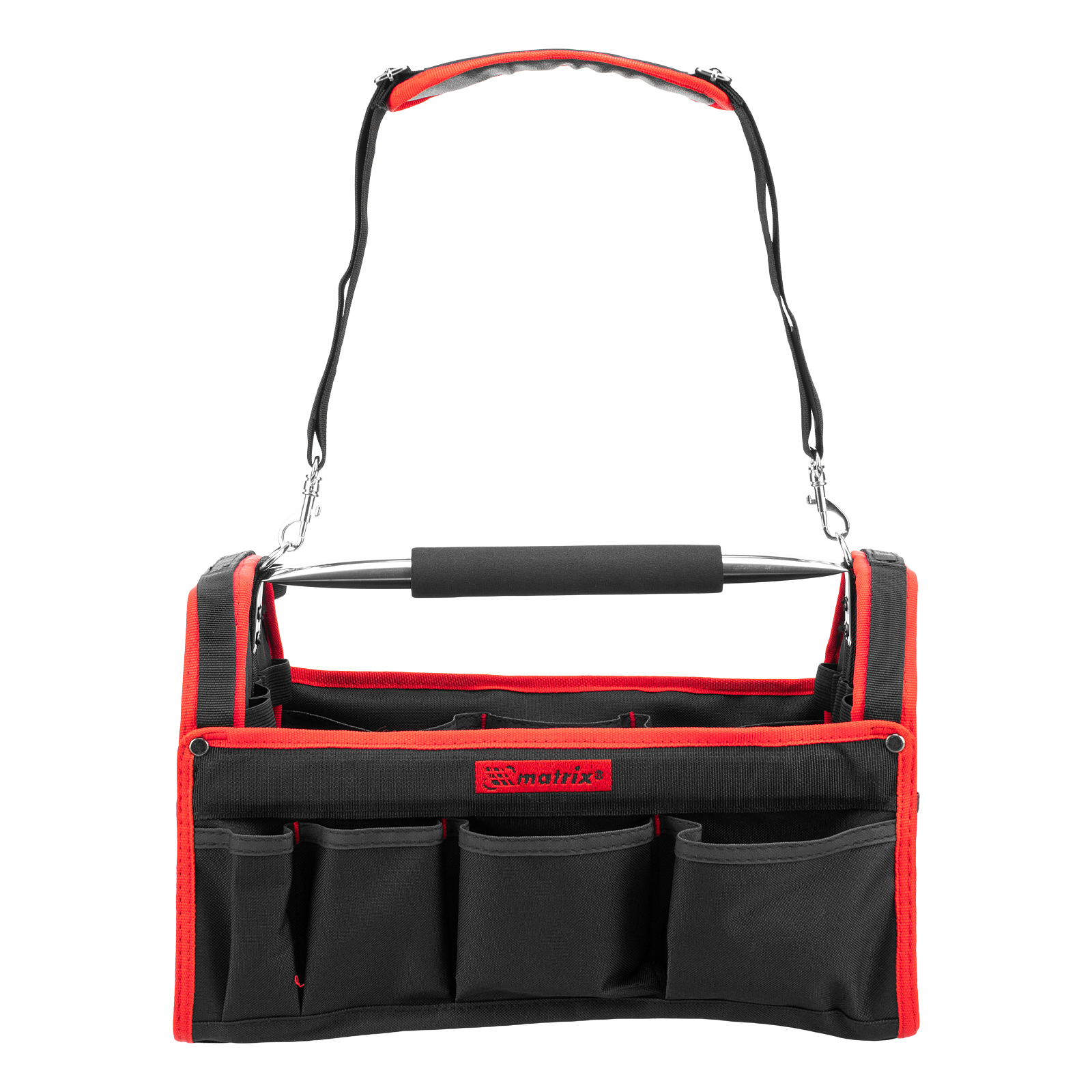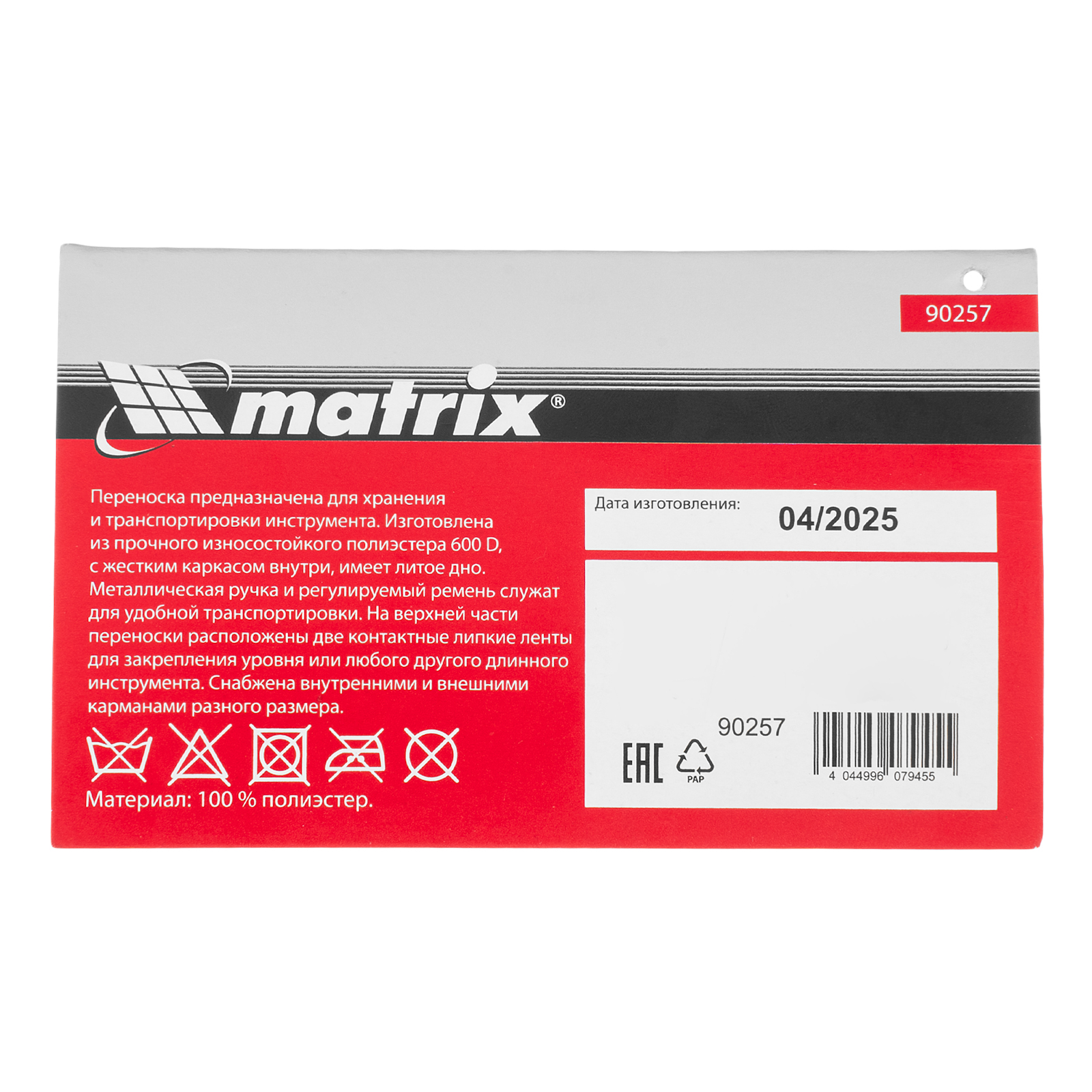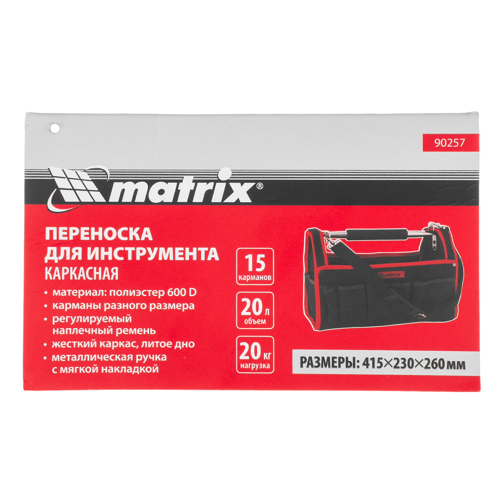 Каркасная переноска Matrix 90257 размером 415 х 230 х 260 мм удобна для перемещения и хранения инструментов. Имеет прочный каркас и весит 1,35 кг, ее легко переносить благодаря регулируемому плечевому ремню. В удобных карманах можно расположить все необходимые инструменты. Переноска пригодится дома, в гараже или в поездке.