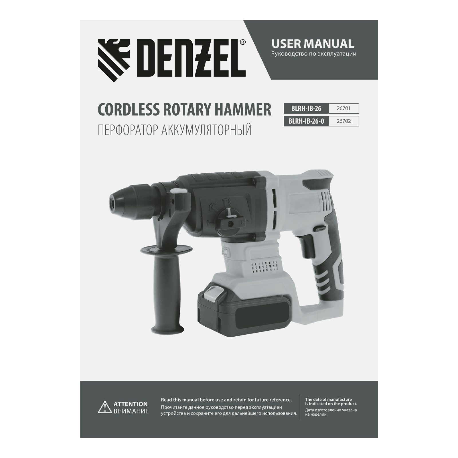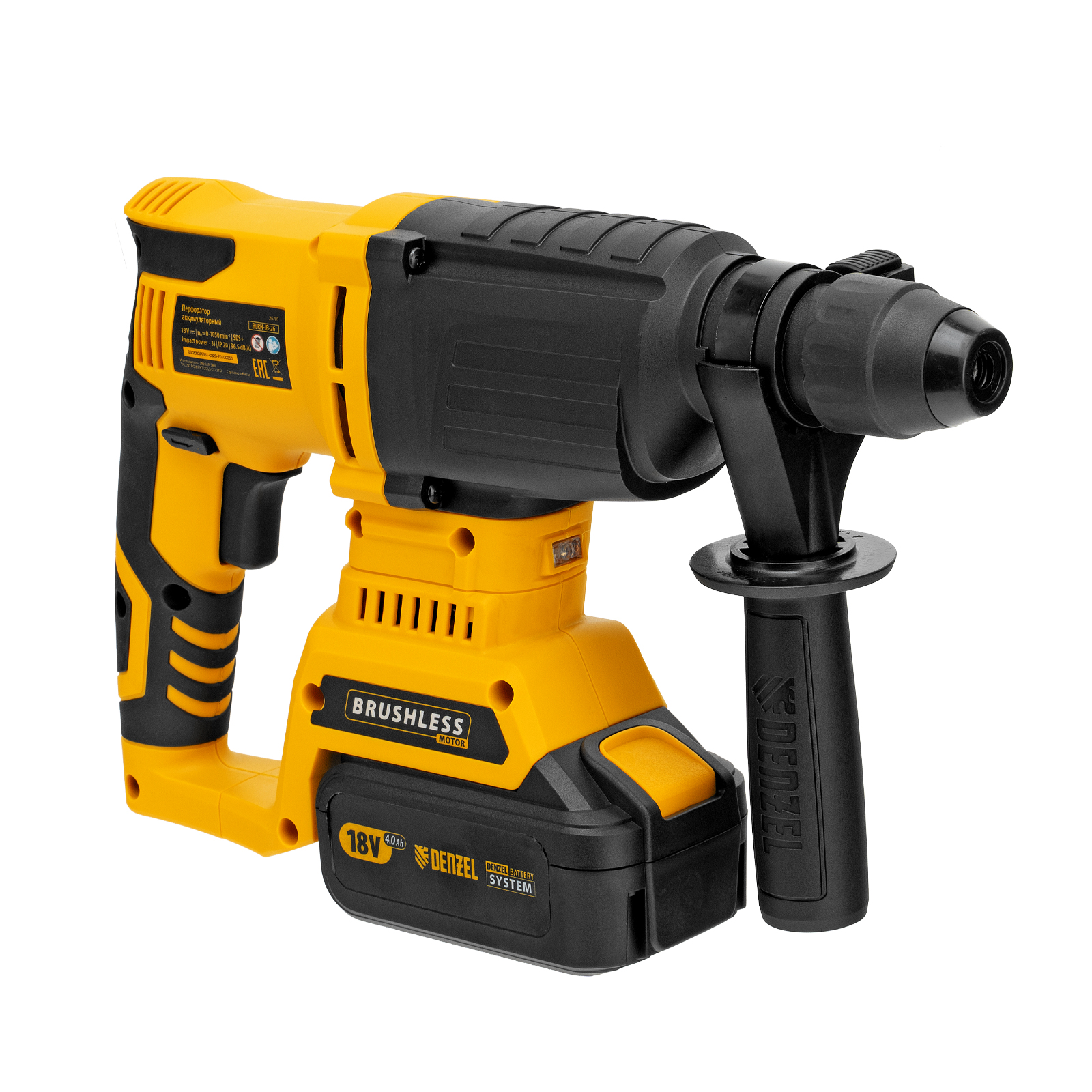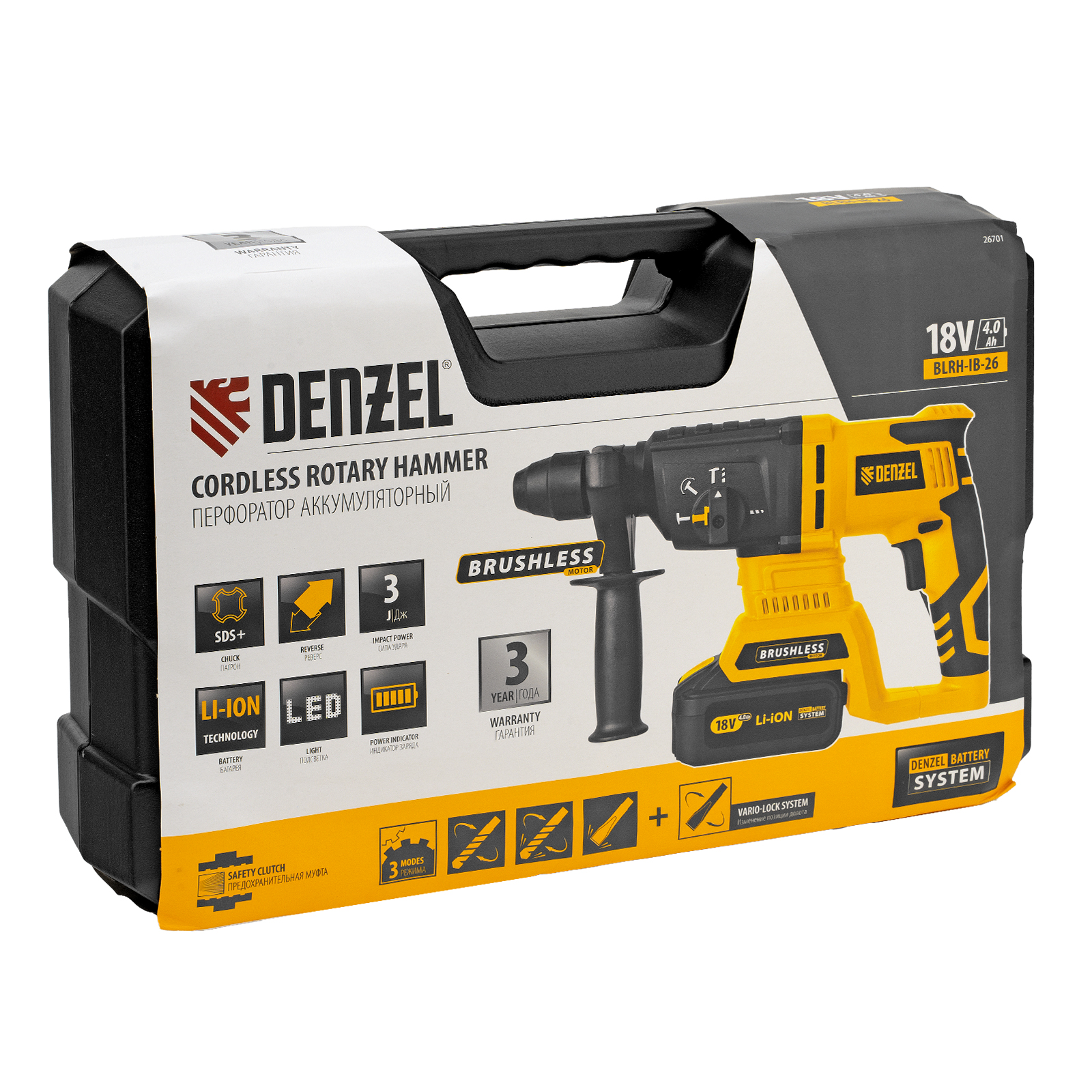 Аккумуляторный перфоратор Denzel BLRH-IB-26 26701 с аккумулятором Li-Ion емкостью 4 Ач и напряжением 18 В предназначен для сверления отверстий в различных материалах, а также для штробления стен, разрушения кирпичной кладки. Поддерживает несколько режимов работы: сверление, бурение, долбление + регулировка положения долота (опция Vario Lock). Максимальный диаметр отверстий в древесине составляет 40 мм, металле — 13 мм, бетоне — 26 мм. Инструмент совершает до 4800 ударов в минуту, развивая энергию до 3 Дж, чем обусловлена его высокая производительность и эффективная работа с твердыми материалами. Перфоратор пригодится для проведения строительных и ремонтных работ.