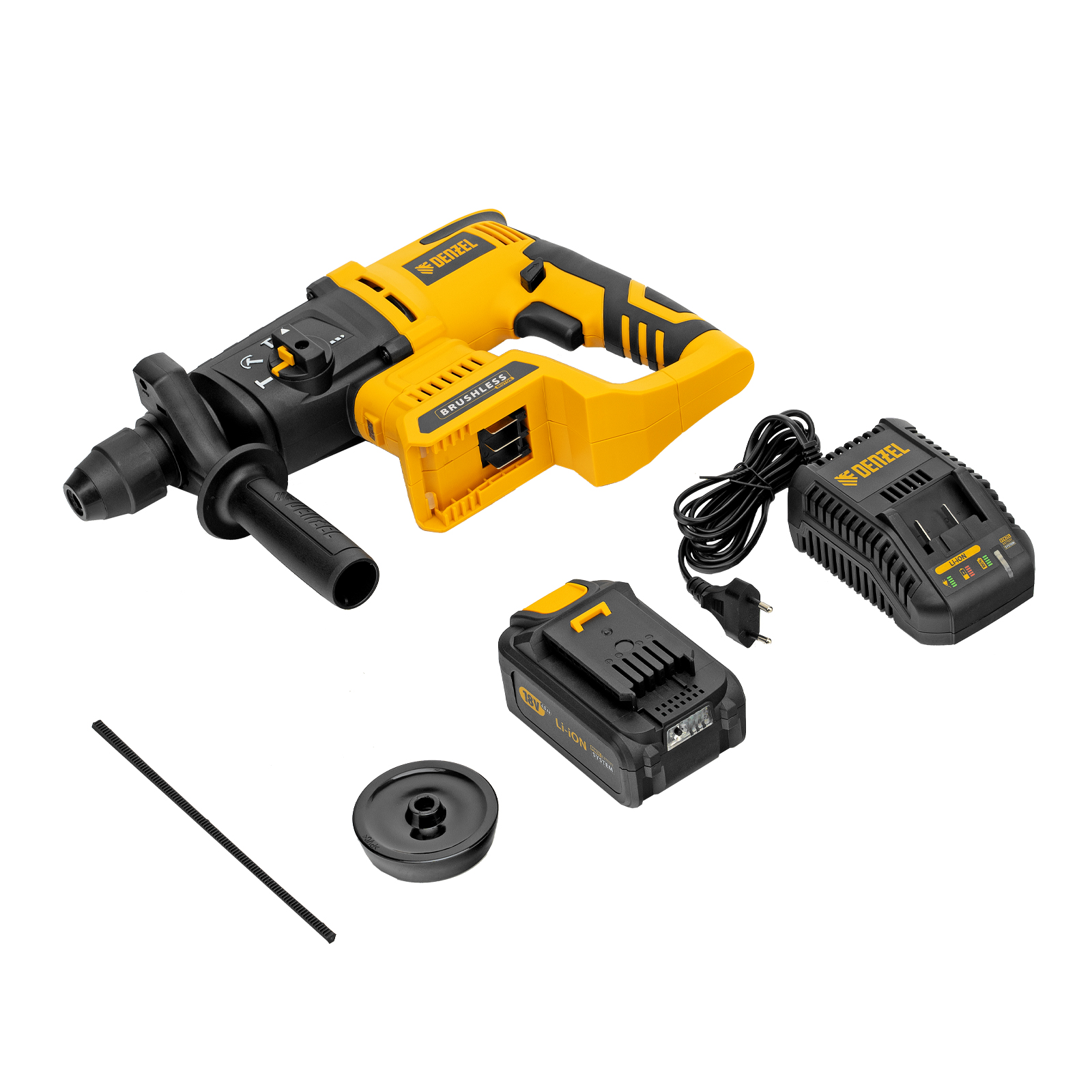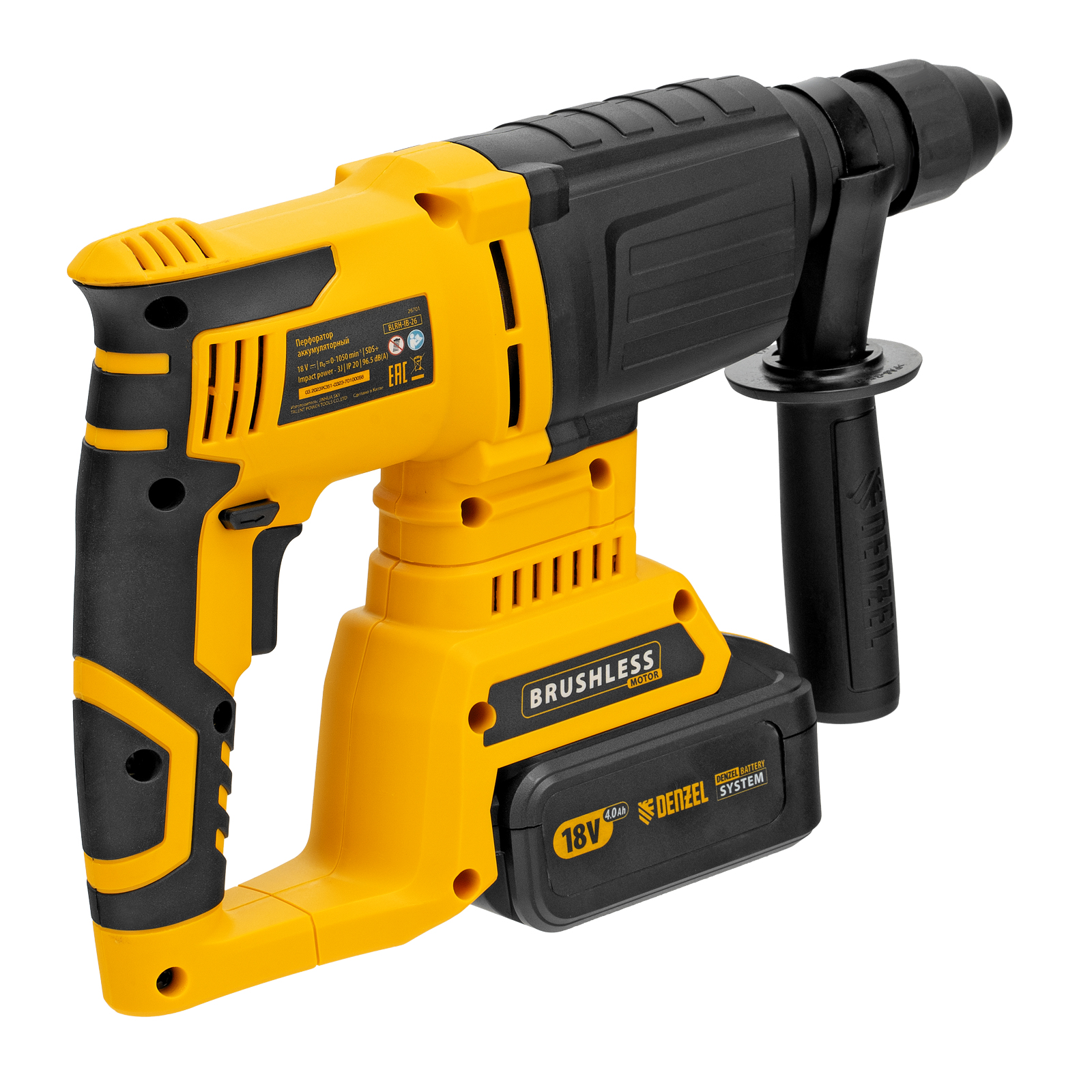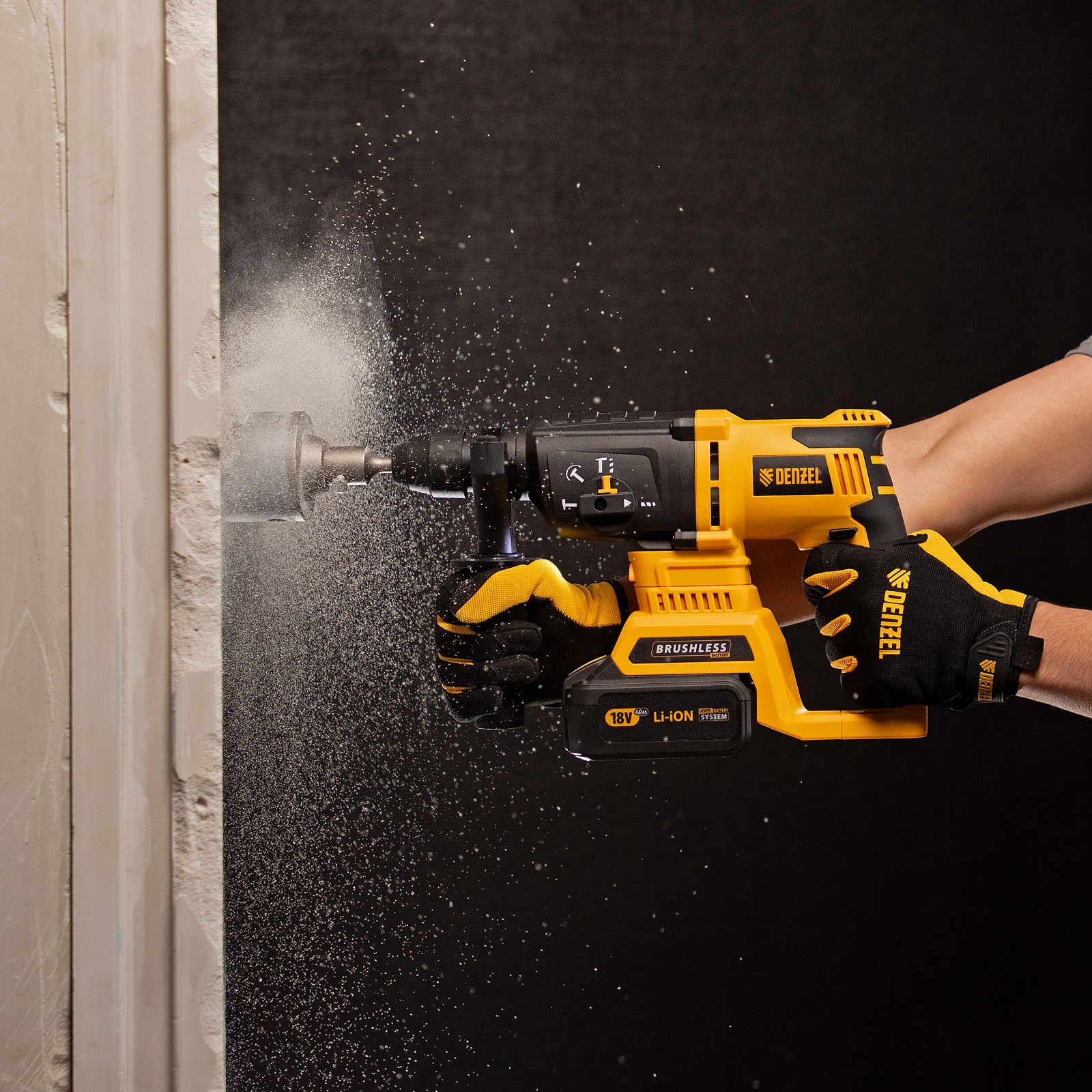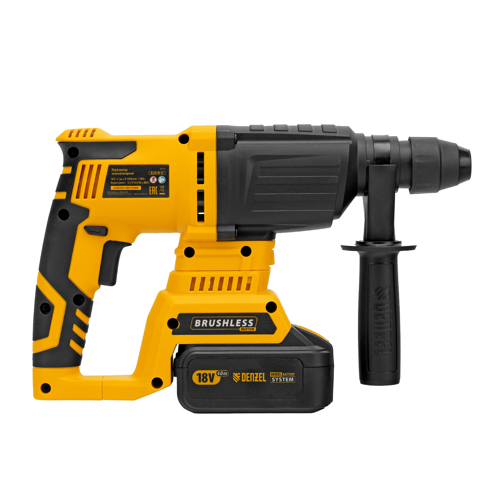 Аккумуляторный перфоратор Denzel BLRH-IB-26 26701 с аккумулятором Li-Ion емкостью 4 Ач и напряжением 18 В предназначен для сверления отверстий в различных материалах, а также для штробления стен, разрушения кирпичной кладки. Поддерживает несколько режимов работы: сверление, бурение, долбление + регулировка положения долота (опция Vario Lock). Максимальный диаметр отверстий в древесине составляет 40 мм, металле — 13 мм, бетоне — 26 мм. Инструмент совершает до 4800 ударов в минуту, развивая энергию до 3 Дж, чем обусловлена его высокая производительность и эффективная работа с твердыми материалами. Перфоратор пригодится для проведения строительных и ремонтных работ.