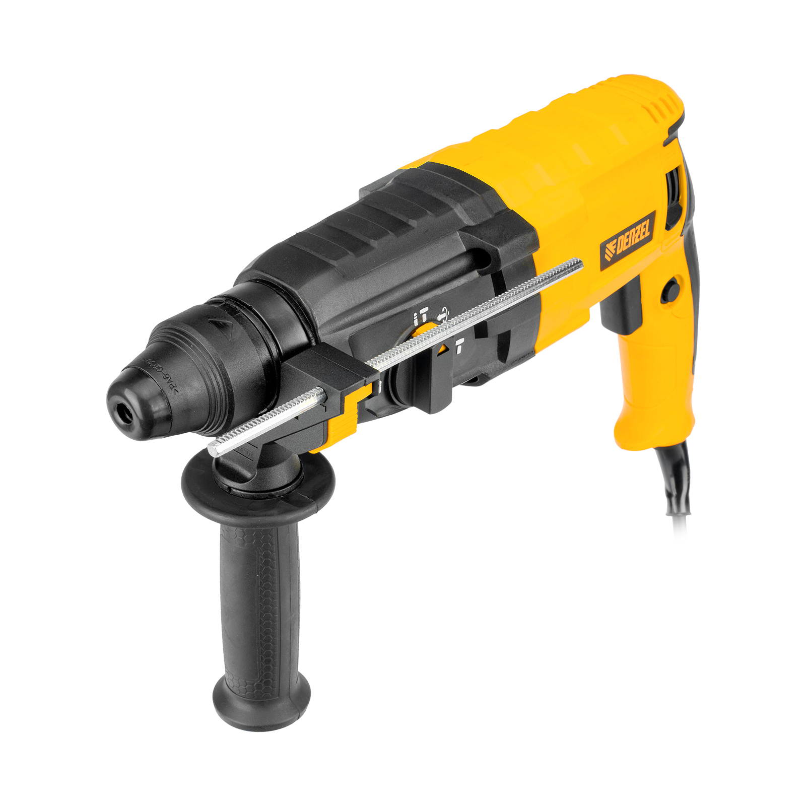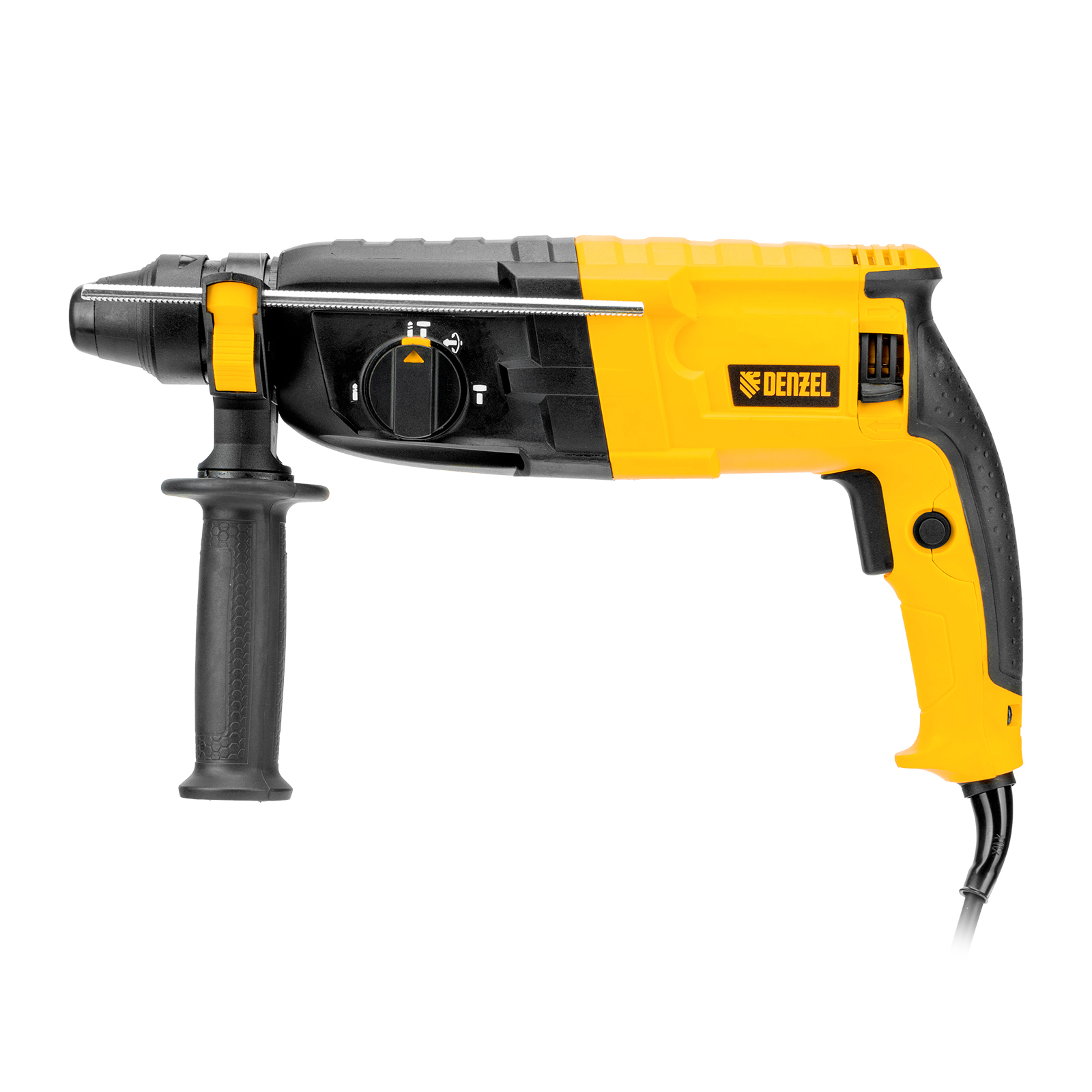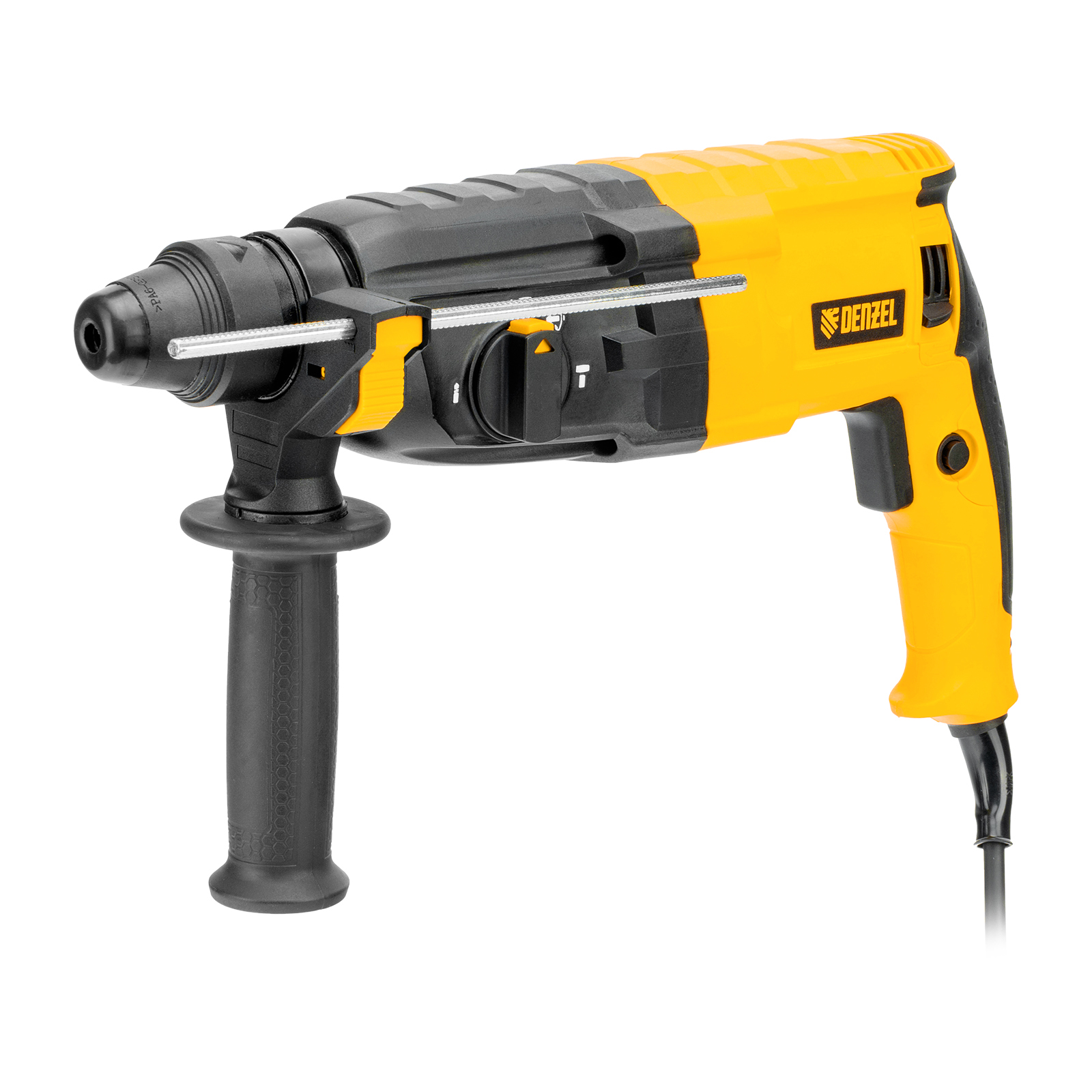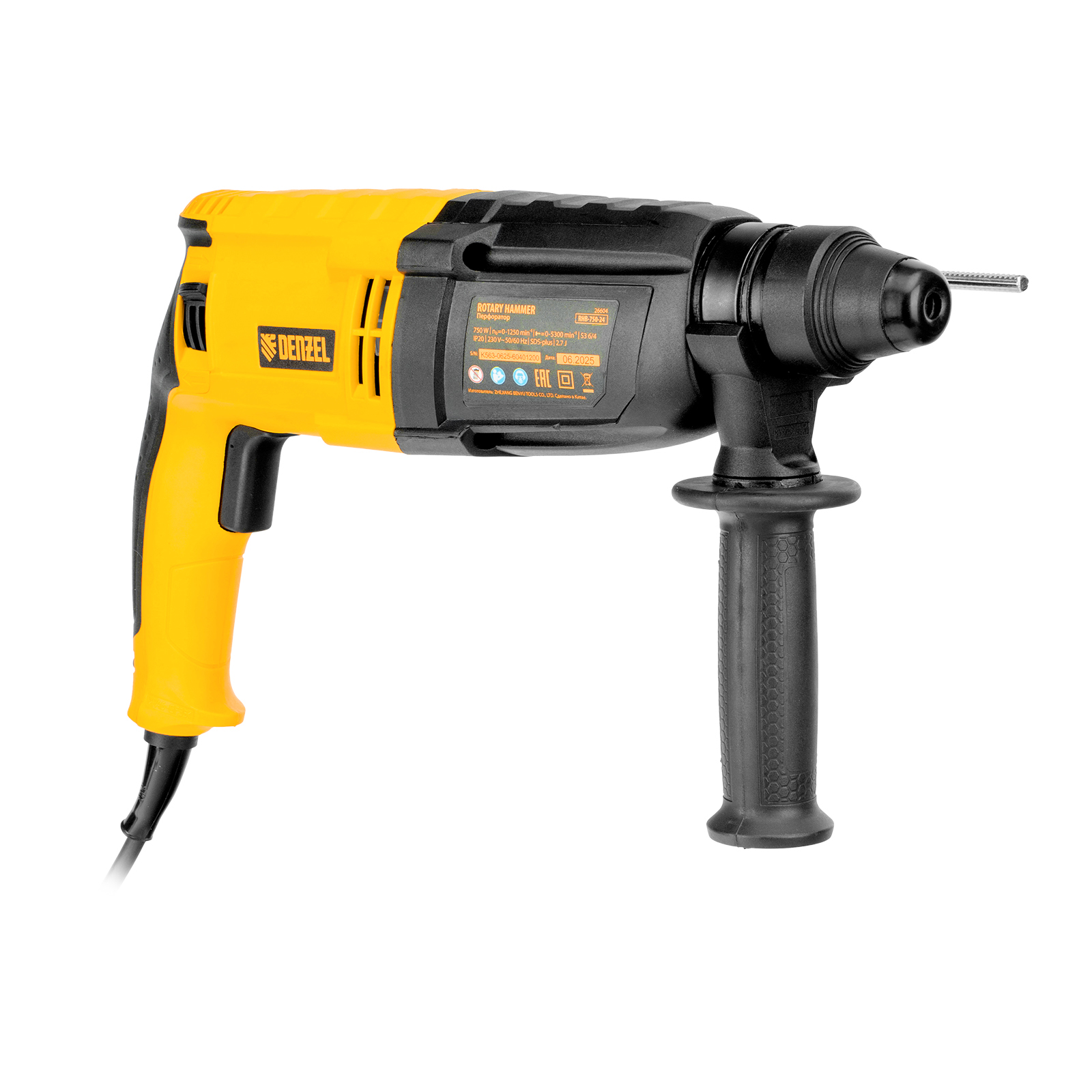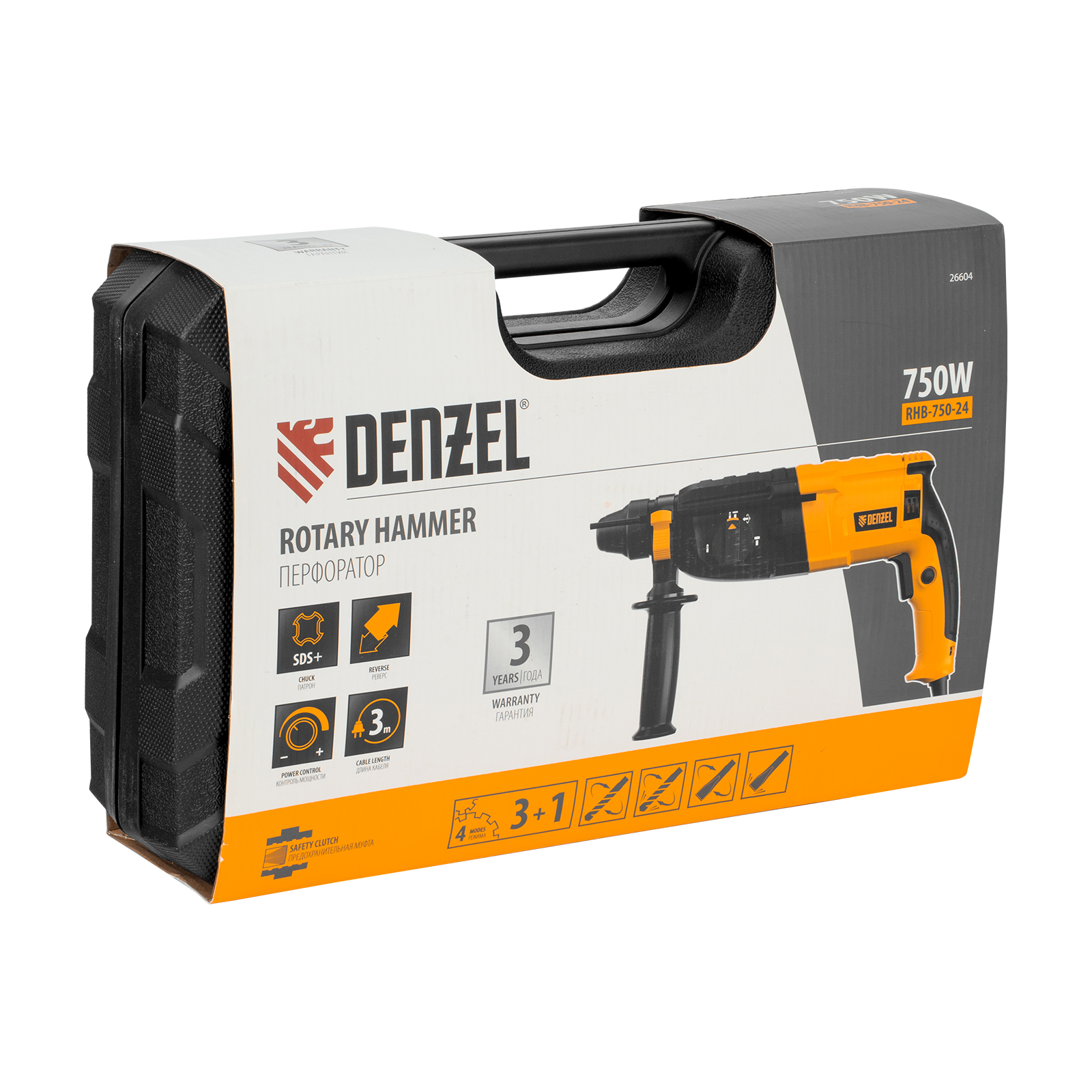 Электрический перфоратор Denzel RHB-750-24 26604 мощностью 750 Вт предназначен для оснастки с хвостовиком SDS Plus, имеет энергию удара 2,7 Дж и работает в одном из 3 режимов (сверление, бурение, долбление) + функция изменения положения долота. Позволяет сверлить отверстия, бурить кирпичную кладку, камень и бетон, штробить стены, удалять старые покрытия (плитку), проводить демонтажные работы. Максимальный диаметр сверления в бетоне составляет 24 мм, в древесине — 30 мм, стали — 13 мм. Также перфоратор совместим с коронками диаметром до 68 мм.