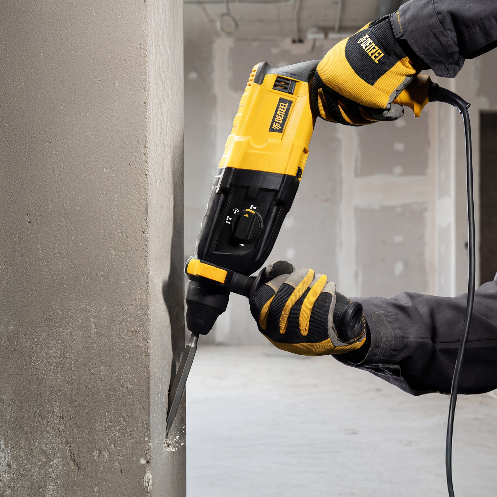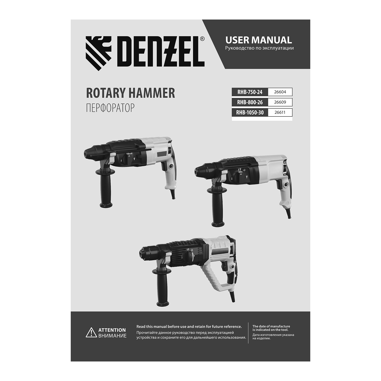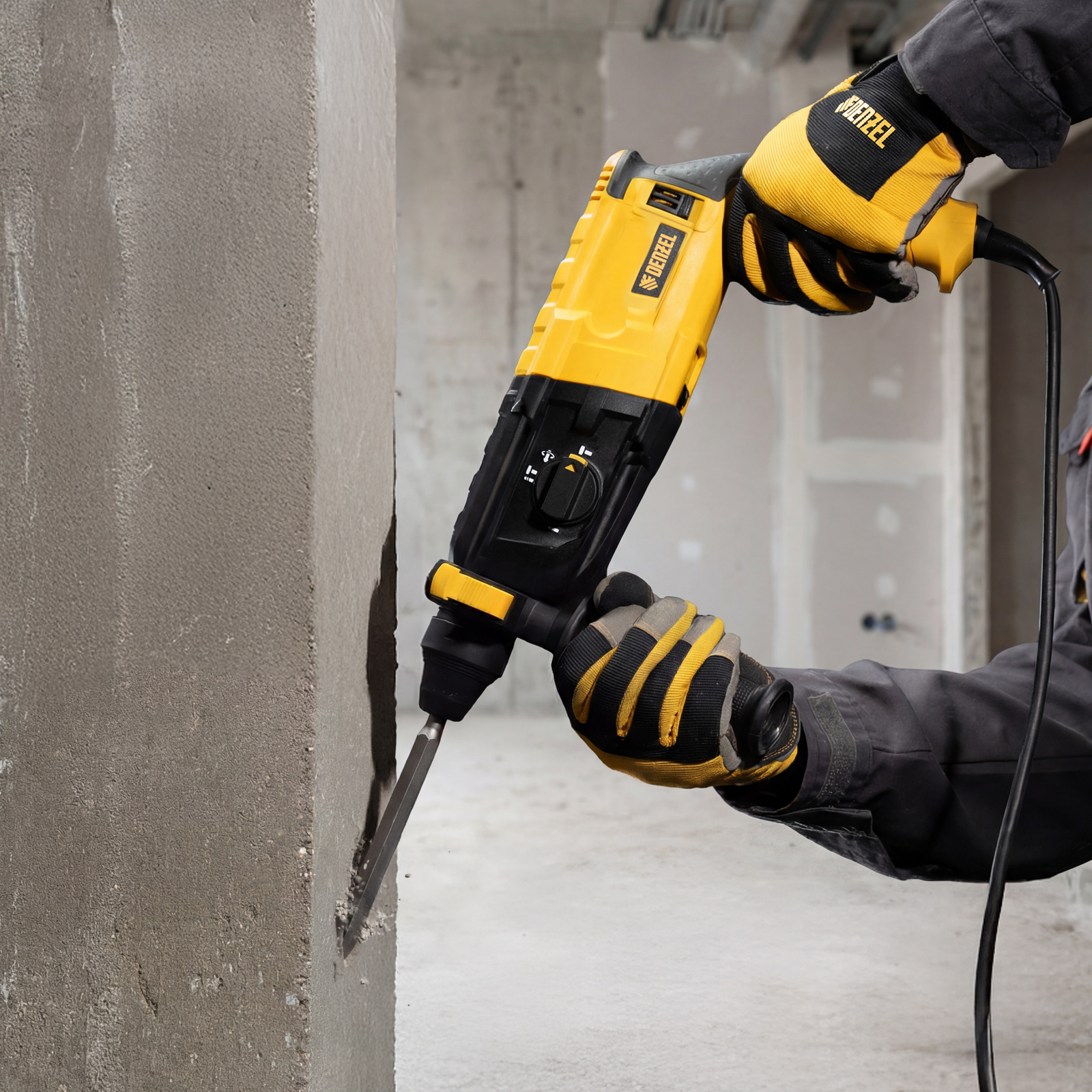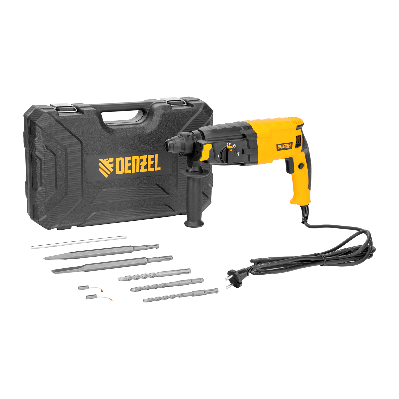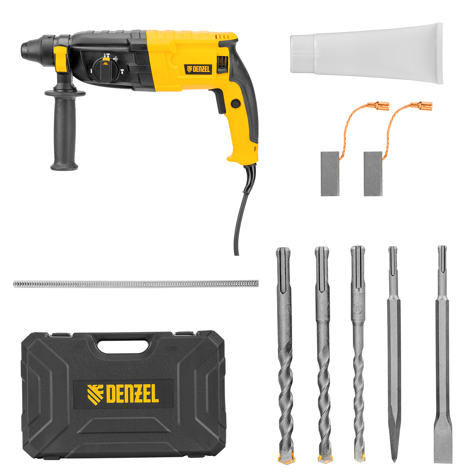 Электрический перфоратор Denzel RHB-750-24 26604 мощностью 750 Вт предназначен для оснастки с хвостовиком SDS Plus, имеет энергию удара 2,7 Дж и работает в одном из 3 режимов (сверление, бурение, долбление) + функция изменения положения долота. Позволяет сверлить отверстия, бурить кирпичную кладку, камень и бетон, штробить стены, удалять старые покрытия (плитку), проводить демонтажные работы. Максимальный диаметр сверления в бетоне составляет 24 мм, в древесине — 30 мм, стали — 13 мм. Также перфоратор совместим с коронками диаметром до 68 мм.
