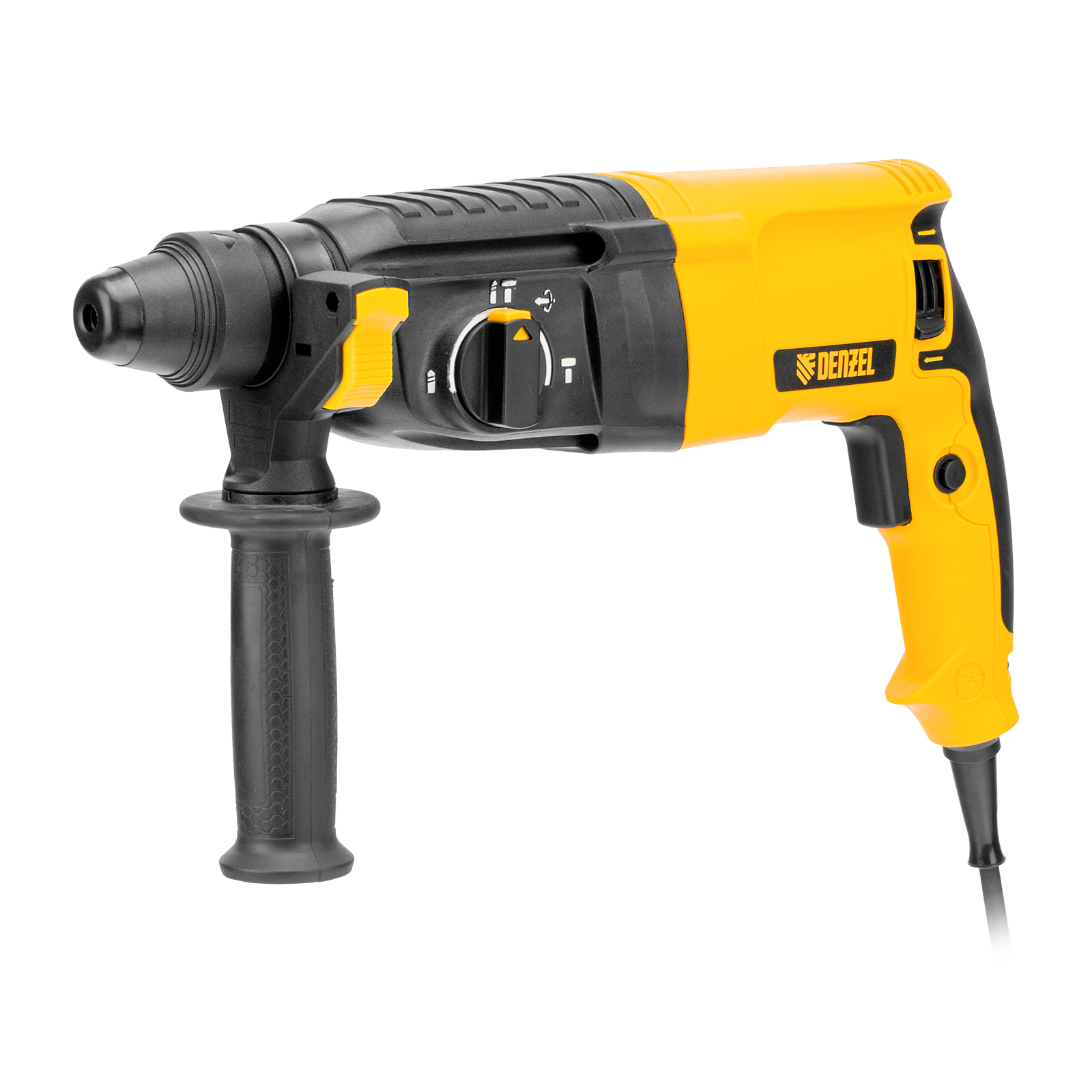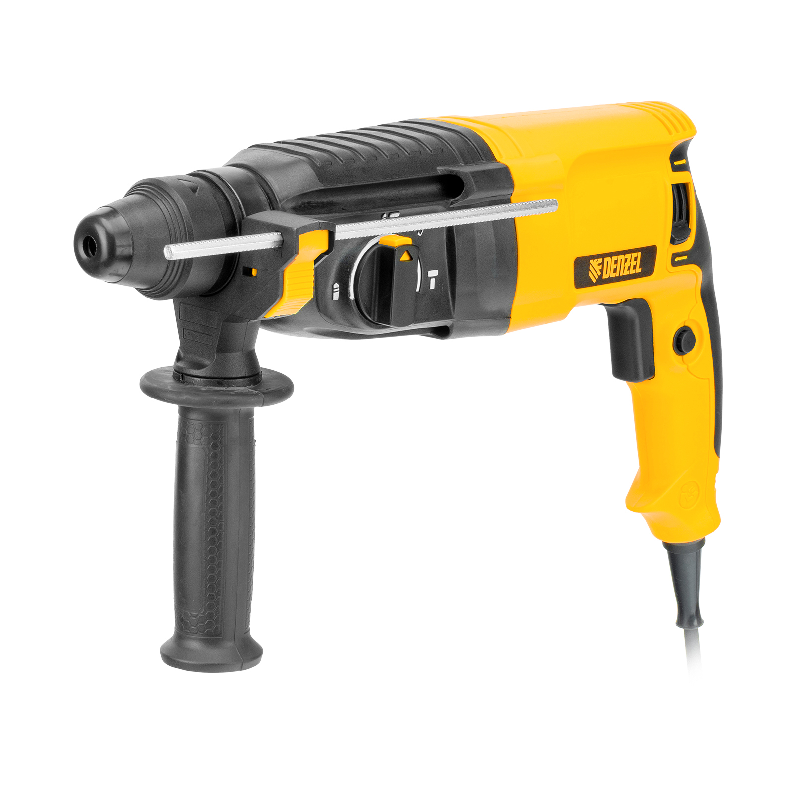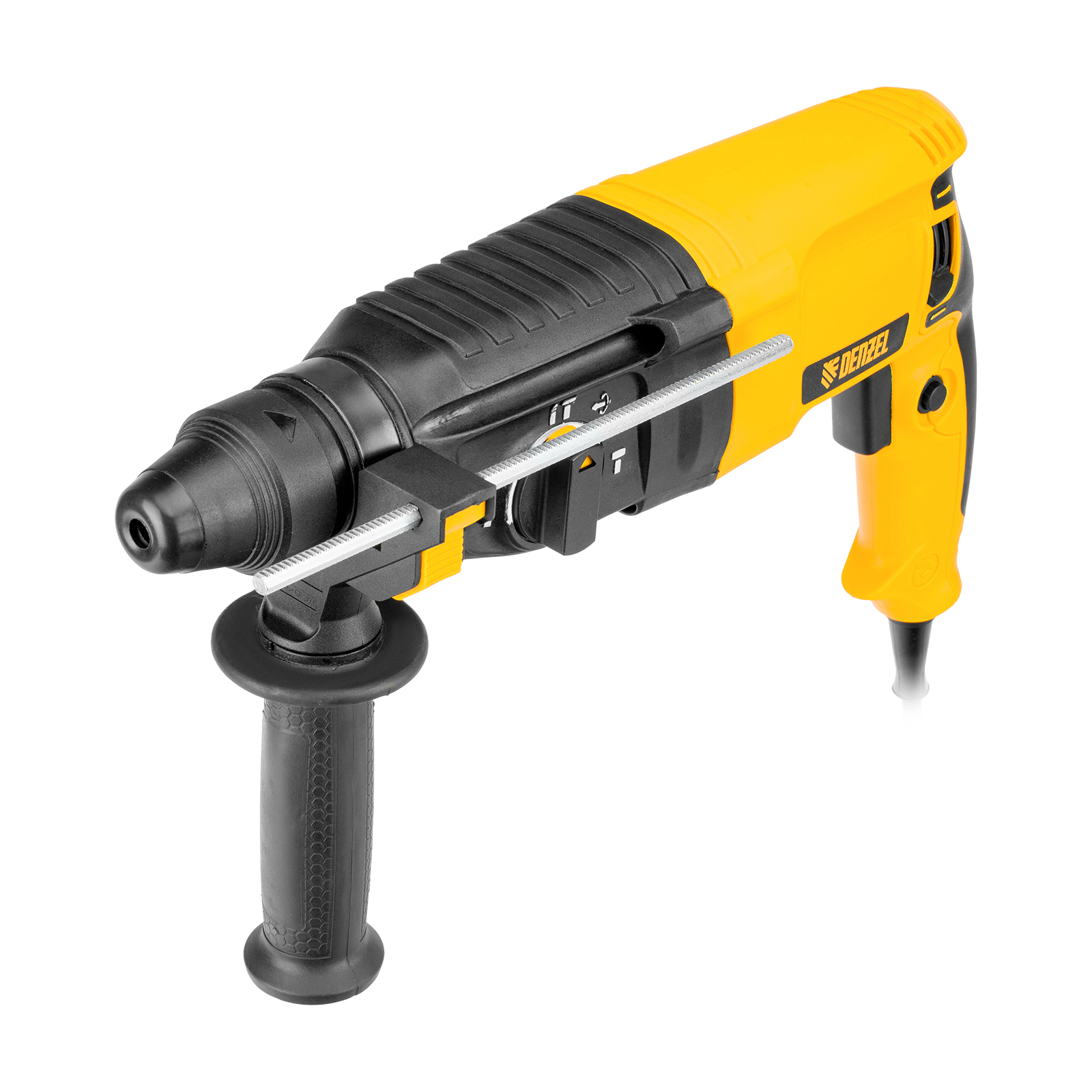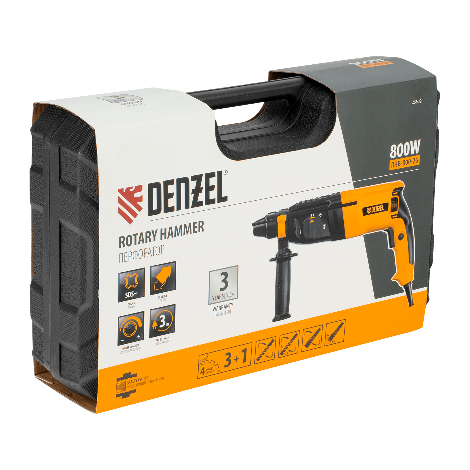 Электрический перфоратор Denzel RHB-800-26 26609 мощностью 800 Вт предназначен для оснастки с хвостовиком SDS Plus, имеет энергию удара 3 Дж и работает в одном из 3 режимов (сверление, бурение, долбление) + функция изменения углового положения долота. Позволяет сверлить отверстия, бурить кирпичную кладку, камень и бетон, штробить стены, удалять старые покрытия (плитку), проводить демонтажные работы. Максимальный диаметр сверления в бетоне составляет 26 мм, в древесине — 30 мм, стали — 13 мм. Также перфоратор совместим с коронками диаметром до 68 мм.