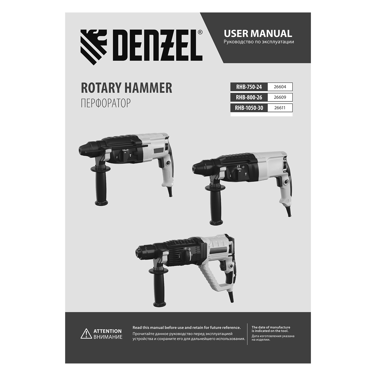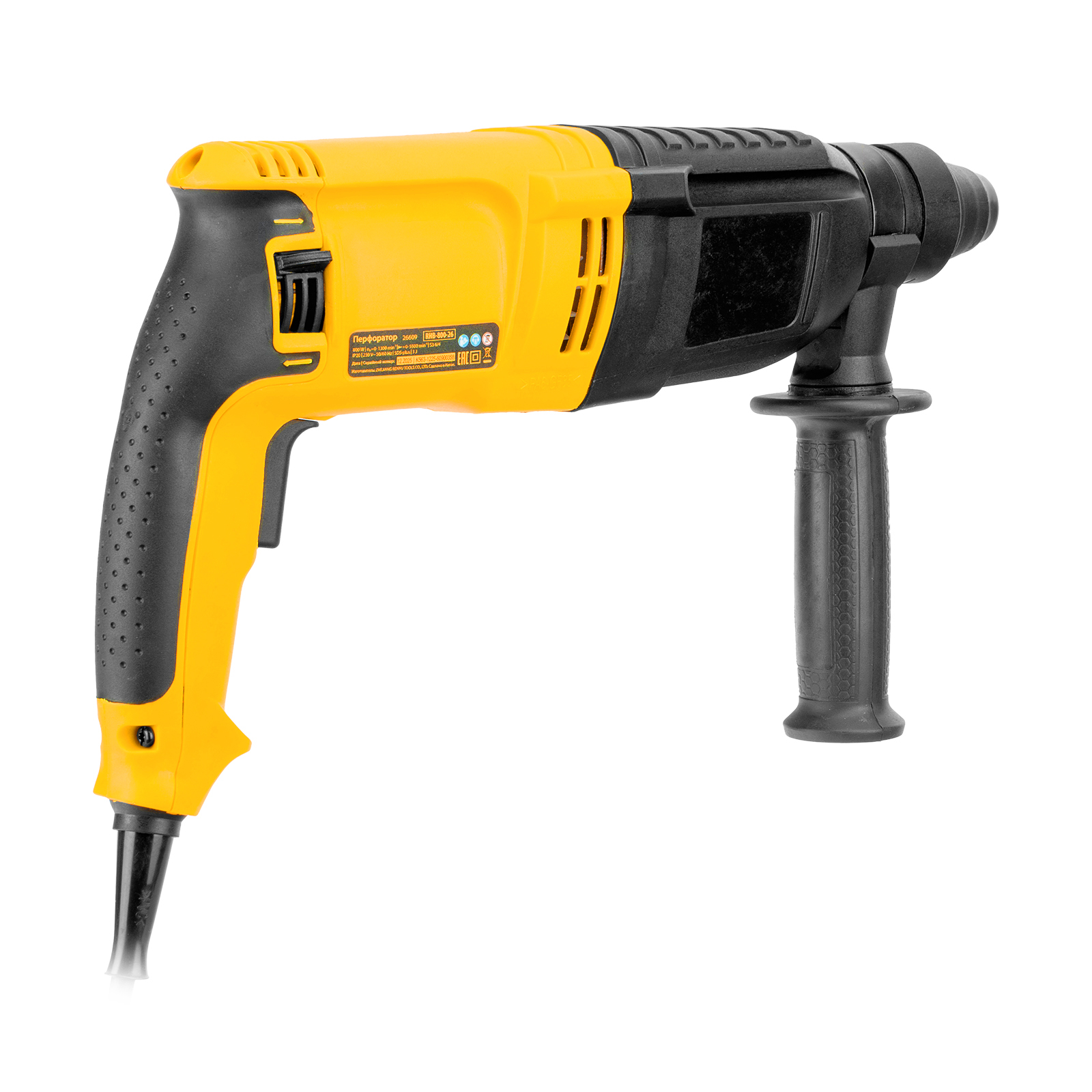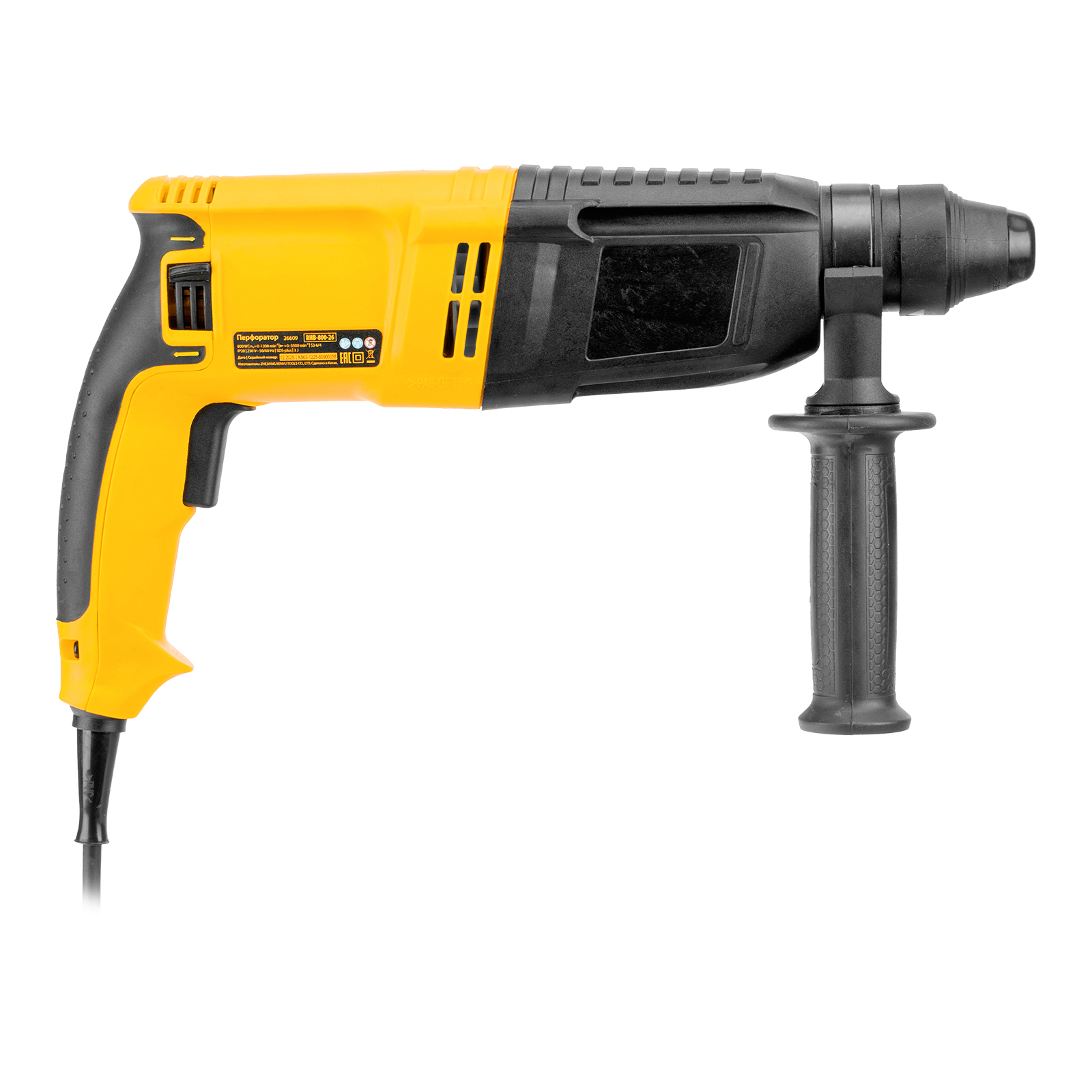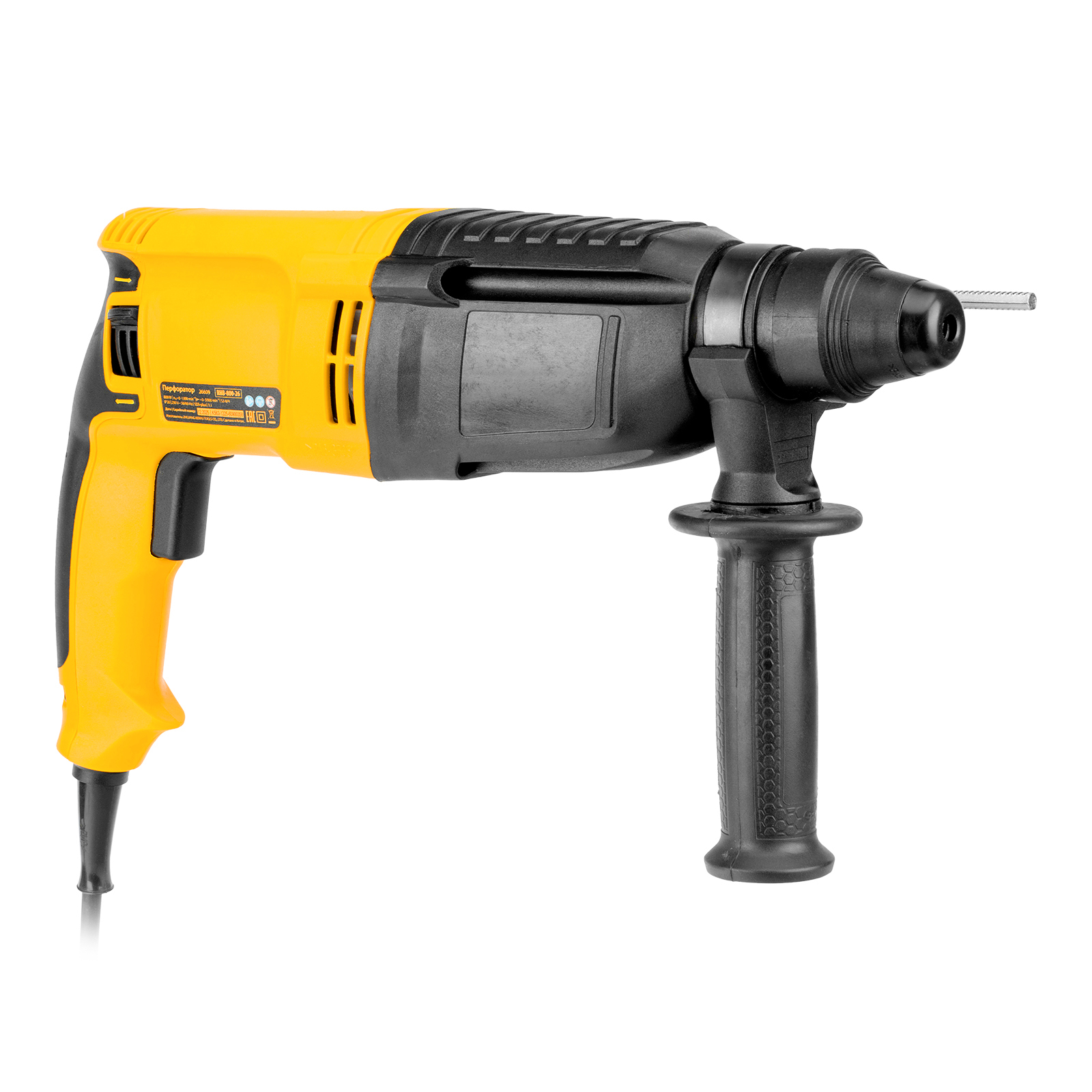 Электрический перфоратор Denzel RHB-800-26 26609 мощностью 800 Вт предназначен для оснастки с хвостовиком SDS Plus, имеет энергию удара 3 Дж и работает в одном из 3 режимов (сверление, бурение, долбление) + функция изменения углового положения долота. Позволяет сверлить отверстия, бурить кирпичную кладку, камень и бетон, штробить стены, удалять старые покрытия (плитку), проводить демонтажные работы. Максимальный диаметр сверления в бетоне составляет 26 мм, в древесине — 30 мм, стали — 13 мм. Также перфоратор совместим с коронками диаметром до 68 мм.