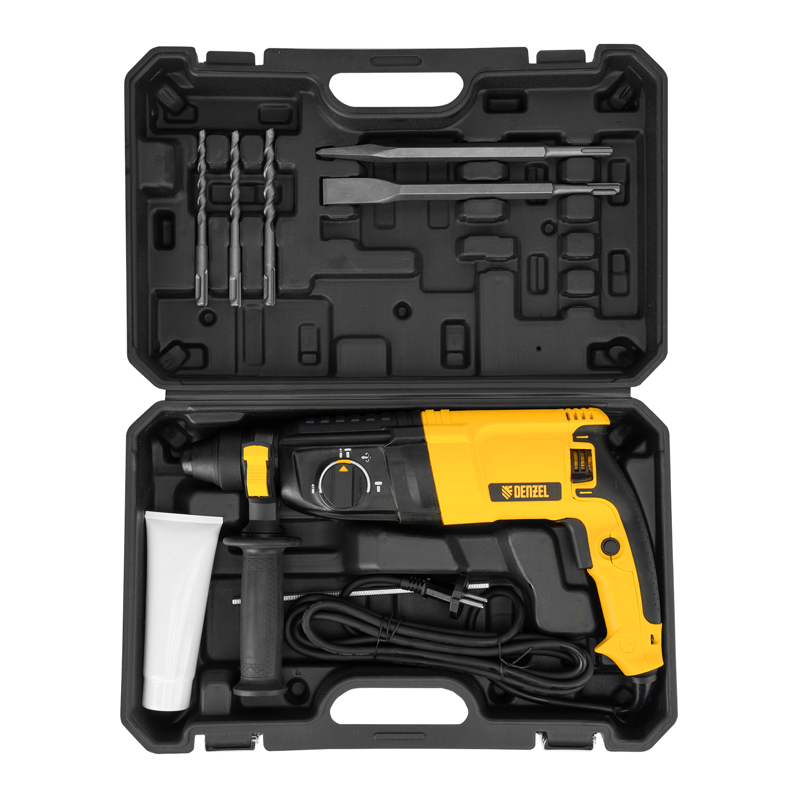 - Удобное хранение и транспортировка — перфоратор и аксессуары упакованы в прочный кейс.