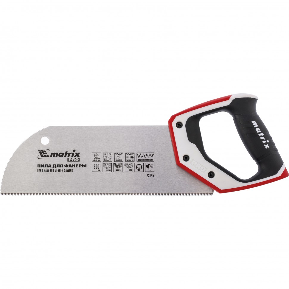 Пила для фанеры с запилом Matrix PRO 23145 с полотном длиной 300 мм, с калеными зубьями с 3D-заточкой и шагом 11-12 TPI, с трехкомпонентной рукояткой, используется для проведения столярных работ. Пилит древесину, фанеру, ДСП в продольном и поперечном направлении. Подходит для работы со стуслом. Благодаря мелким зубьям с шагом 2-2,3 мм рез получается ровным и гладким. Трехгранная заточка зубьев повышает производительность инструмента. Запил в передней части полотна облегчает начало распиловки.