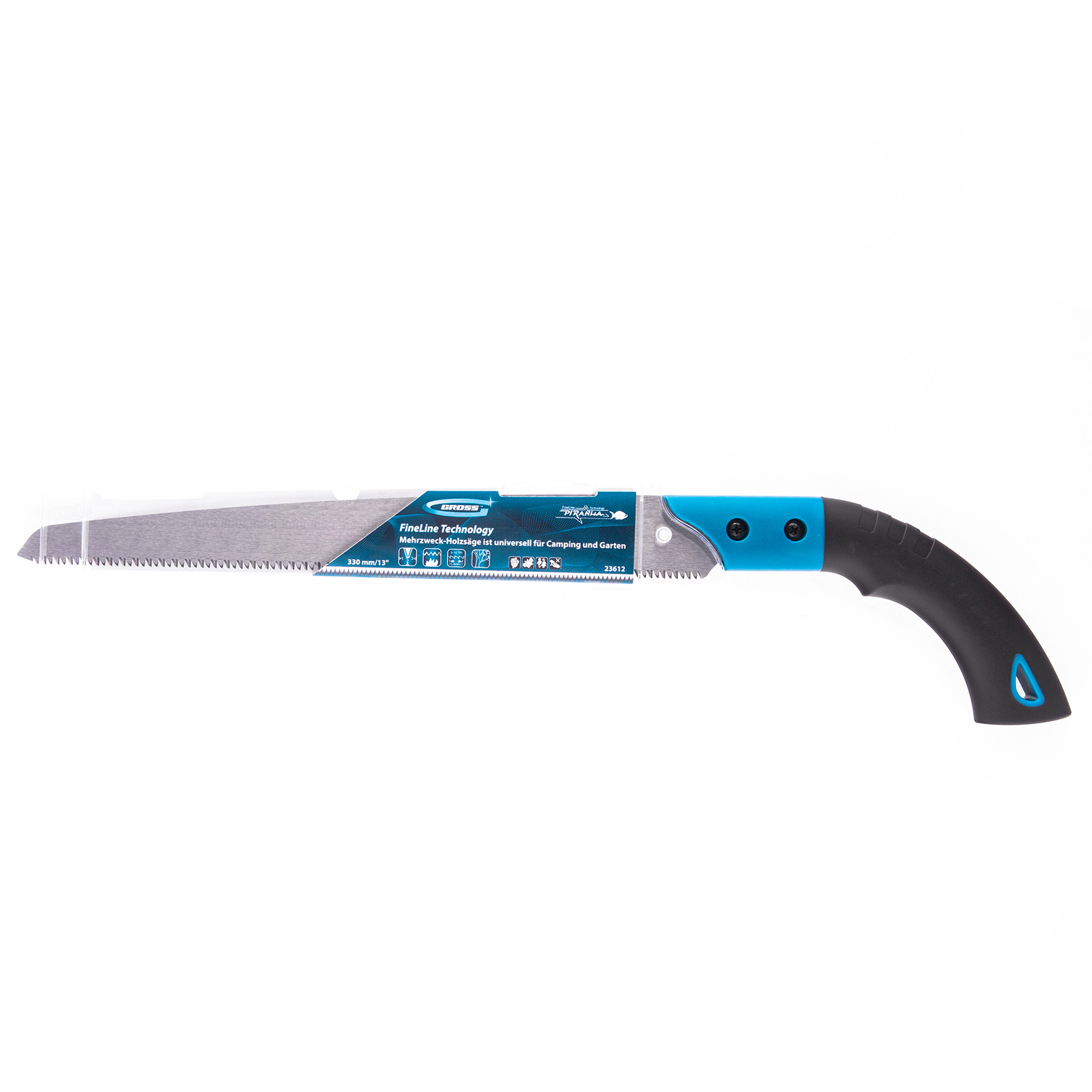 Универсальная пила по дереву Gross PIRANHA 23612 с полотном длиной 330 мм, калеными зубьями с шагом 9-10 TPI и 3D-заточкой, с 2-компонентной рукояткой, используется во время работ в саду и кемпинге. С ее помощью можно обрезать сучья или заготовить материал для растопки. Также пила подходит для распиловки фанеры, ДВП, ПВХ. Выполняет продольный и поперечный распил. Зубья с шагом 9-10 TPI и трехгранной заточкой обеспечивают высокую производительность инструмента. Благодаря высококачественной заточке зубьев характеристики режущей кромки соответствуют всем международным стандартам.