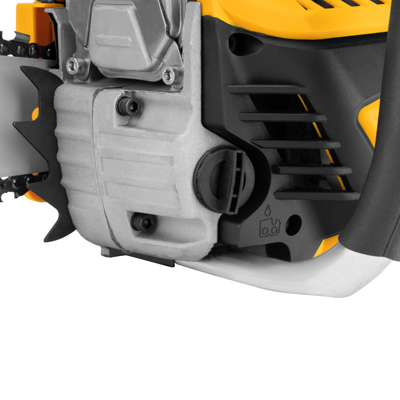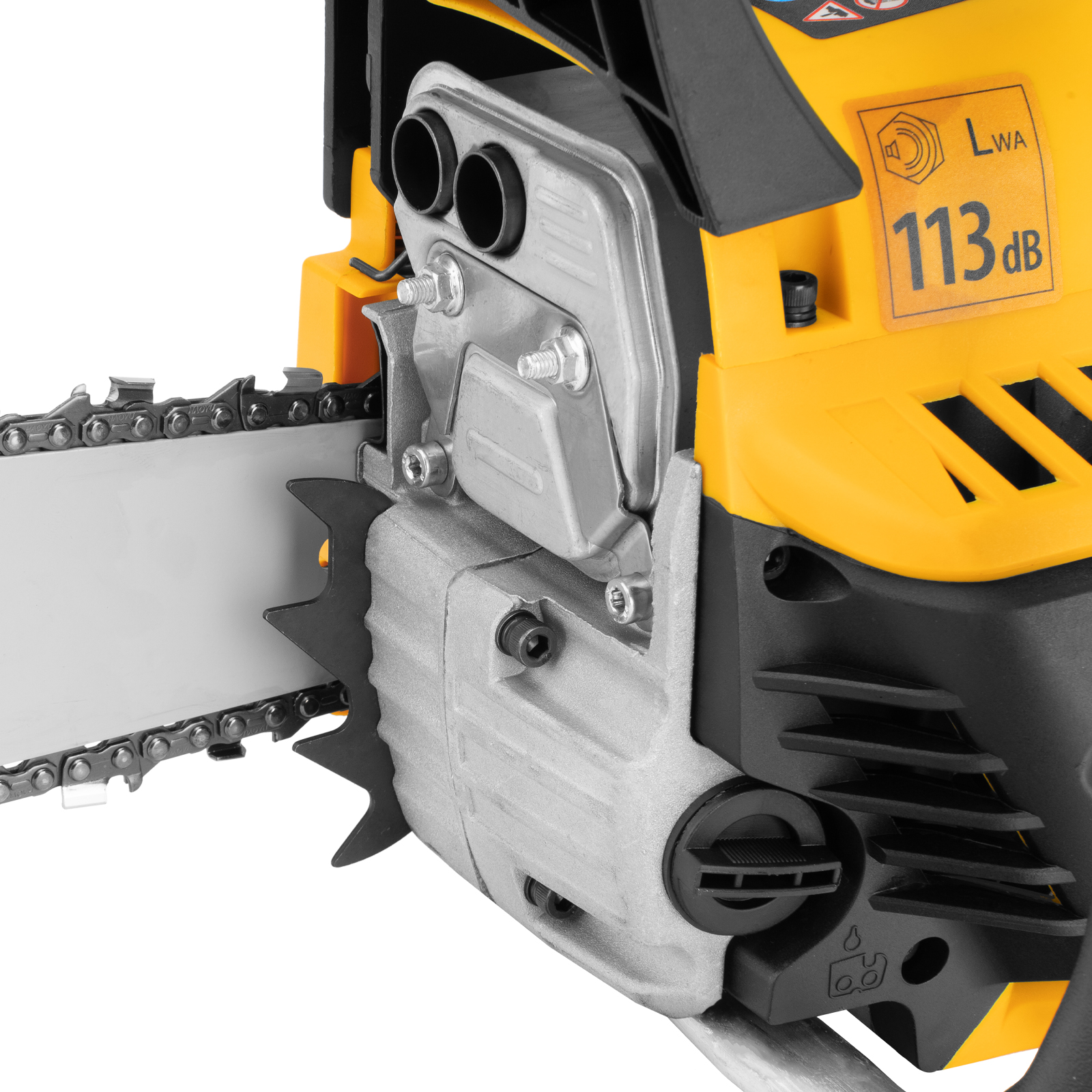- Безопасная работа — блокировка от случайного запуска и моментальное срабатывание тормоза цепи при отскоке пилы снижают вероятность получения травм.