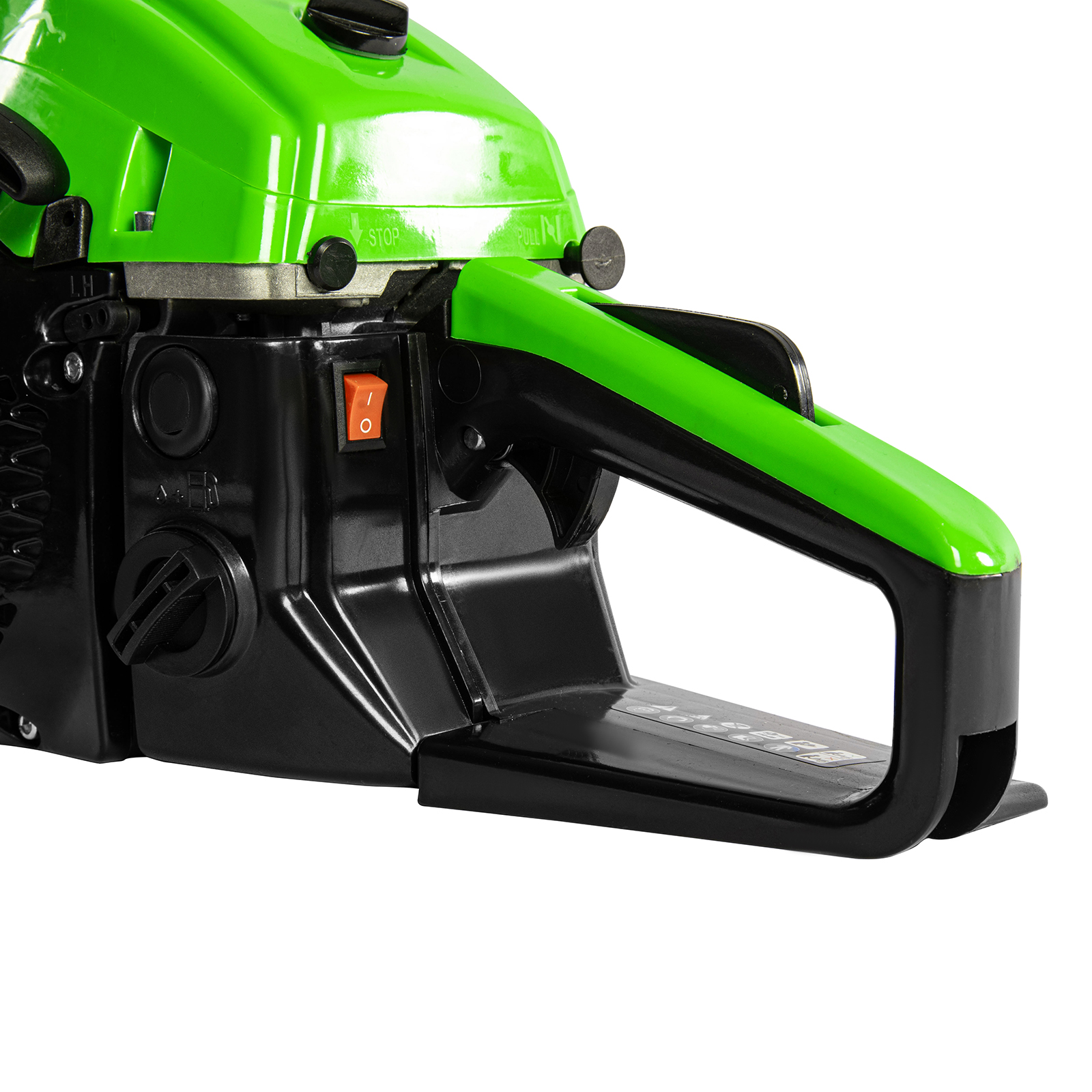 Безопасность — пила включается только после нажатия на клавишу блокировки газа, тормоз цепи мгновенно останавливает ее вращение при отскоке пилы.