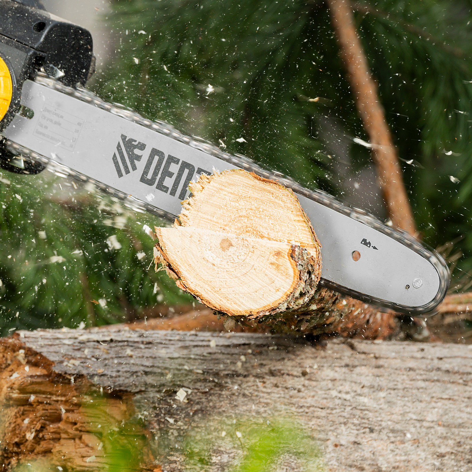 - Стальной зубчатый упор — электропила устойчиво фиксируется для распила бревен или деревьев, а мастер не устает и с легкостью может добиться аккуратной линии среза.