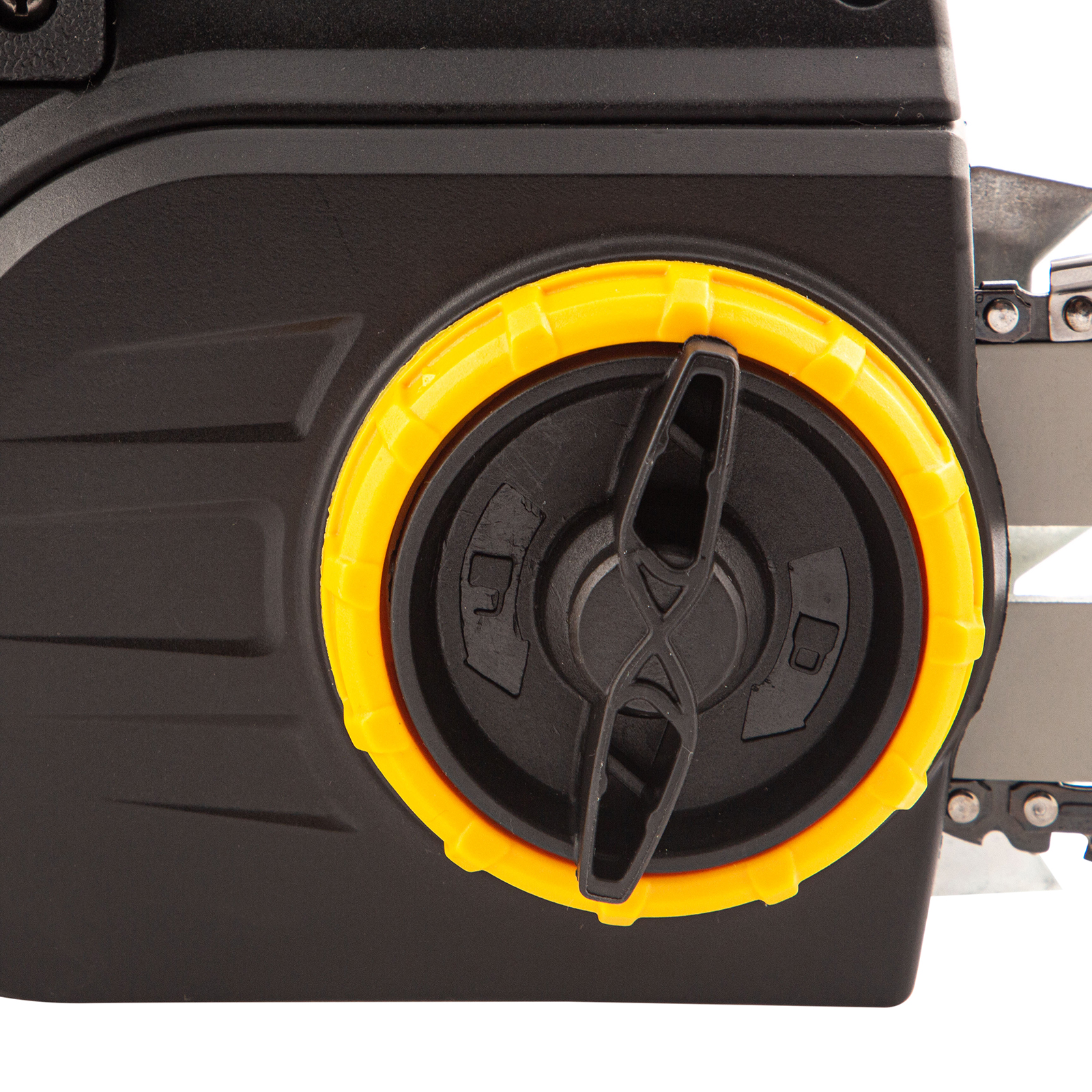 - Тормоз цепи — при сильной отдаче пилы мастер интуитивно бьет рукой об щиток и движение цепи моментально прекращается, благодаря этому снижается вероятность травм и потери контроля над инструментом.