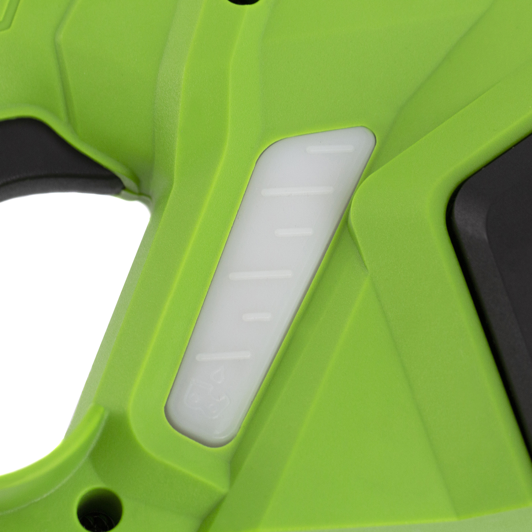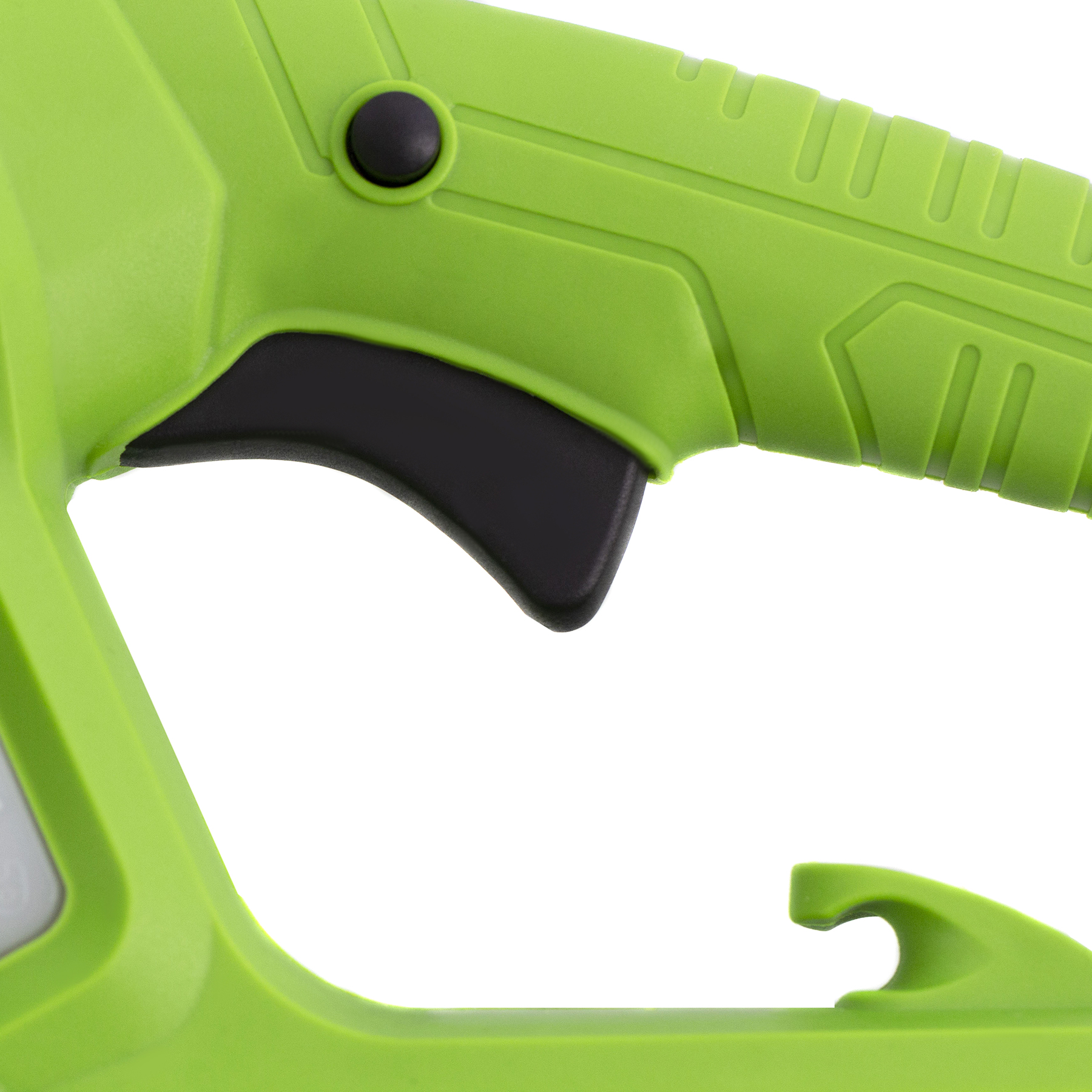 - Защита от случайного пуска — двигатель включается только при одновременном нажатии клавиши блокировки и выключателя.