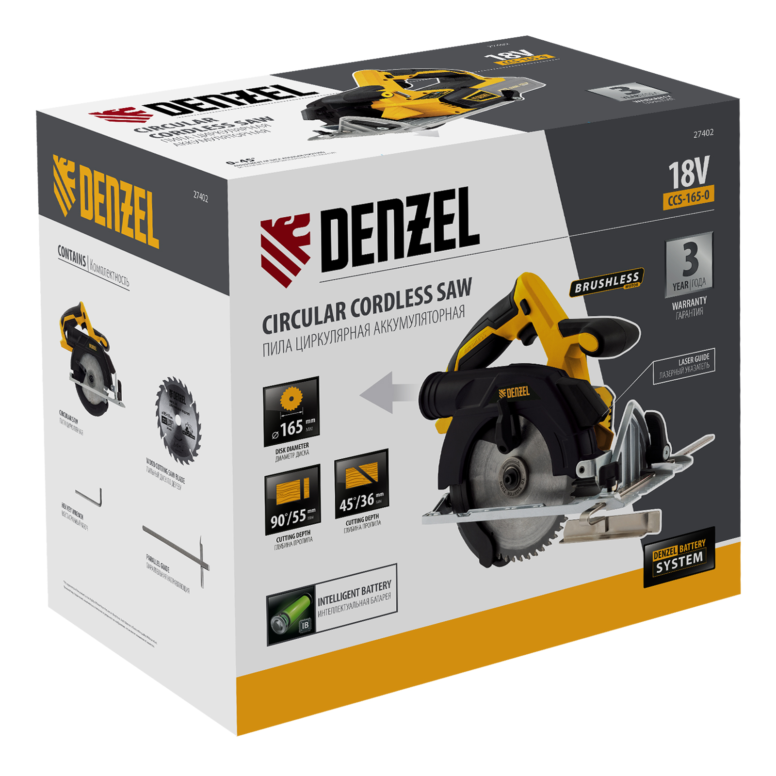 Аккумуляторная циркулярная пила Denzel CCS-165-0 27402 с бесщеточным двигателем работает от батареи Li-Ion с рабочим напряжением 18 В. Используется для распила листовых материалов из древесины при помощи пильных дисков диаметром 165 мм. Максимальная глубина пропила под углом 90° составляет 50 мм, под углом 45° — 35 мм. Бесщеточный двигатель обеспечивает скорость вращения оснастки до 4200 об/мин, что позволяет эффективно решать поставленные задачи.