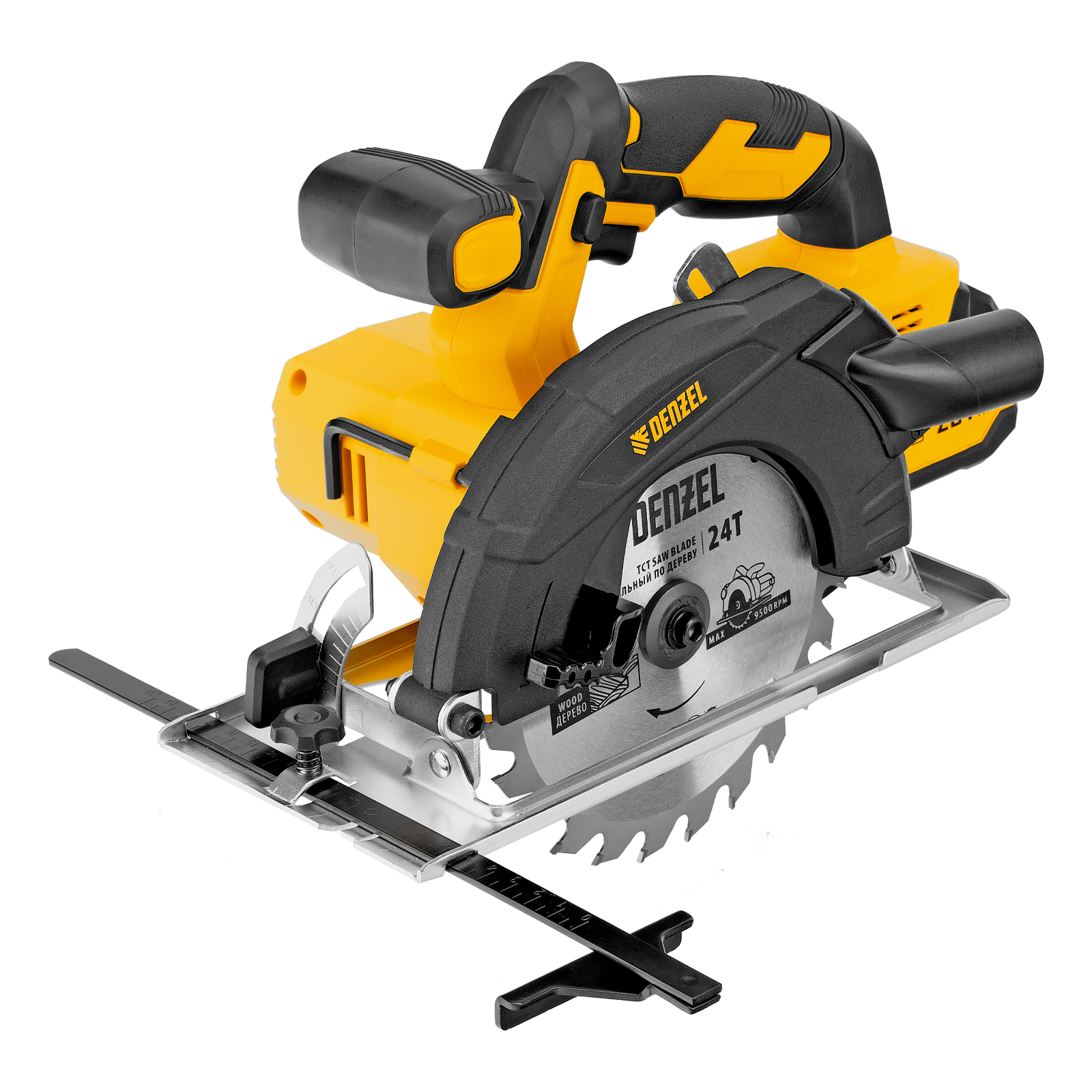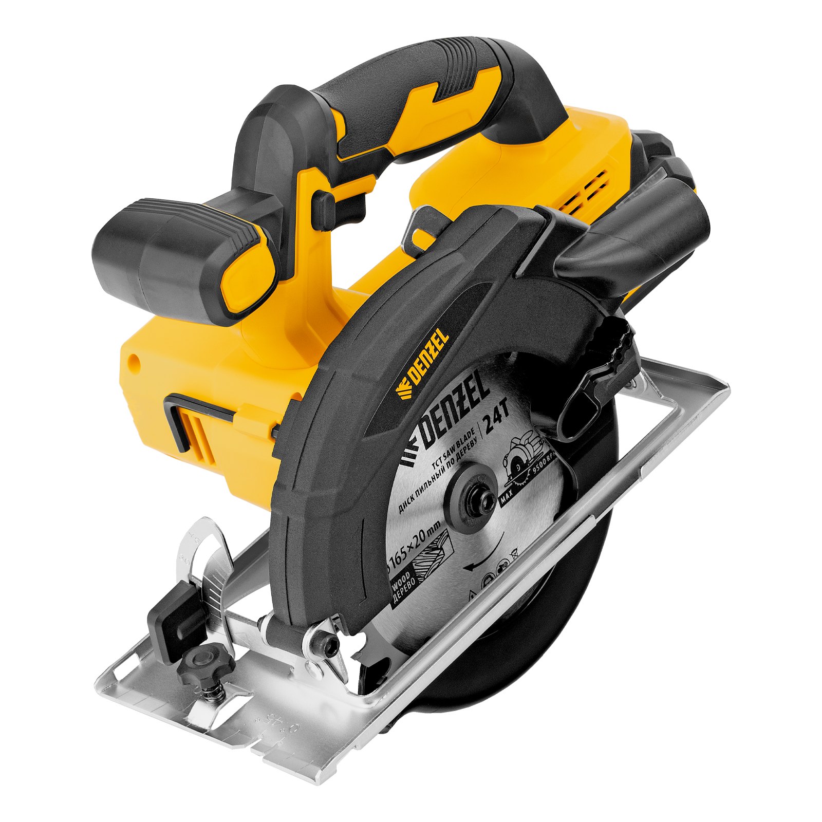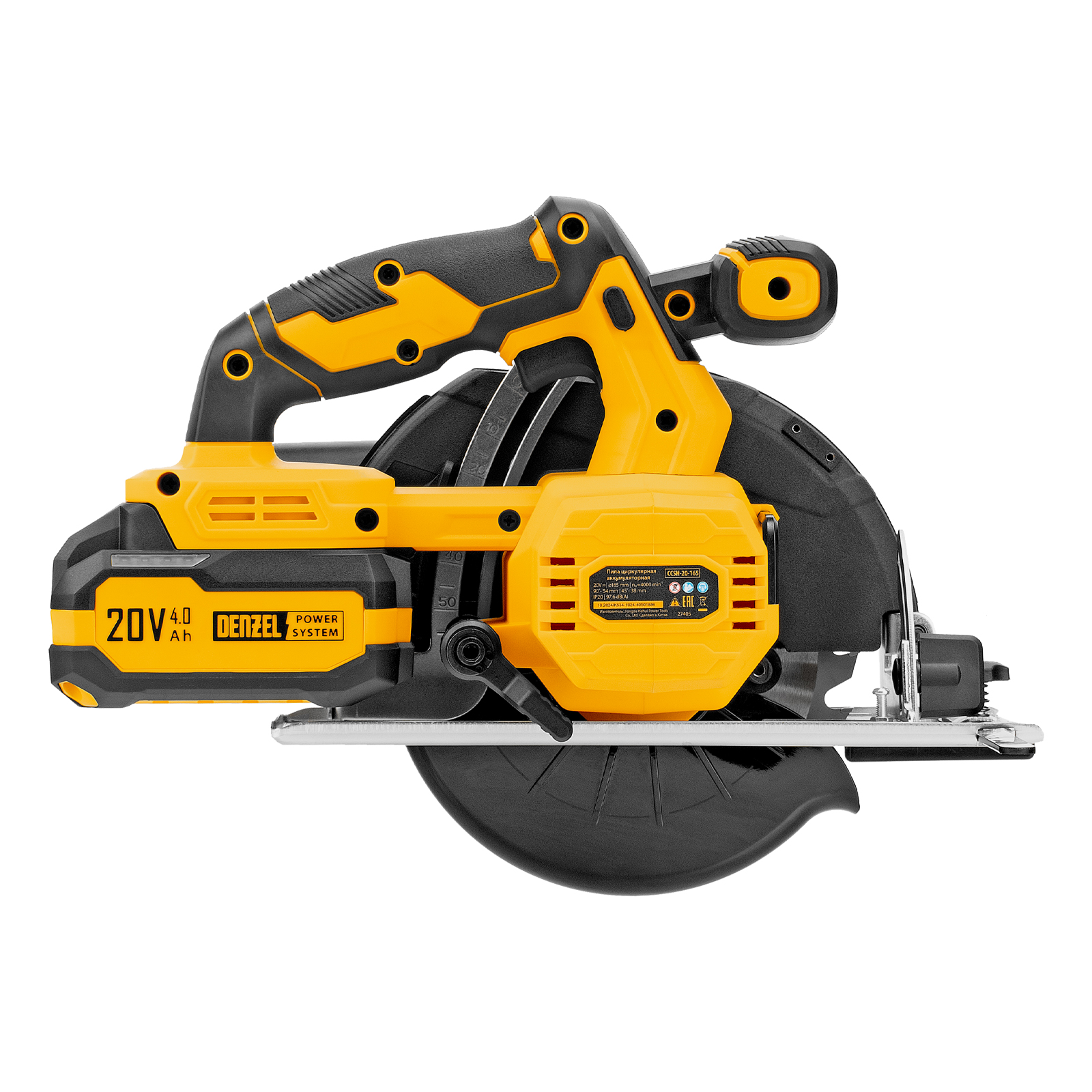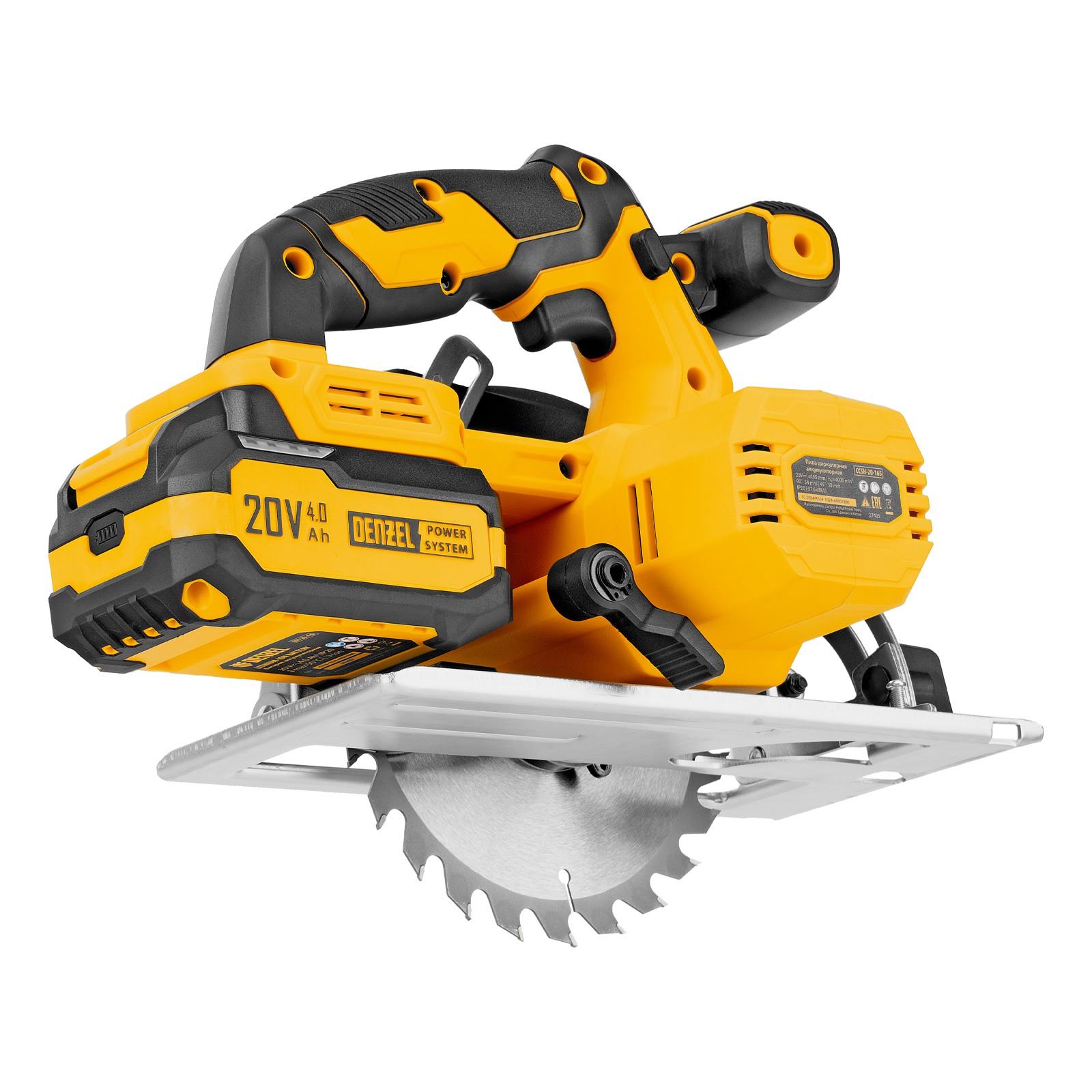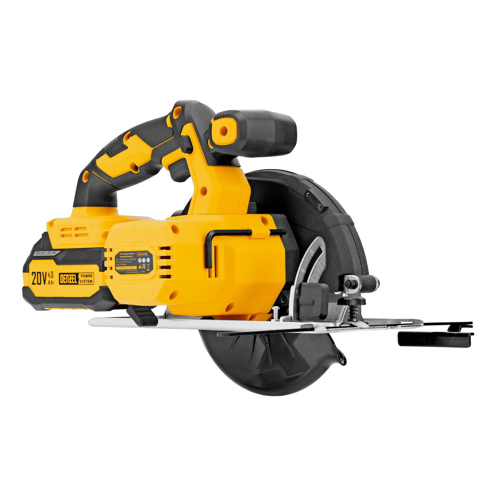 Циркулярная аккумуляторная пила Denzel CCSH-20-165 27405 работает от источника питания Li-Ion 20 В и совместима с пильными дисками диаметром 165 мм. Предназначена для прямого и поперечного реза древесины, также подходит для работы с алюминиевыми заготовками (при использовании соответствующей оснастки). Частота вращения шпинделя составляет 4000 об/мин, что позволяет эффективно решать поставленные задачи. Глубина пропила регулируется и достигает 54 мм под углом 90° и 38 мм под углом 45°. Инструмент оптимален для бытового применения.