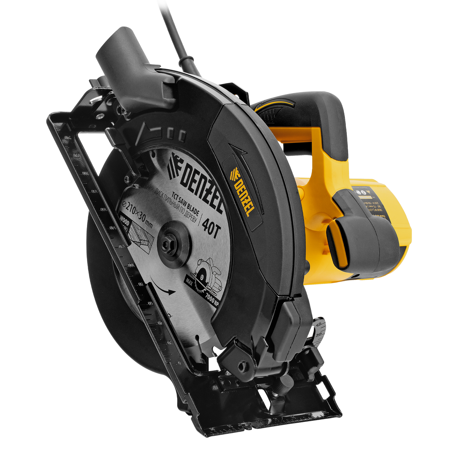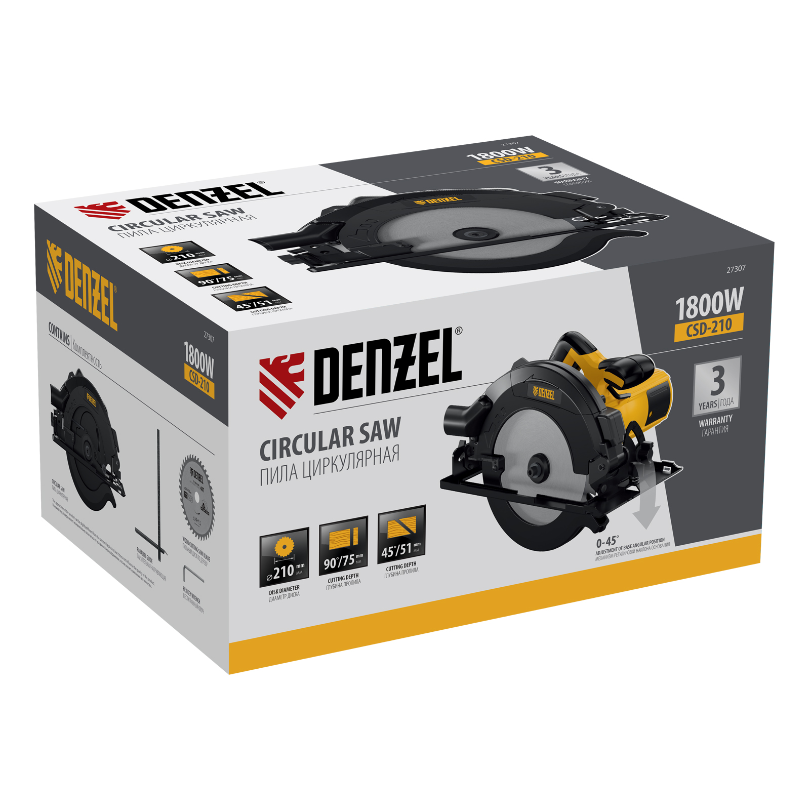 Циркулярная пила Denzel CSD-210 27307 мощностью 1800 Вт используется для продольного и поперечного распиливания древесины. Совместима с пильными дисками диаметром 210 мм. Шарнирное крепление режущего узла позволяет регулировать глубину пропила, а также угол наклона в диапазоне 0-45°. Максимальная глубина пропила под углом 90° составляет 75 мм, под углом 45° — 51 мм, быстрая регулировка глубины пропила повышает эффективность работы. Пила оптимальна для бытового использования.