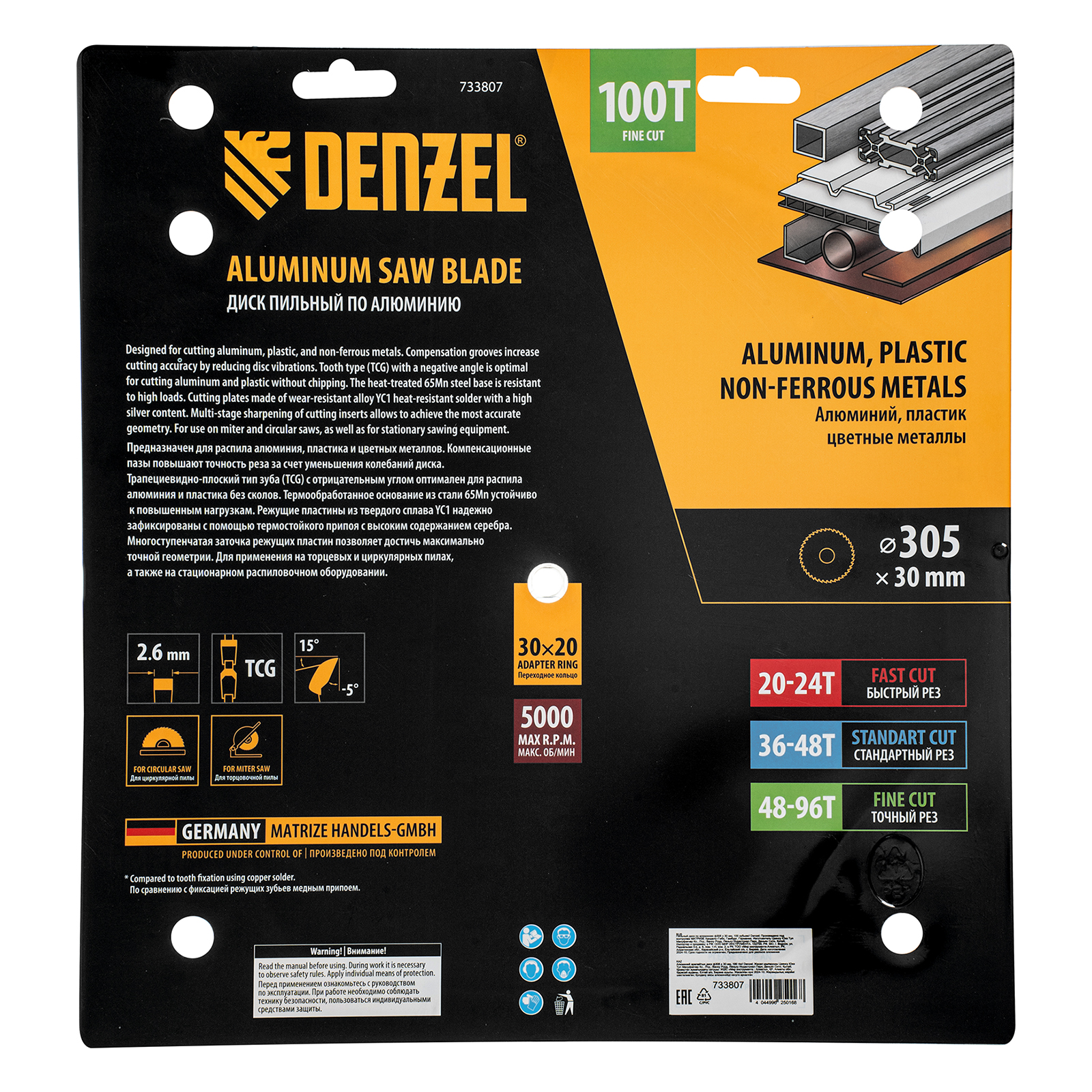 Пильный диск Denzel 733807 диаметром 305 x 30 мм, с 100 зубьями, предназначен для точного распиливания заготовок из алюминия, пластика, цветных металлов. Устанавливается на циркулярную или торцовочную пилу, также возможно использование с распиловочным станком. Зубья трапециевидно-плоского типа (TCG) с отрицательным углом заточки обеспечивают ровный рез без сколов. В комплект поставки входит переходное кольцо 30/20 мм, позволяющее изменить посадочный диаметр при необходимости.