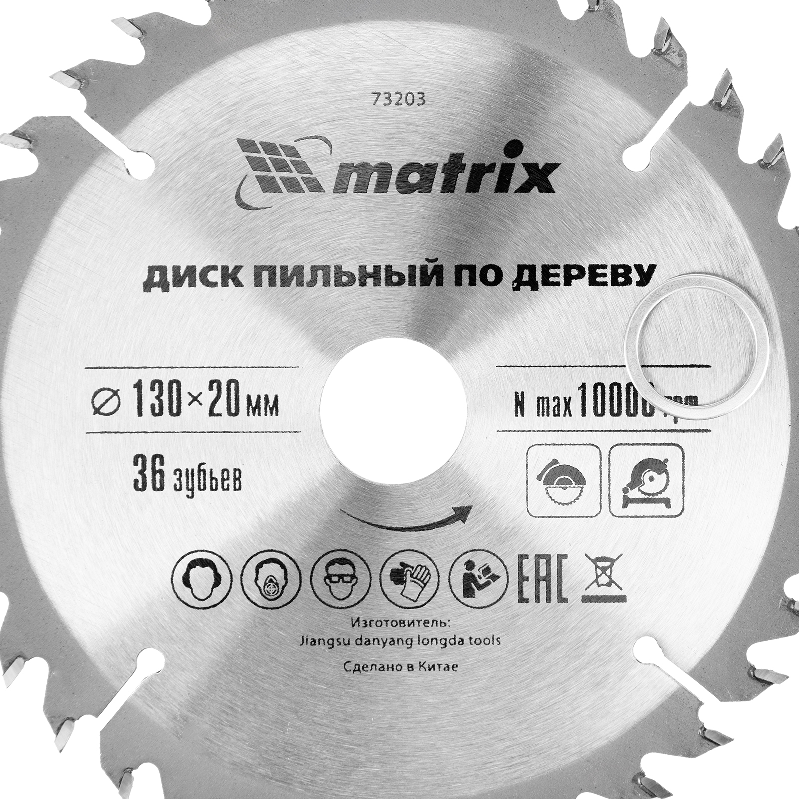 Пильный диск по дереву Matrix 73203 диаметром 130 х 20 мм, с 36 зубьями и переходным кольцом 20/16, — оснастка для циркулярных и торцовочных пил с соответствующим посадочным и внешним диаметром. Используется для продольного/поперечного реза материалов из мягкой и твердой древесины, ДСП, ДВП, фанеры, столярных плит. В комплект поставки входит переходное кольцо 20/16, позволяющее самостоятельно изменить посадочный диаметр при необходимости. Диск подходит для бытового и профессионального применения.