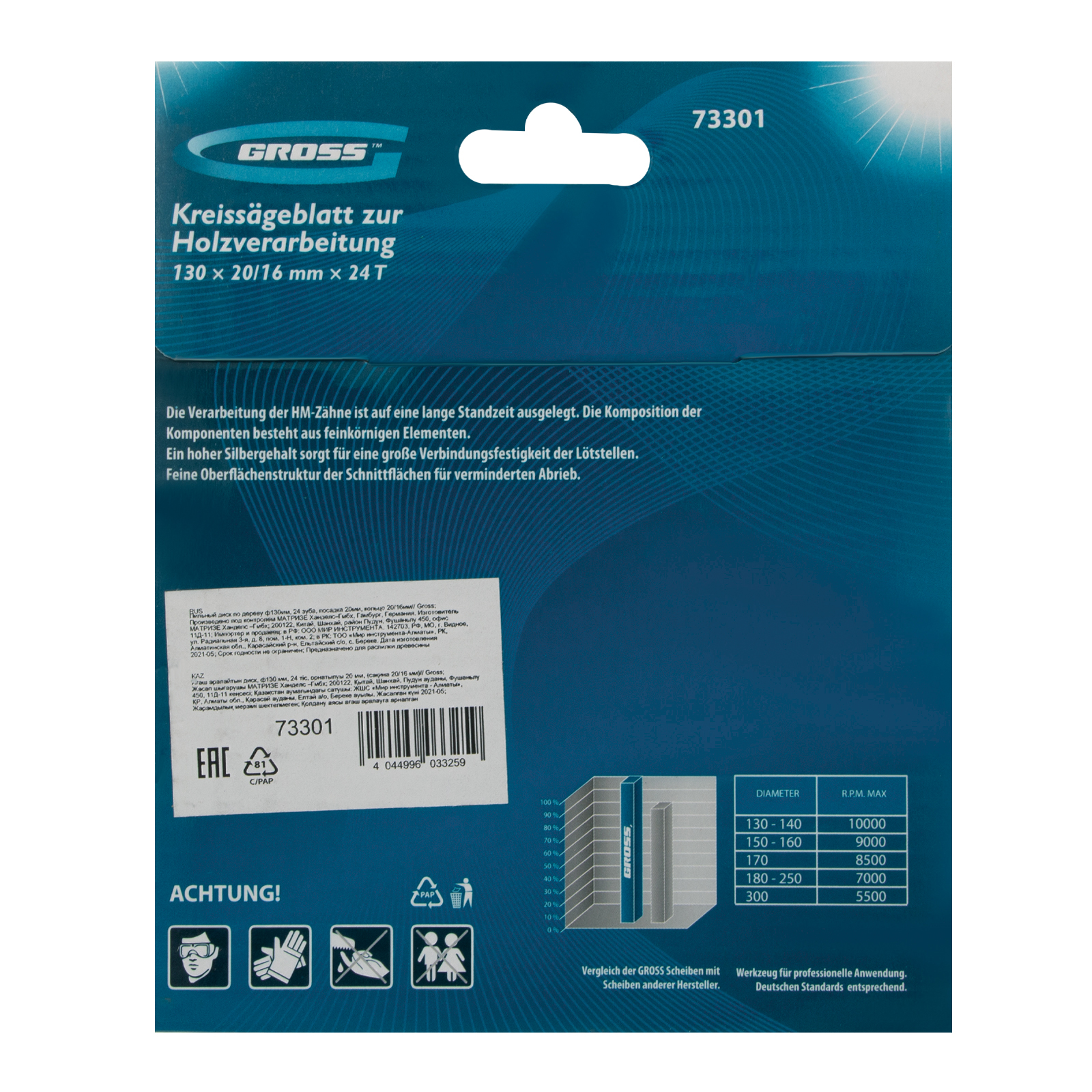 Пильный диск Gross 73301, ф130 х 20 мм, с 24 зубьями и переходным кольцом 20/16 мм, предназначен для распила древесины мягких и твердых пород, ДСП, МДФ и фанеры. Является оснасткой для циркулярных и торцовочных пил с посадочным диаметром 20 мм, благодаря универсальному типу зубьев АТВ подходит как для продольного, так и для поперечного реза материалов. Диск изготовлен на высококачественном оборудовании, специально рассчитан на профессиональное применение и выполнение большого объема работ.