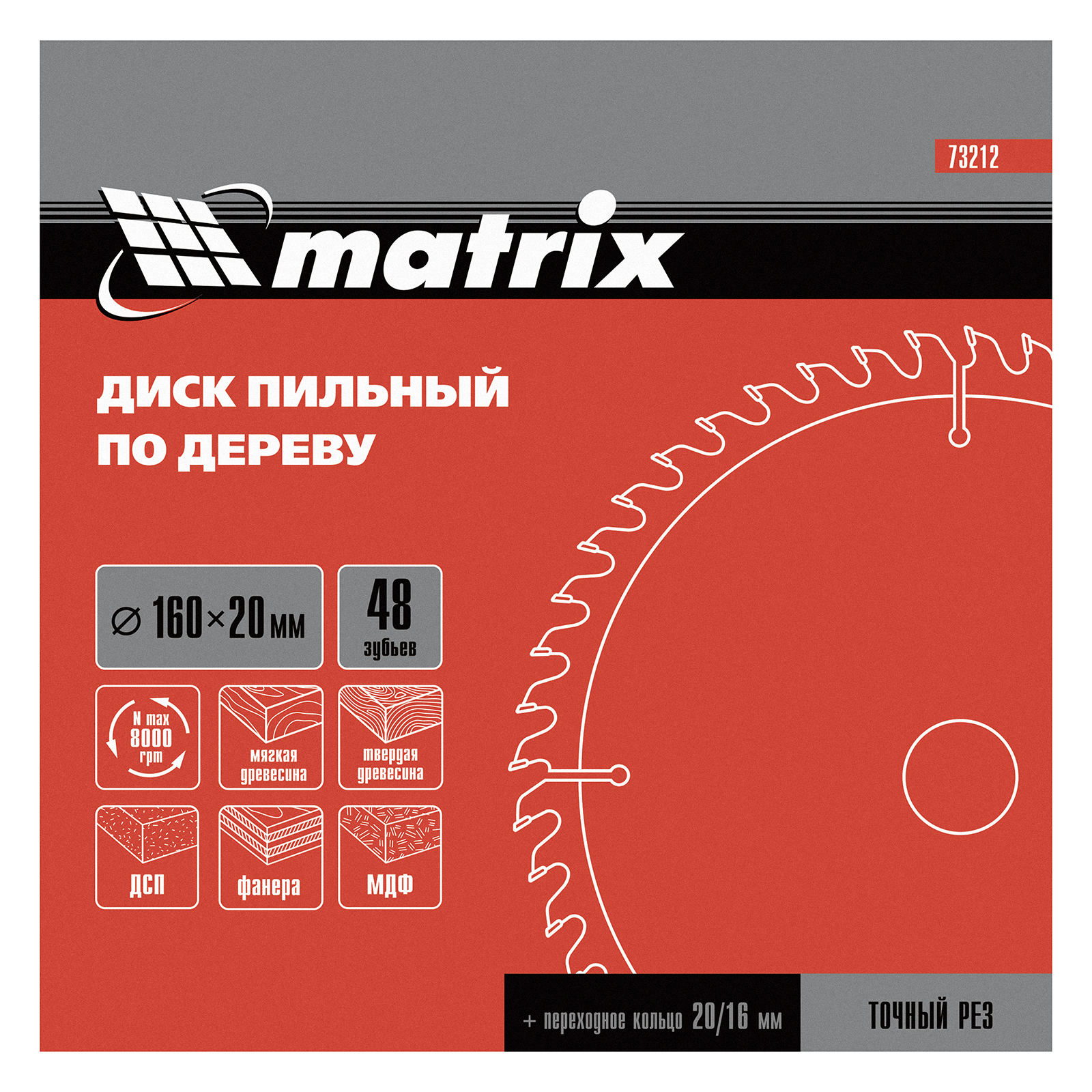 Пильный диск по дереву Matrix 73212 диаметром 160 х 20 мм, с 48 зубьями и переходным кольцом 20/16, — оснастка для циркулярных и торцовочных пил с соответствующим посадочным и внешним диаметром. Используется преимущественно для поперечного реза материалов из мягкой и твердой древесины, ДСП, ДВП, фанеры, столярных плит. В комплект поставки входит переходное кольцо 20/16, позволяющее самостоятельно изменить посадочный диаметр при необходимости. Диск подходит для бытового и профессионального применения.