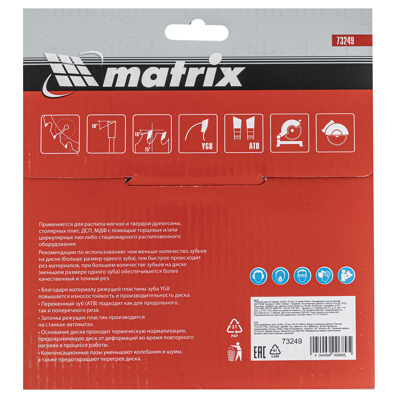 Пильный диск по дереву Matrix 73249 диаметром 160 х 32 мм, с 24 зубьями, — оснастка для циркулярных и торцовочных пил с соответствующим посадочным и внешним диаметром. Используется для продольного/поперечного реза материалов из мягкой и твердой древесины, ДСП, ДВП, фанеры, столярных плит. Диск подходит для бытового и профессионального применения.