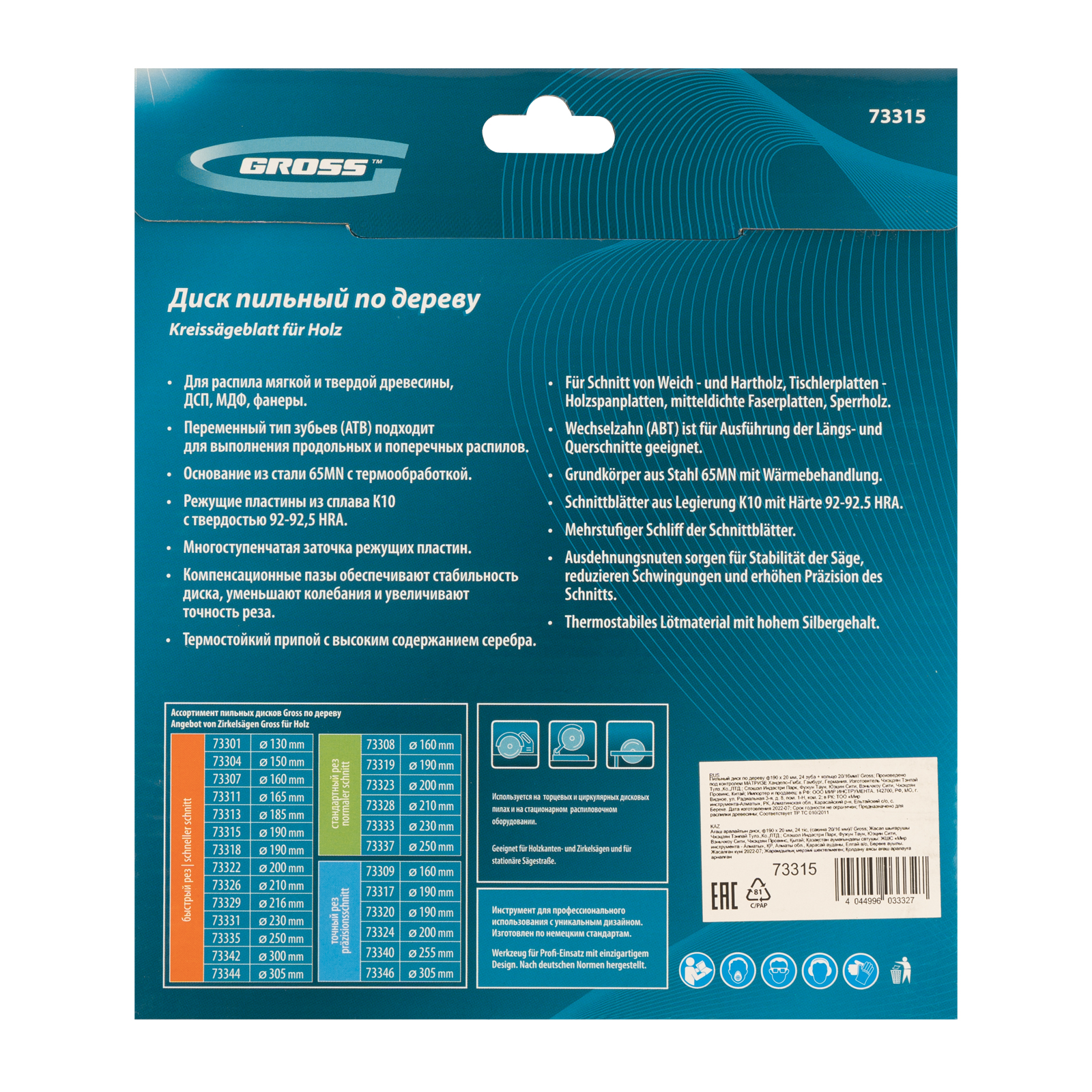 Пильный диск Gross 73315, ф190 х 20 мм, с 24 зубьями и переходным кольцом 20/16 мм, предназначен для распила древесины мягких и твердых пород, ДСП, МДФ и фанеры. Является оснасткой для циркулярных и торцовочных пил с посадочным диаметром 20 мм, благодаря универсальному типу зубьев АТВ подходит как для продольного, так и для поперечного реза материалов. Диск изготовлен на высококачественном оборудовании, специально рассчитан на профессиональное применение и выполнение большого объема работ.