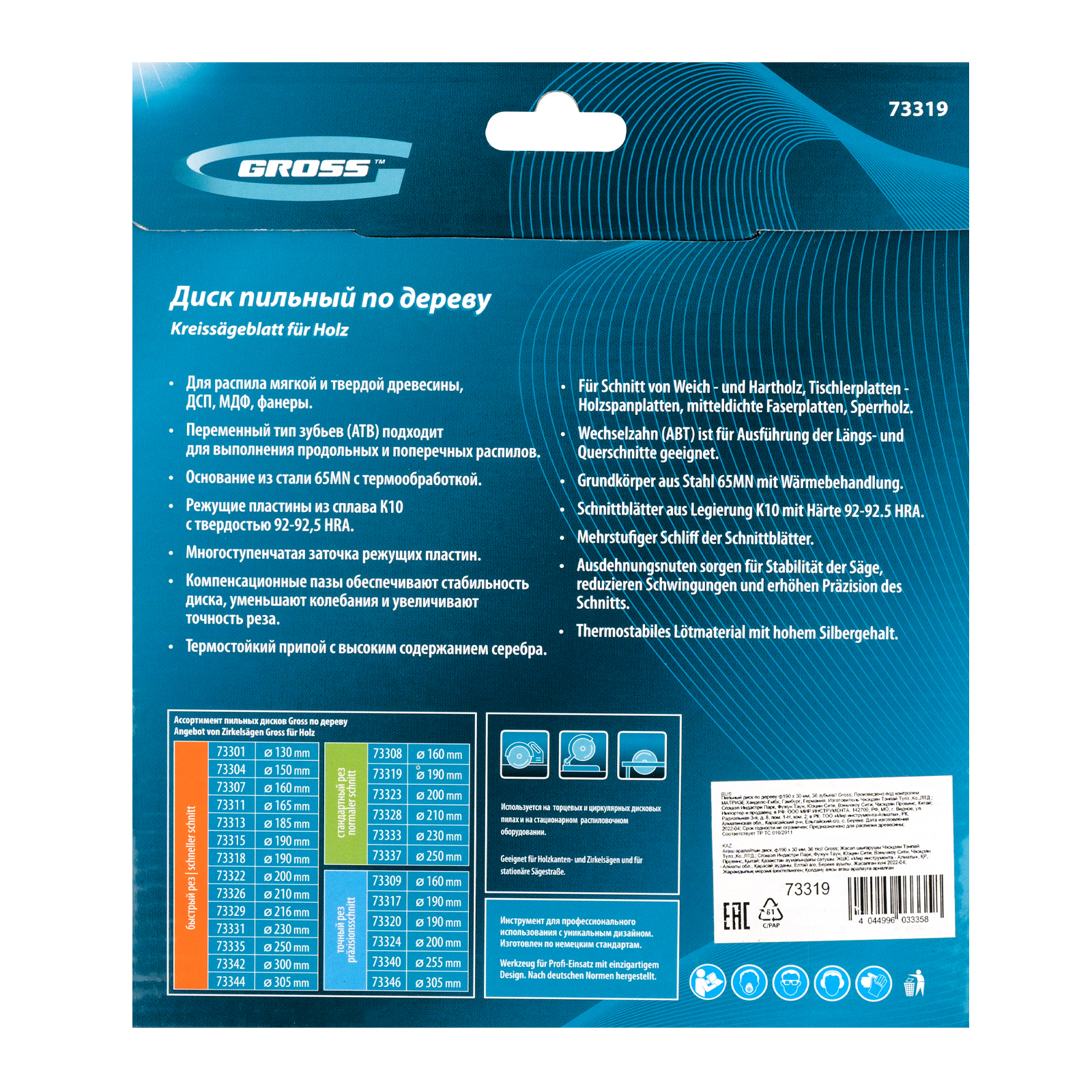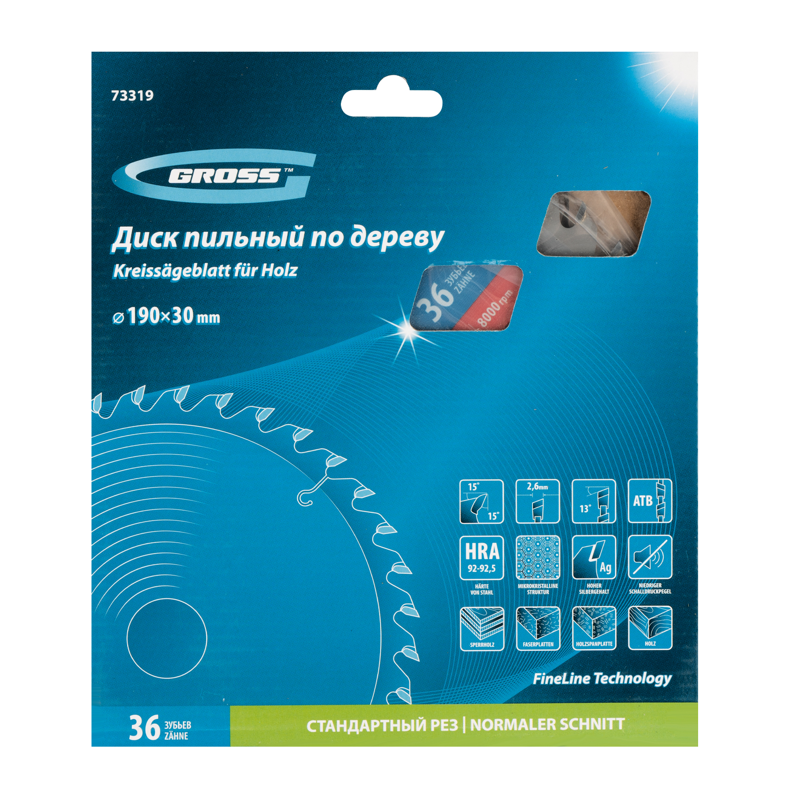 Пильный диск Gross 73319, ф190 х 30 мм, с 36 зубьями, предназначен для распила древесины мягких и твердых пород, ДСП, МДФ и фанеры. Является оснасткой для циркулярных и торцовочных пил с посадочным диаметром 20 мм, благодаря универсальному типу зубьев АТВ подходит как для продольного, так и для поперечного реза материалов. Диск изготовлен на высококачественном оборудовании, специально рассчитан на профессиональное применение и выполнение большого объема работ.