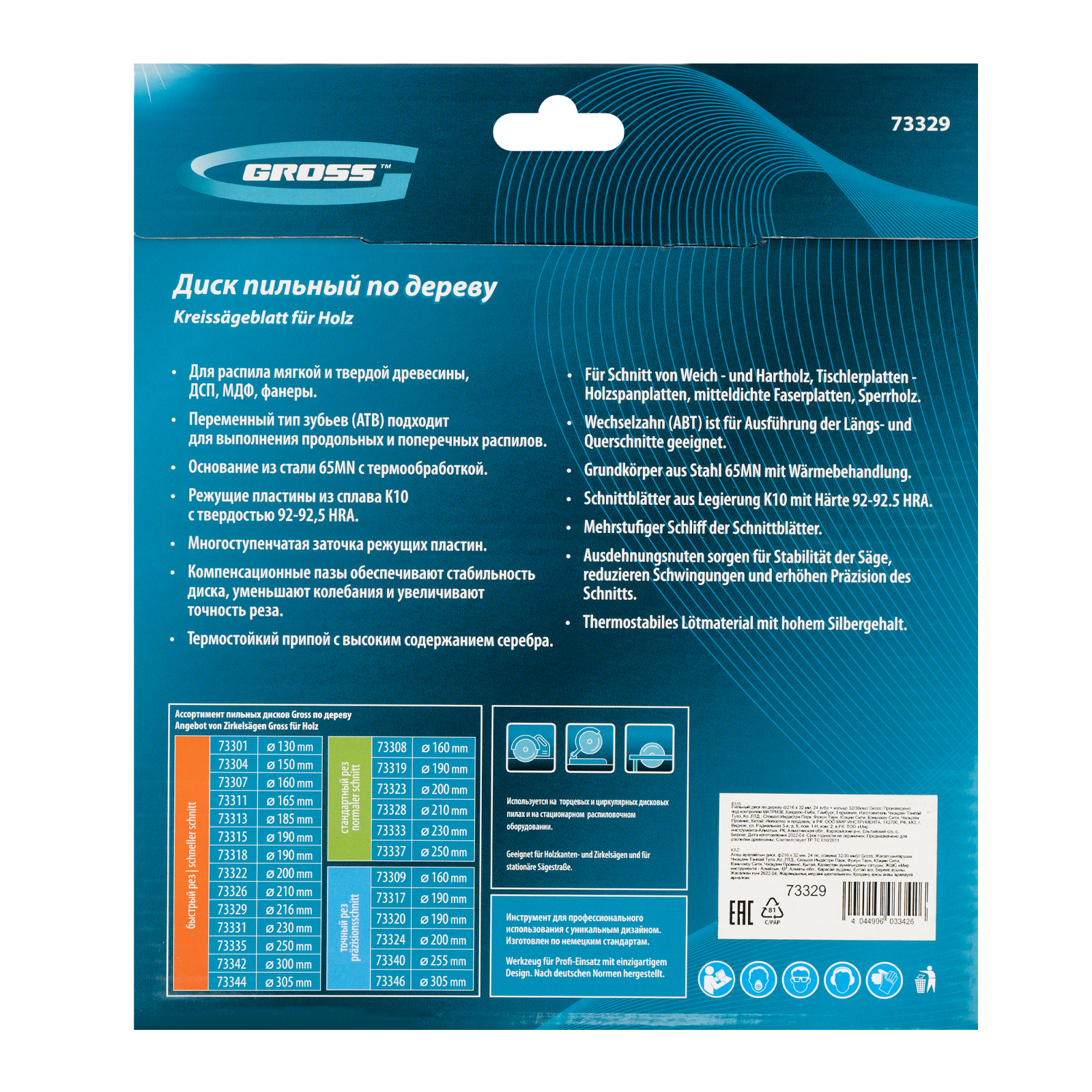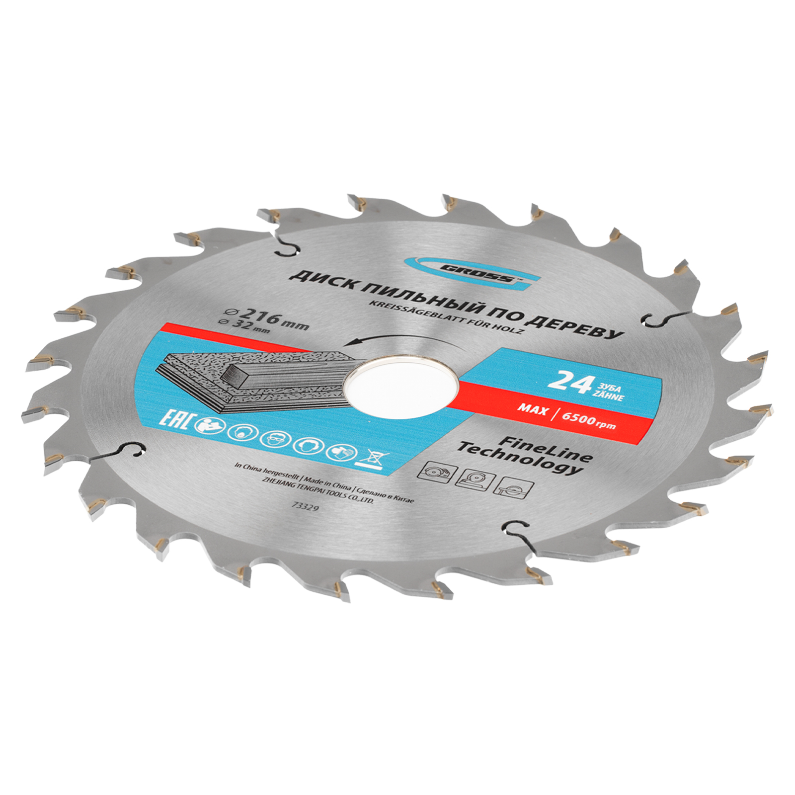 Пильный диск Gross 73329 диаметром 216 х 32 мм, с 24 зубьями и переходным кольцом 32/30 мм, предназначен для распила древесины мягких и твердых пород, ДСП, МДФ и фанеры. Используется в качестве оснастки для циркулярных и торцовочных пил с посадочным диаметром 32 мм, благодаря универсальному типу зубьев АТВ подходит как для продольного, так и для поперечного реза материалов. Диск изготовлен на высококачественном оборудовании, специально рассчитан на профессиональное применение и выполнение большого объема работ.