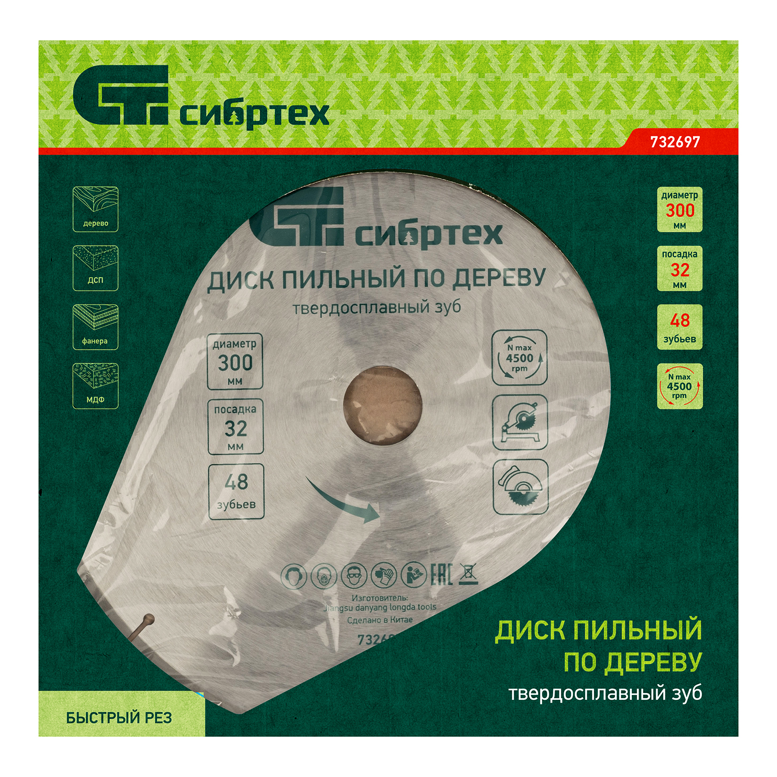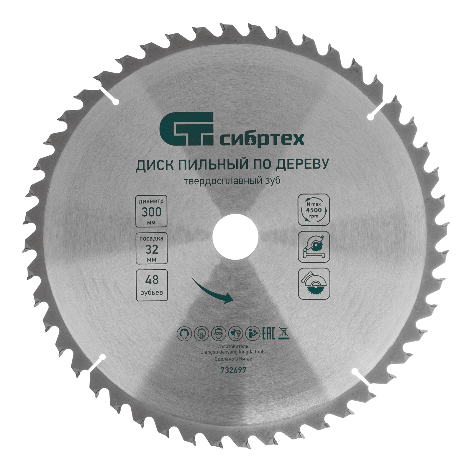 <p>Пильный диск Сибртех 732697 диаметром 300 х 32 мм, с 48 зубьями, используется с торцовочными и циркулярными пилами, а также с распиловочными станками. Предназначен преимущественно для поперечного пиления древесины мягких и твердых пород, фанеры, МДФ и ДСП. Благодаря мелким зубьям достигается высокая скорость реза. Диск применяется для выполнения строительных, ремонтных работ, а также для решения бытовых задач.</p><h2>Преимущества</h2><ul><li>Высокий ресурс — режущие пластины из твердого сплава YG8 долго держат заточку.</li><li>Надежность — основа диска изготовлена из устойчивой к нагрузкам стали 50, твердосплавные напайки крепко держатся на зубцах благодаря качественному медному припою.</li><li>Стабильно качественный рез — диск пилит быстро и ровно за счет попеременной заточки зубьев, компенсационные пазы защищают диск от деформации в результате нагрева, предотвращая его заклинивание.</li></ul>