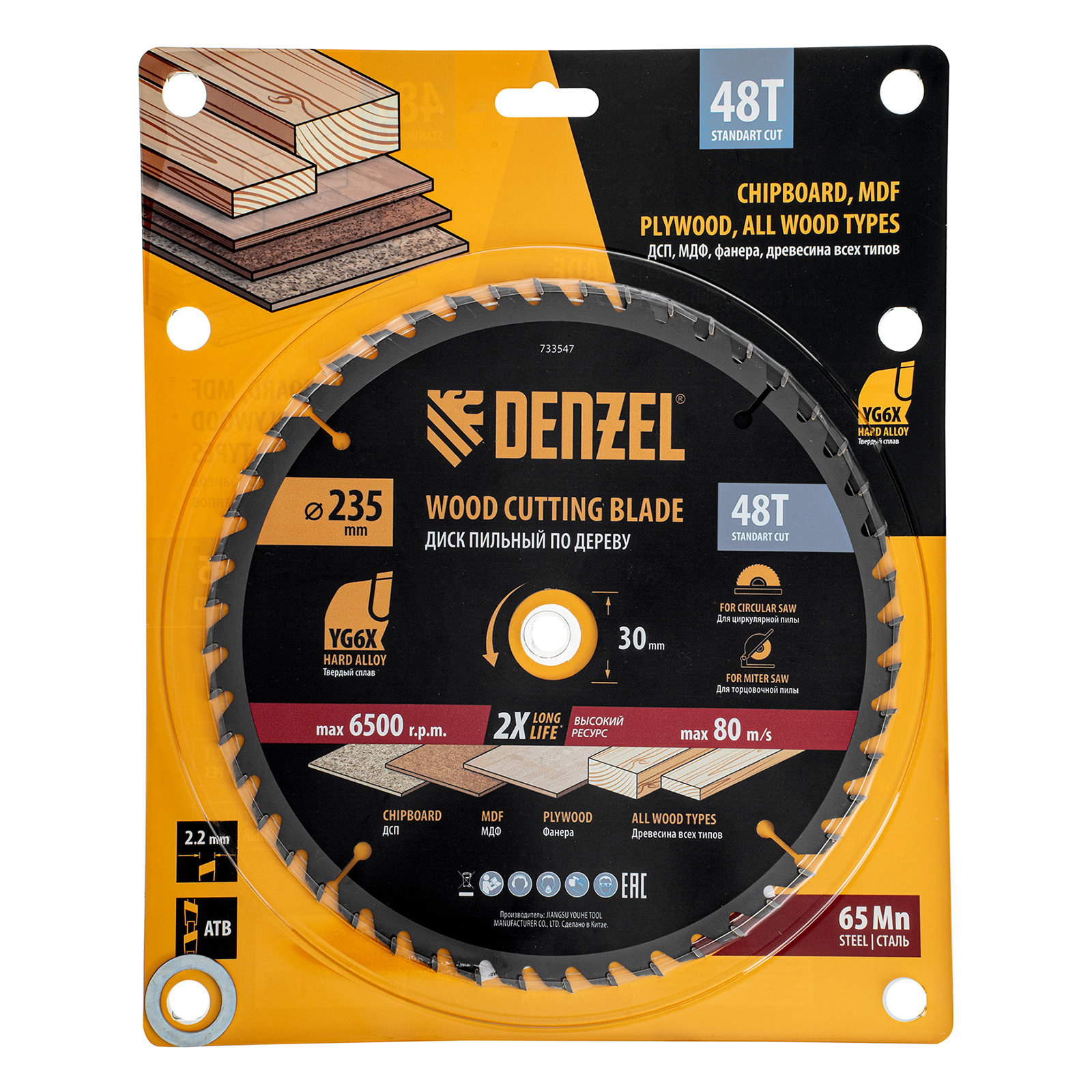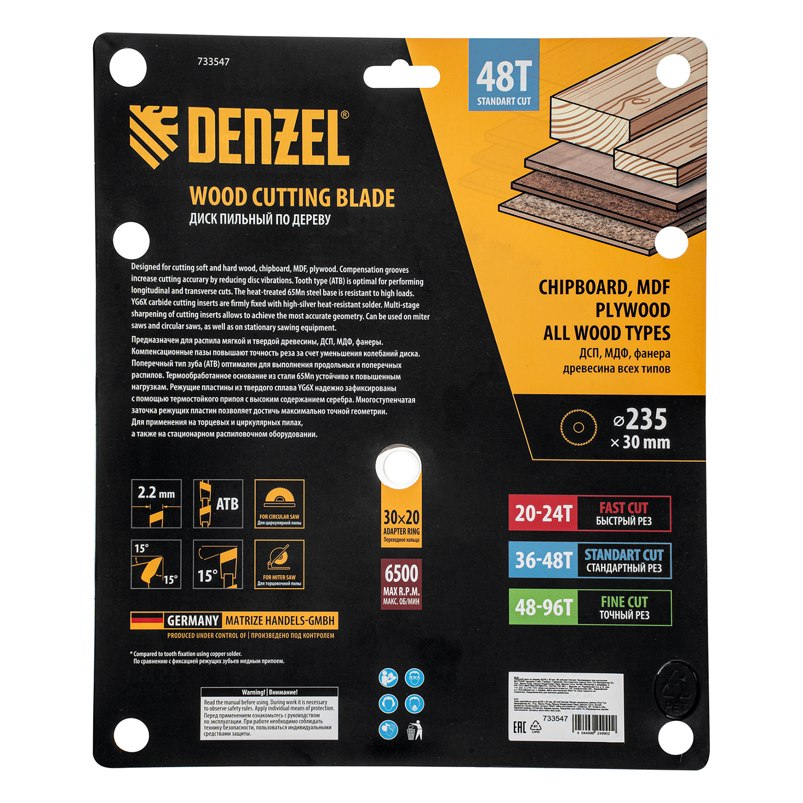 Пильный диск Denzel 733547 диаметром 235 x 30 мм, с 48 зубьями, предназначен для продольного и поперечного распила твердой и мягкой древесины, фанеры, МДФ, ДСП. 48 зубьев типа ATB с режущими пластинами оптимальной геометрии обеспечивают качественный рез. Тип реза — стандартный. Режущие пластины из твердого сплава YG6X сохраняют рабочие свойства при интенсивном использовании. Диск устанавливается на циркулярную, торцовочную пилу или на распиловочный станок. В комплект поставки входит переходное кольцо с 30 на 20 мм, что позволяет изменить посадочный размер и расширяет возможности использования диска.